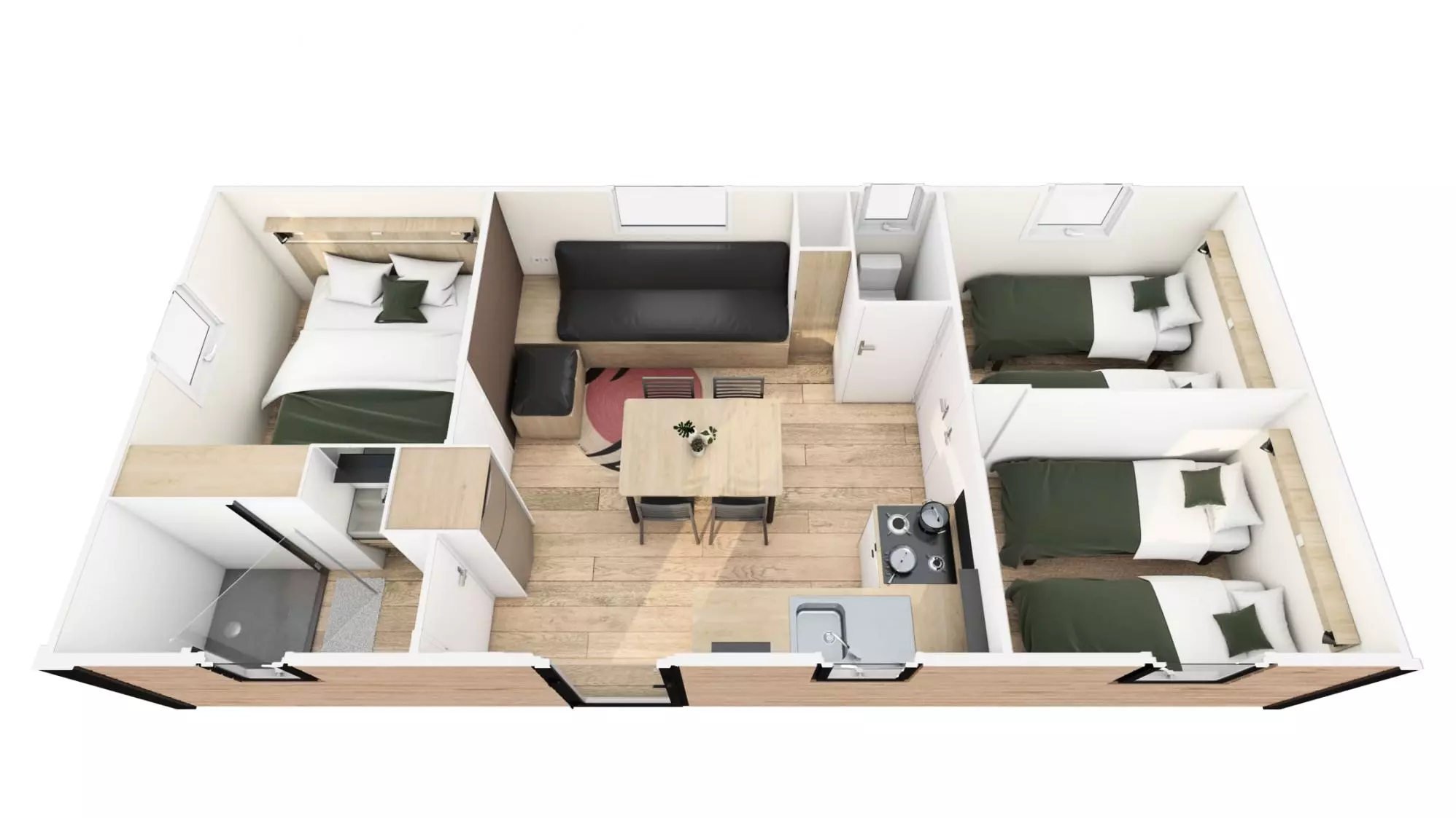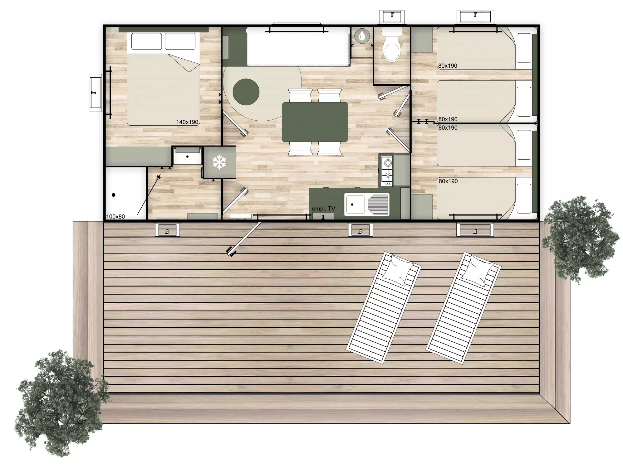 Certains de nos 2 chambres ont 1 chambre (lit double) + 1 chambre (3 lits simples), pour ce type de mobil-home, merci de nous contacter à info@camping-pyrenees-natura.com