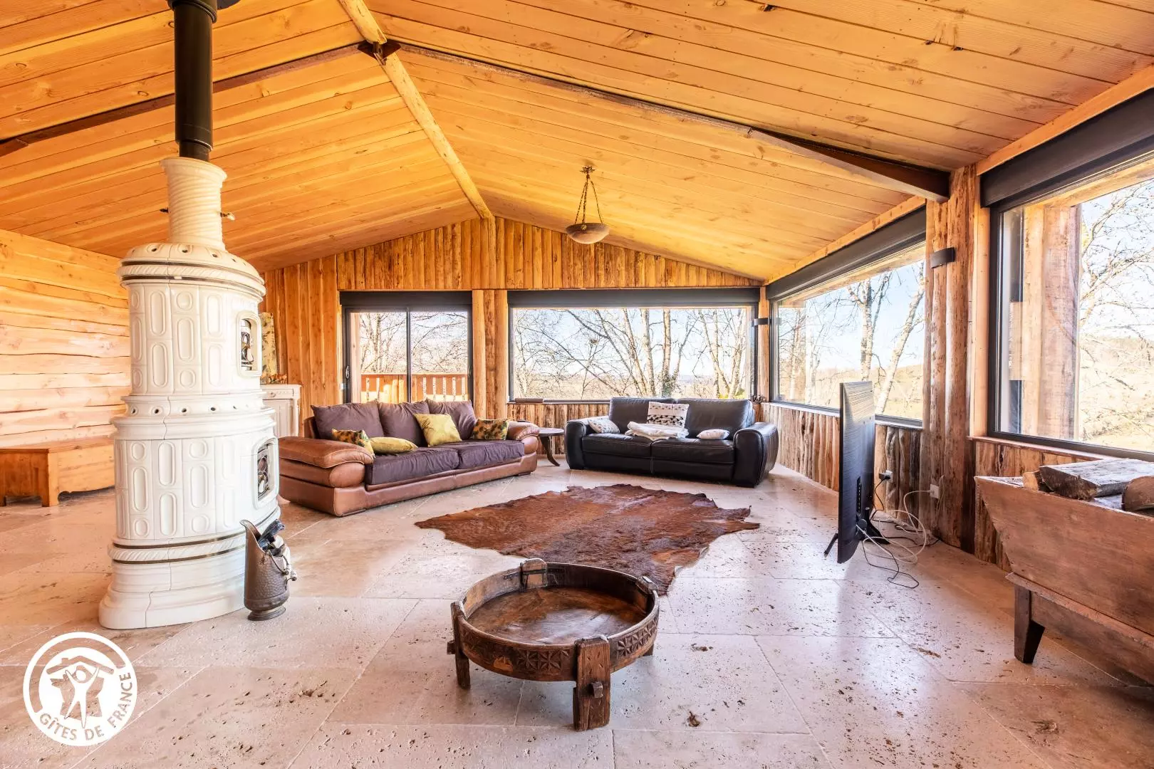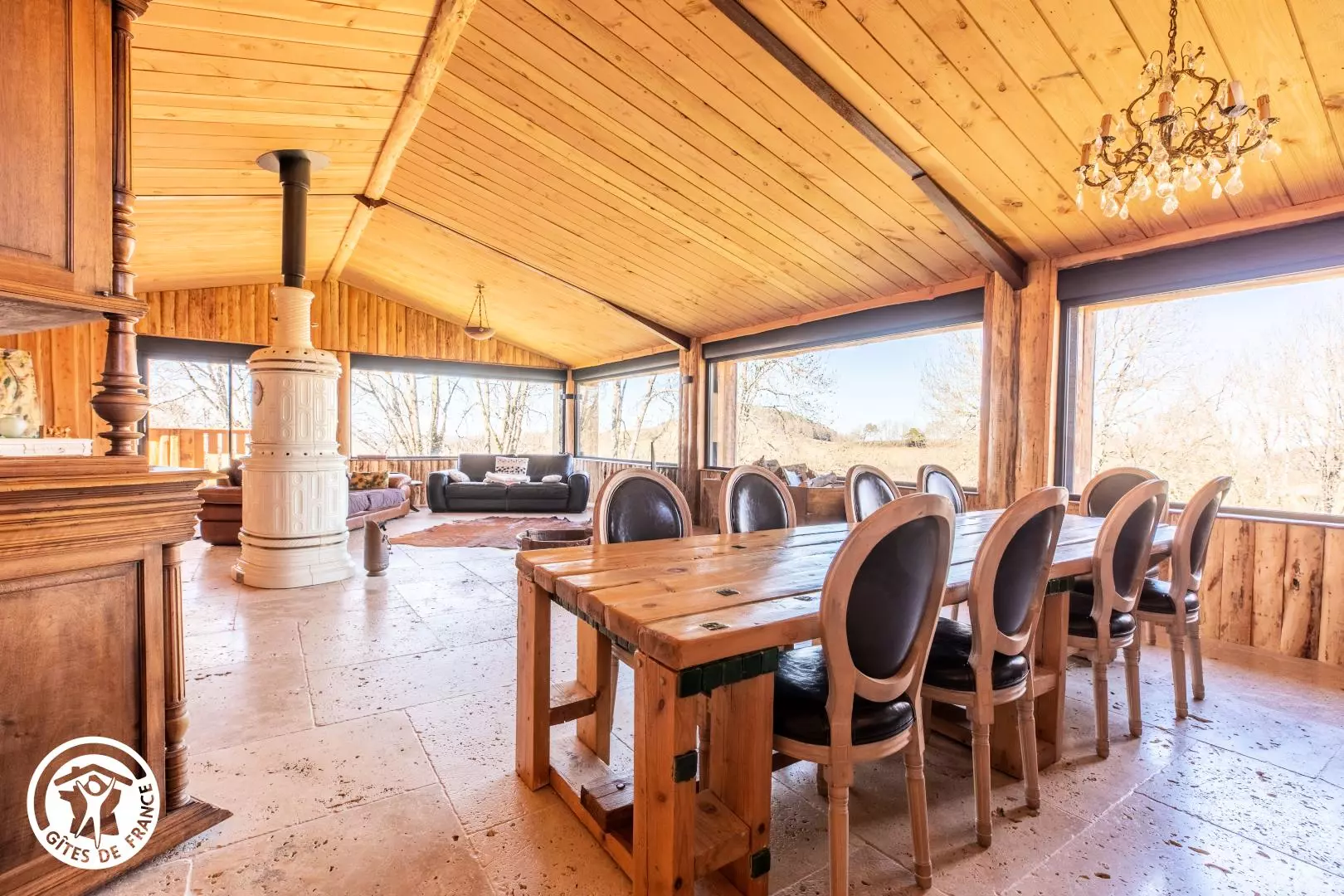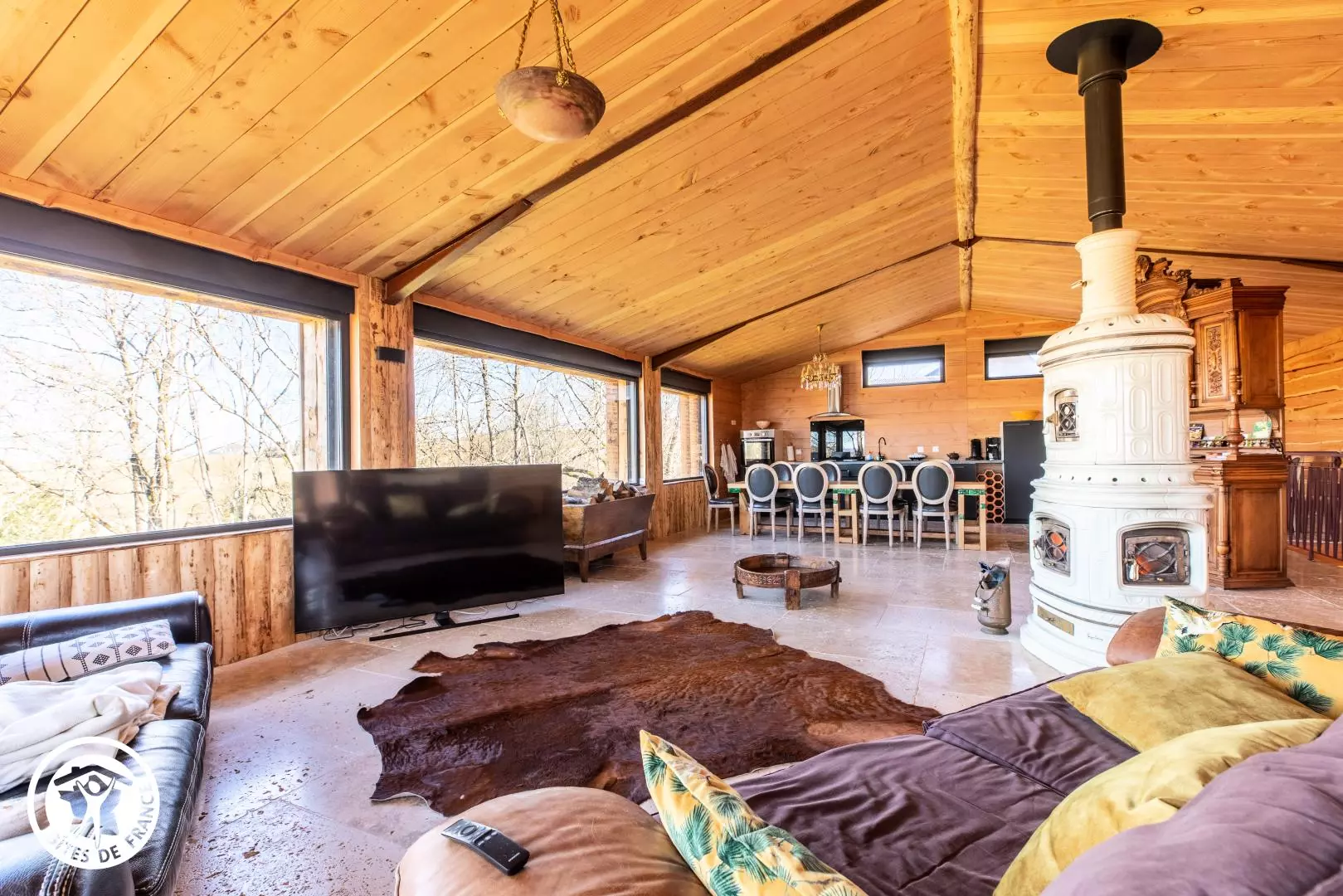 Au premier une très grande pièce à vivre baignée de lumière avec ses grandes baies vitrées dominant la vallée sans vis à vis.