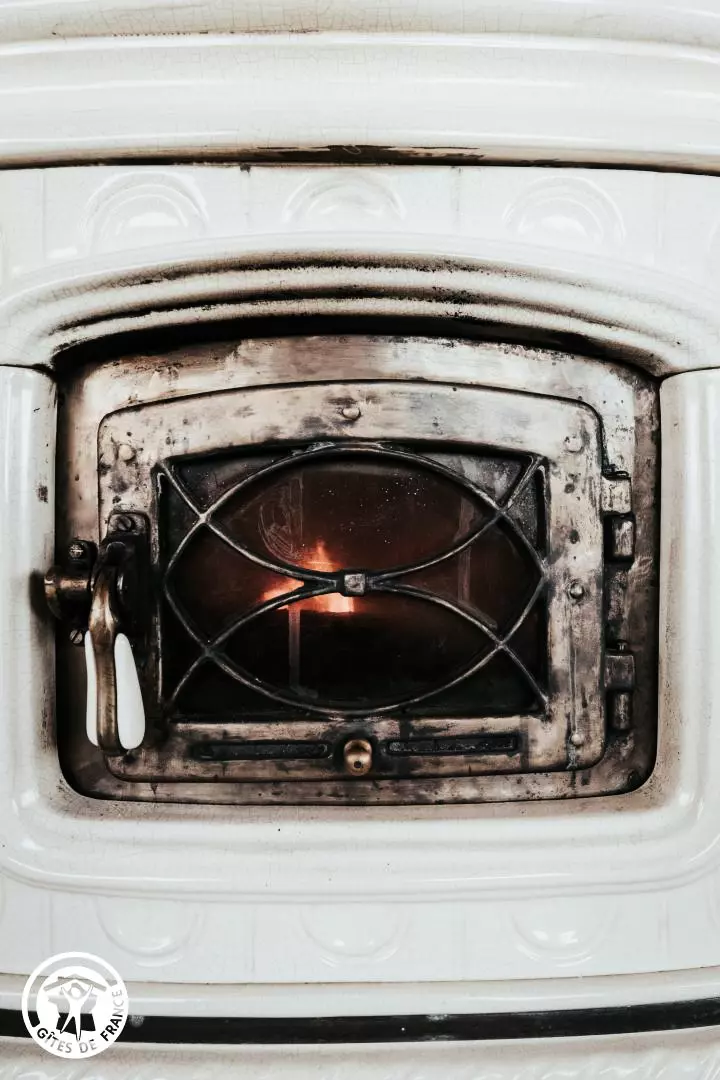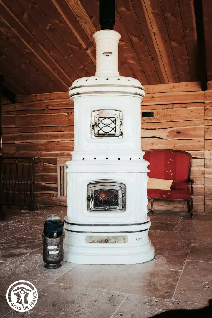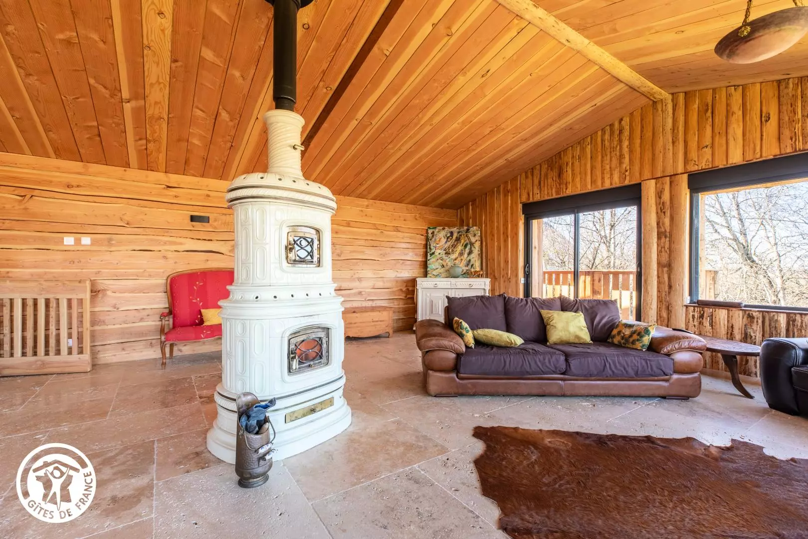 Cuisine ouverte et espace salon comprenant un très grand poêle à bois en céramique, une télévision très grand écran.