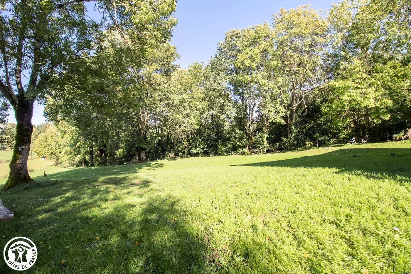 Grand jardin de 2200m² donnant sur les champs avec salon de détente, table de jardin et barbecue. Jardin clos. Local pour entreposer ski, vélo, moto ...WIFI.