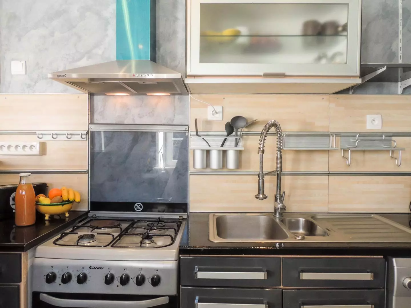 -d'une cuisine ouverte sur le séjour avec poêle à bois