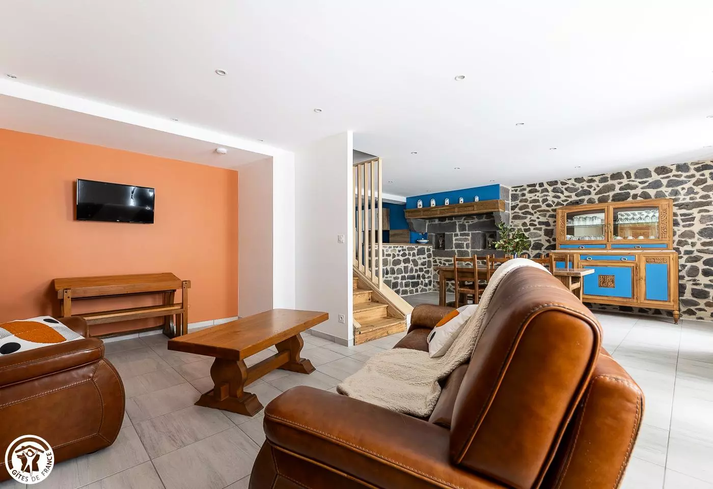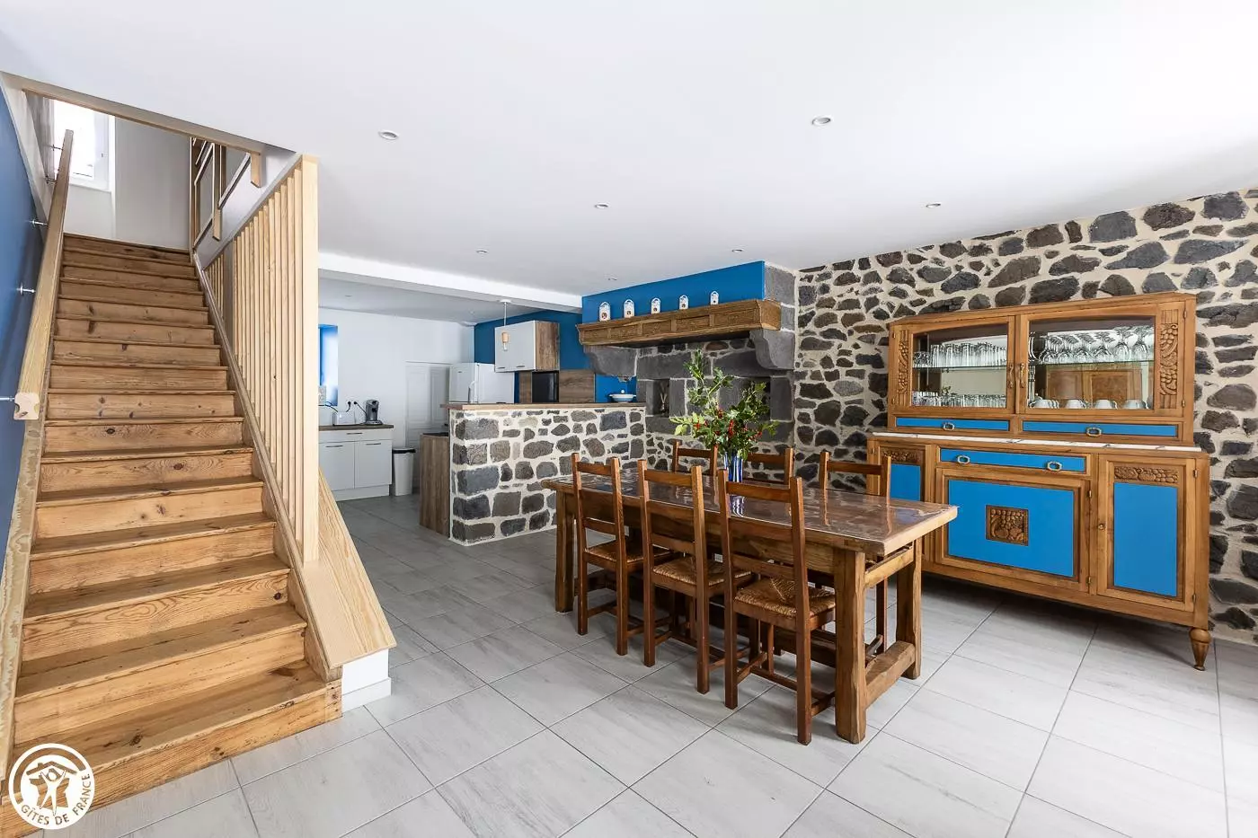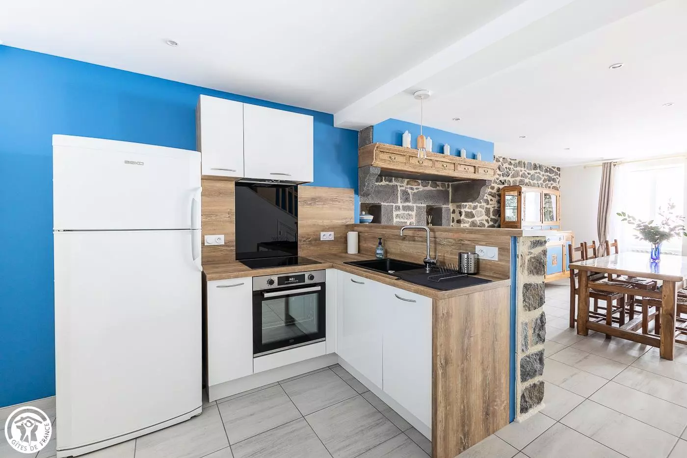 Le petit plus : gîte à la ferme (mitoyen à la maison des propriétaires – dans l'exploitation agricole) pour découvrir les joies de la vie au grand air ! Les propriétaires, éleveurs et producteurs de « Fourme de Rochefort » seront ravis de partager leur métier passion ! Ce sera également avec plaisir qu'ils vous feront découvrir leur région . Le gîte est un joli mélange de beaux matériaux et de couleurs chatoyantes. C'est un parfait trait d'union entre l'authenticité du passé avec la poutre de cheminée en bois massif merveilleusement travaillée et le confort d'aujourd'hui avec une cuisine intégrée hyper équipée, un salon cocooning et deux salles d'eau flambantes neuves ! Le gîte se compose au rez-de-chaussée :