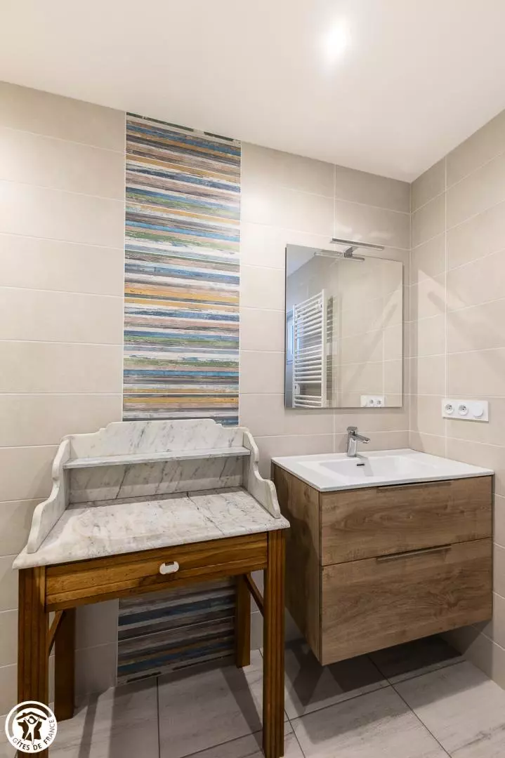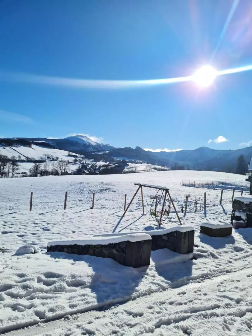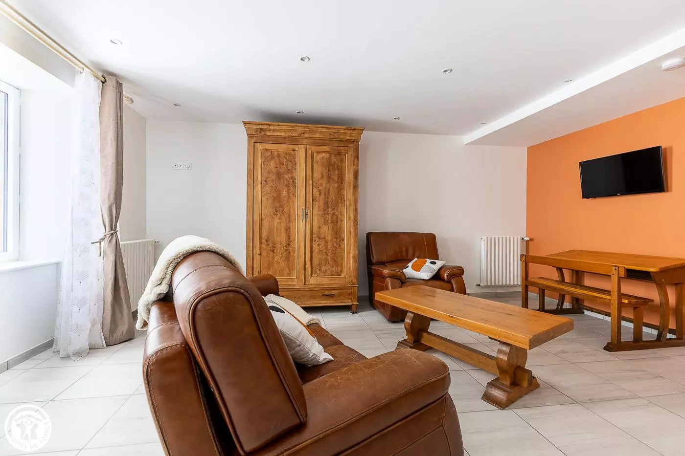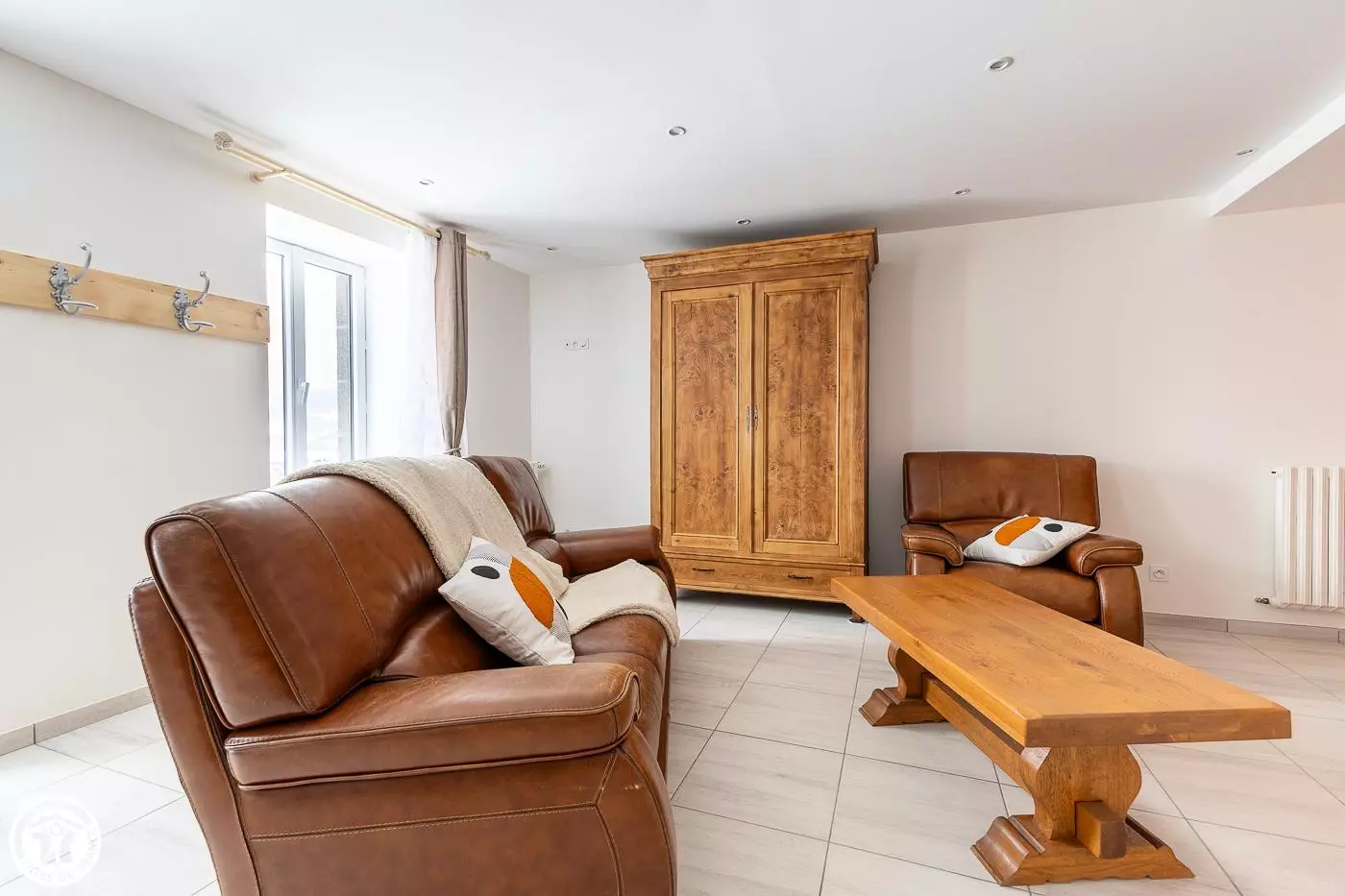 Le petit plus : gîte à la ferme (mitoyen à la maison des propriétaires – dans l'exploitation agricole) pour découvrir les joies de la vie au grand air ! Les propriétaires, éleveurs et producteurs de « Fourme de Rochefort » seront ravis de partager leur métier passion ! Ce sera également avec plaisir qu'ils vous feront découvrir leur région . Le gîte est un joli mélange de beaux matériaux et de couleurs chatoyantes. C'est un parfait trait d'union entre l'authenticité du passé avec la poutre de cheminée en bois massif merveilleusement travaillée et le confort d'aujourd'hui avec une cuisine intégrée hyper équipée, un salon cocooning et deux salles d'eau flambantes neuves ! Le gîte se compose au rez-de-chaussée :