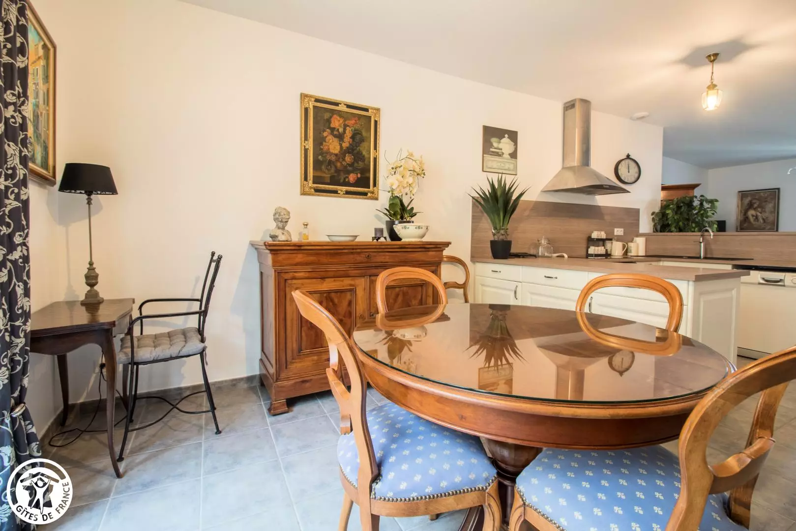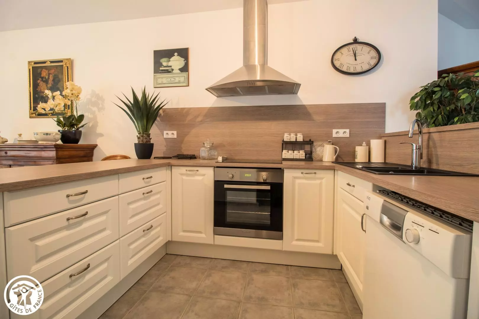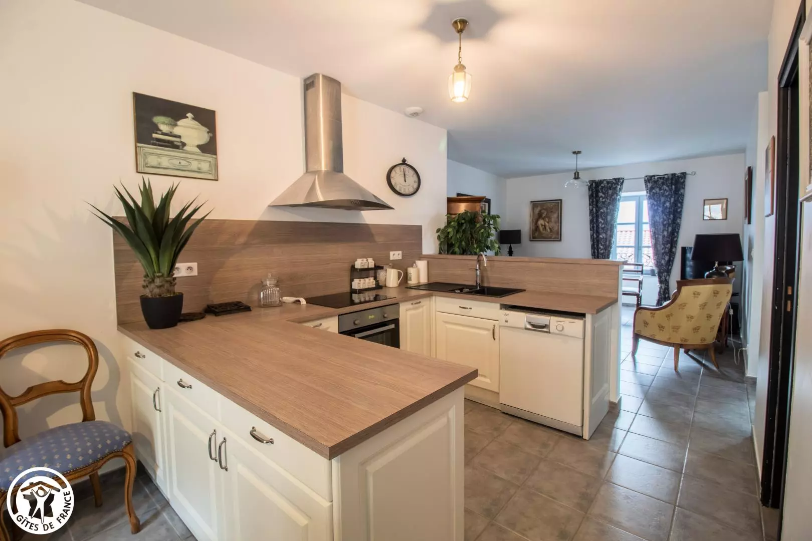 e vie, notamment la salle à manger, la cuisine ainsi que le salon (couchage pour deux personnes supplémentaires possible dans canapé convertible 140). Pour finir, vous trouverez : deux chambres avec un lit de140, un WC indépendant et une salle d'eau. Aux beaux jours, vous apprécierez la terrasse ombragée de plain-pied accessible depuis la salle à manger avec son jardin en terrasse et clos. Vous disposerez d'un stationnement privatif couvert dans un grand cuvelage vigneron (location de vélos possible) avec accès direct au gîte. Pour votre confort, ce gîte propose du TOUT INCLUS (lit fait à l'arrivée, linge de toilette et de table fournis).