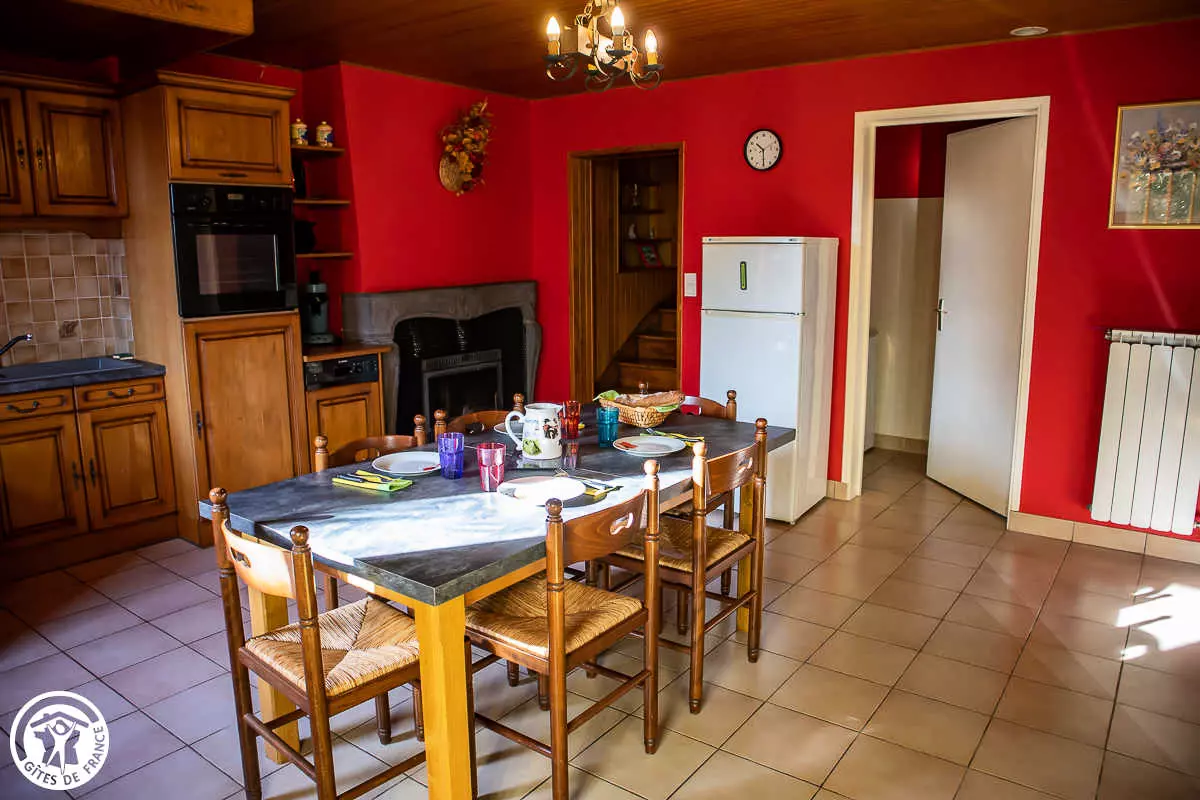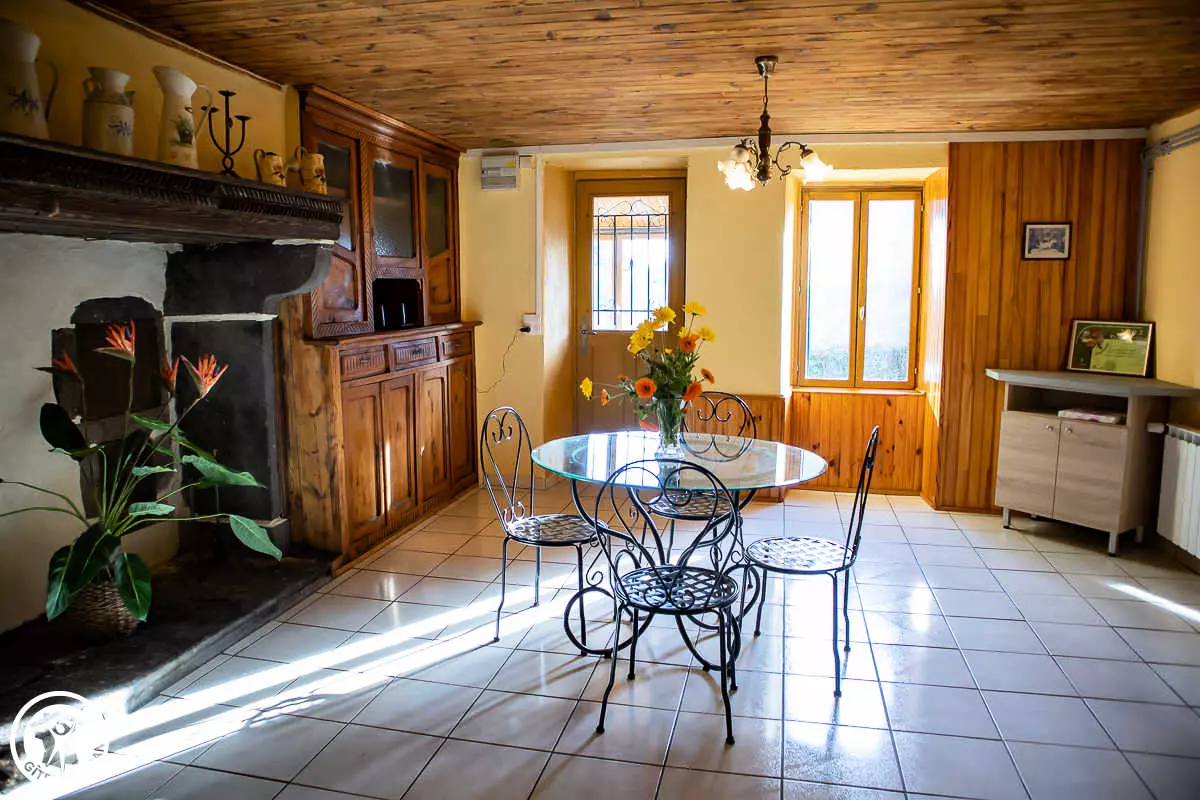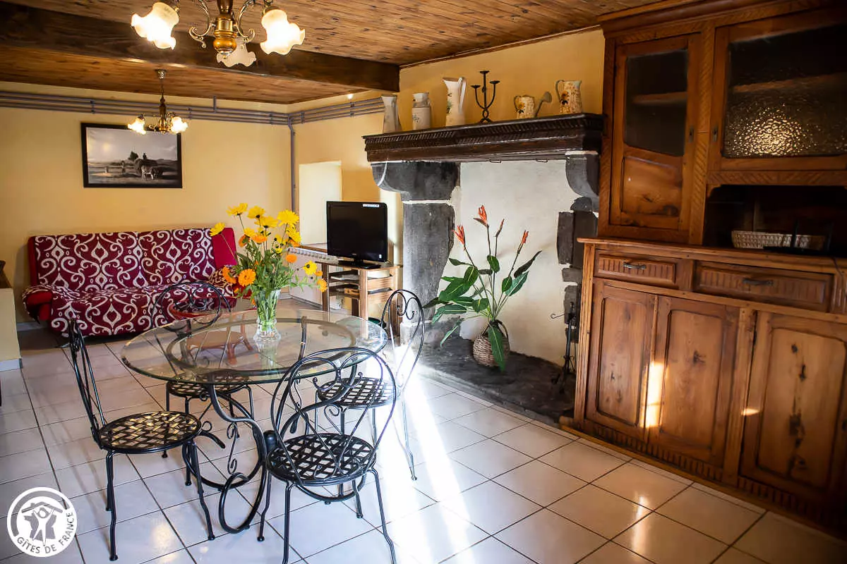 Ce gîte vous accueille dans un décor unique : la chaîne des Puys s'étale en toile de fond. Le géant des Dômes règne sur le paysage. Maison mitoyenne avec une habitation permanente. Gîte au rez-de-chaussée et 1er étage. Au rez-de-chaussée : -un séjour avec véranda, salle à manger/coin cuisine