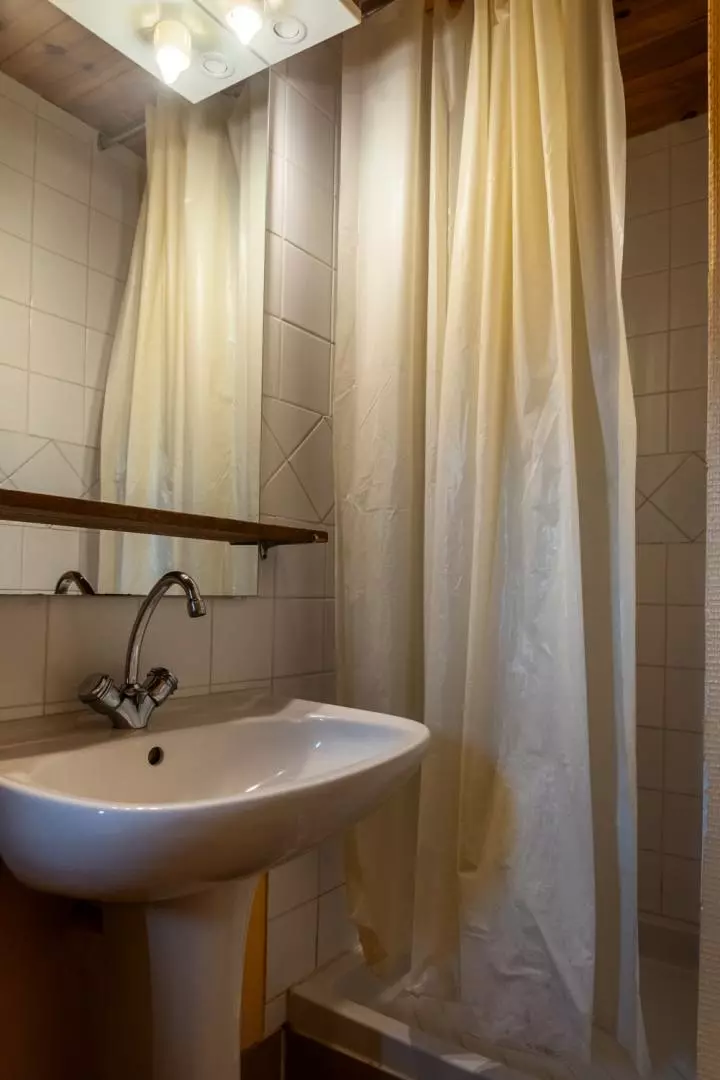 A l'étage: 1 chambre (1 lit 2 places en 140 et TV), 1 salle d'eau avec wc. Lit et siège bébé à disposition. Chauffage central - Possibilité de location de draps.