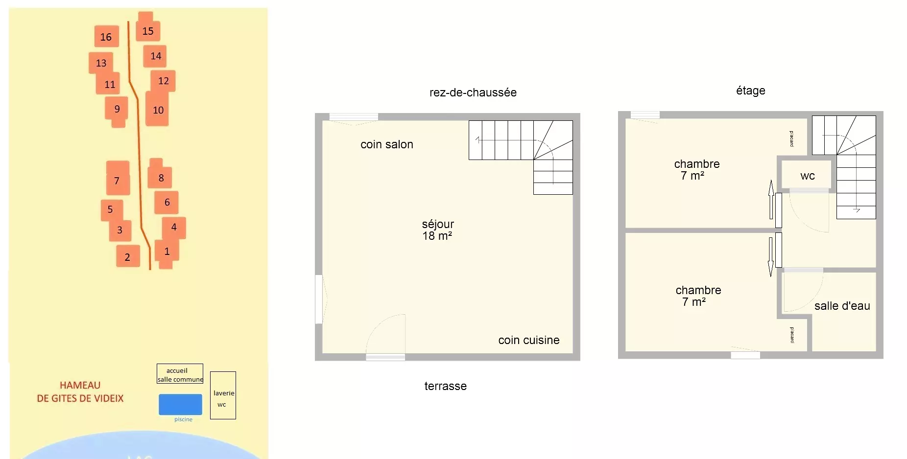 Surface 31 m². Rez-de-chaussée : séjour avec kitchenette. ETAGE : 2 chambres (1 lit 140*190, 2 lits 90*190), salle d'eau, wc séparé, chauffage électrique.