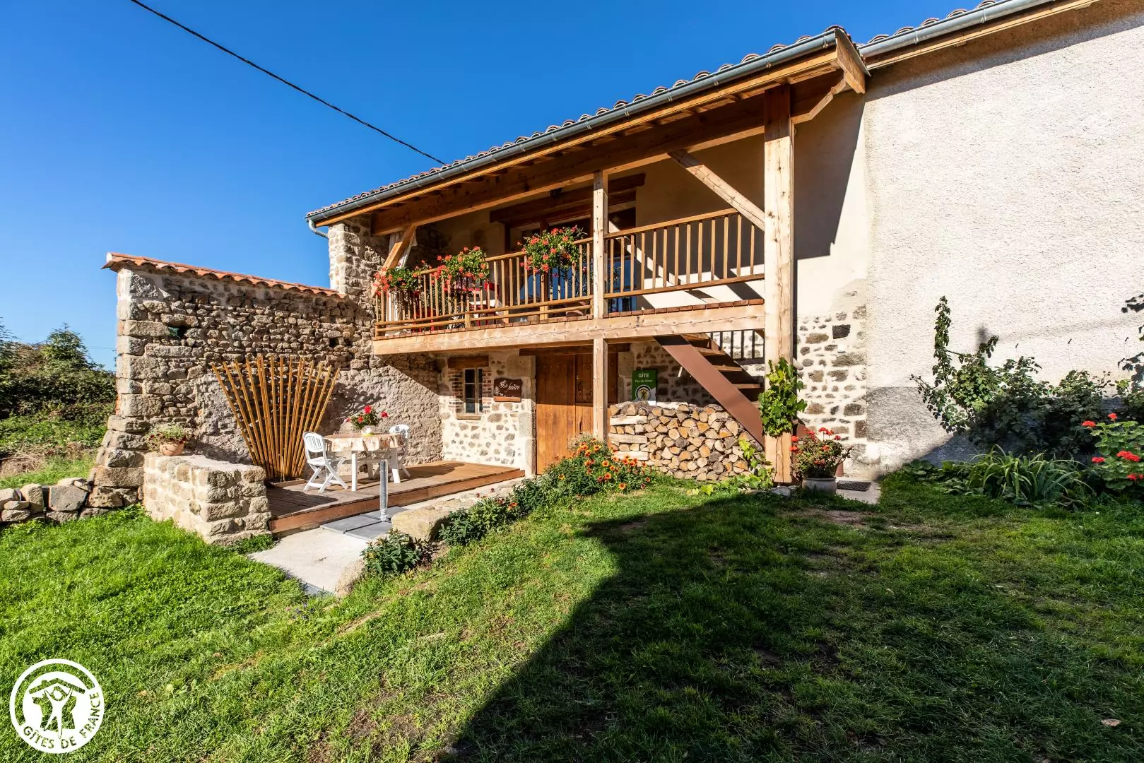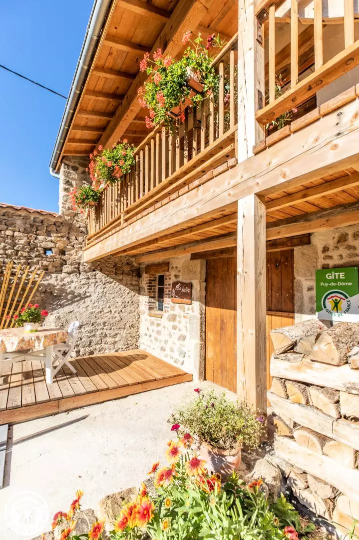 ires qui se feront un plaisir de vous conseiller. Le gîte, sur deux niveaux, est composé : au rez- de- chaussée d'un local fermé ( avec lave linge, barbecue, tri sélectif,... ); et si vous êtes motard, ou cycliste, vous pourrez y mettre vos bolides à l'abri . A l'étage: une pièce à vivre avec cuisine ouverte sur salle à manger et espace détente avec un canapé . Une chambre avec un lit 160 et une salle d'eau. Vous profiterez de la terrasse au 1er étage et du terrain au rez-de-chaussée. Le chauffage électrique est inclus dans le prix. Les commerces et services les plus proches sont à Courpière à 8 km.