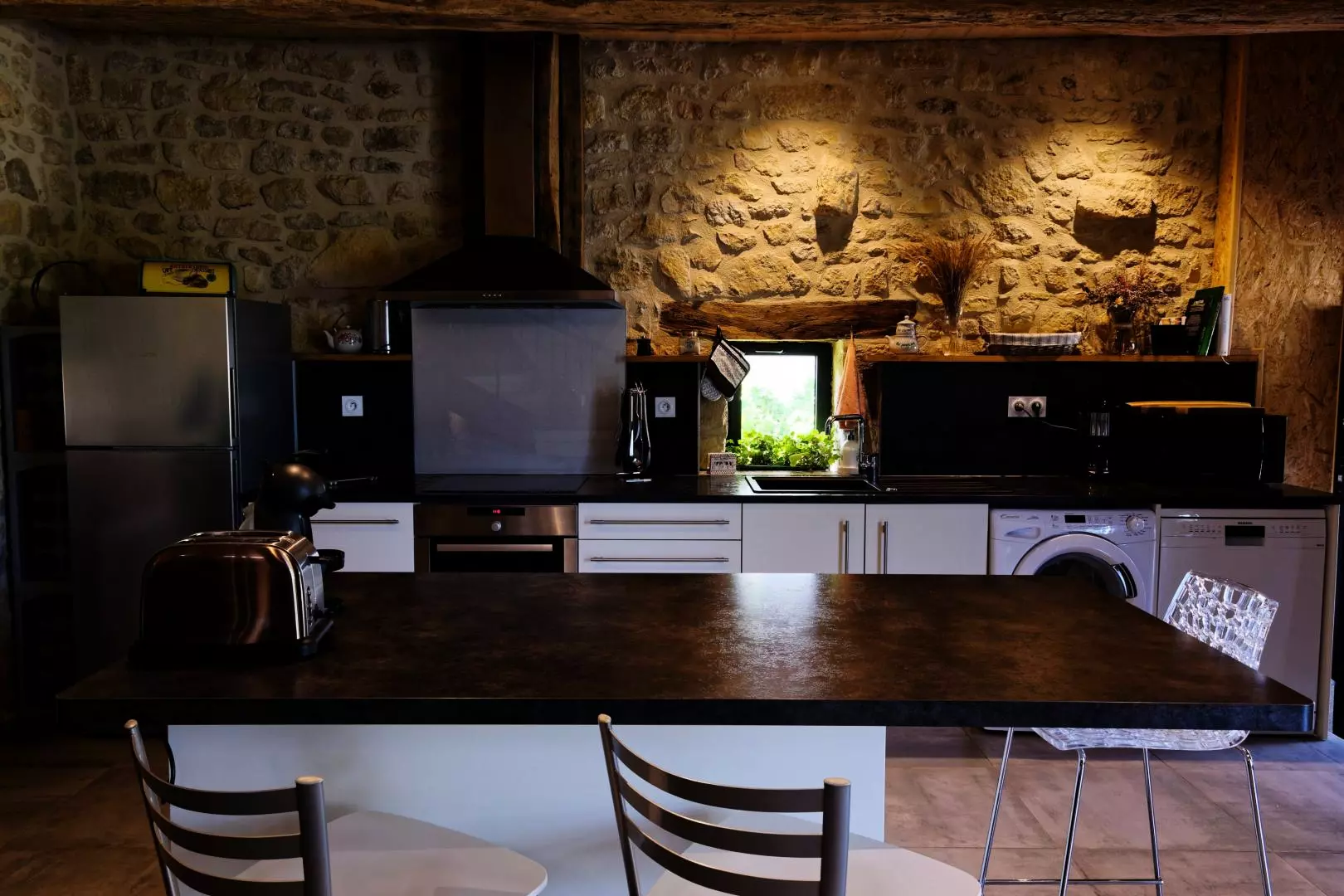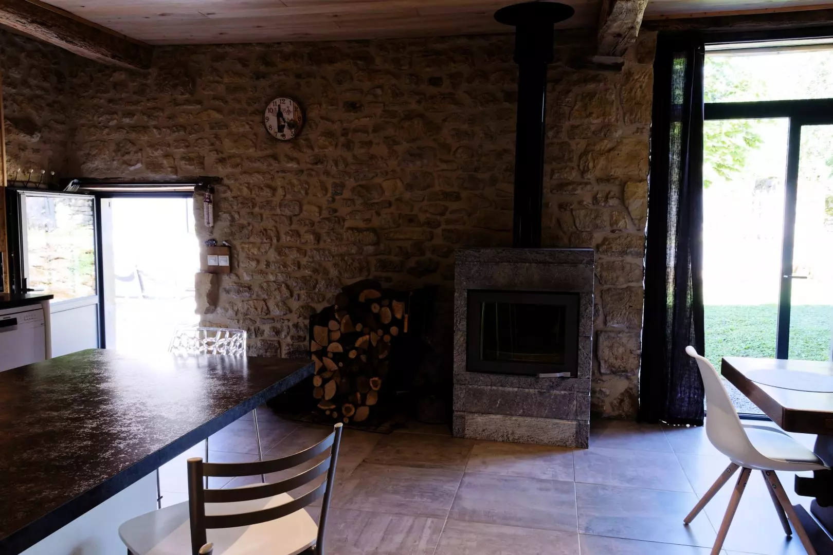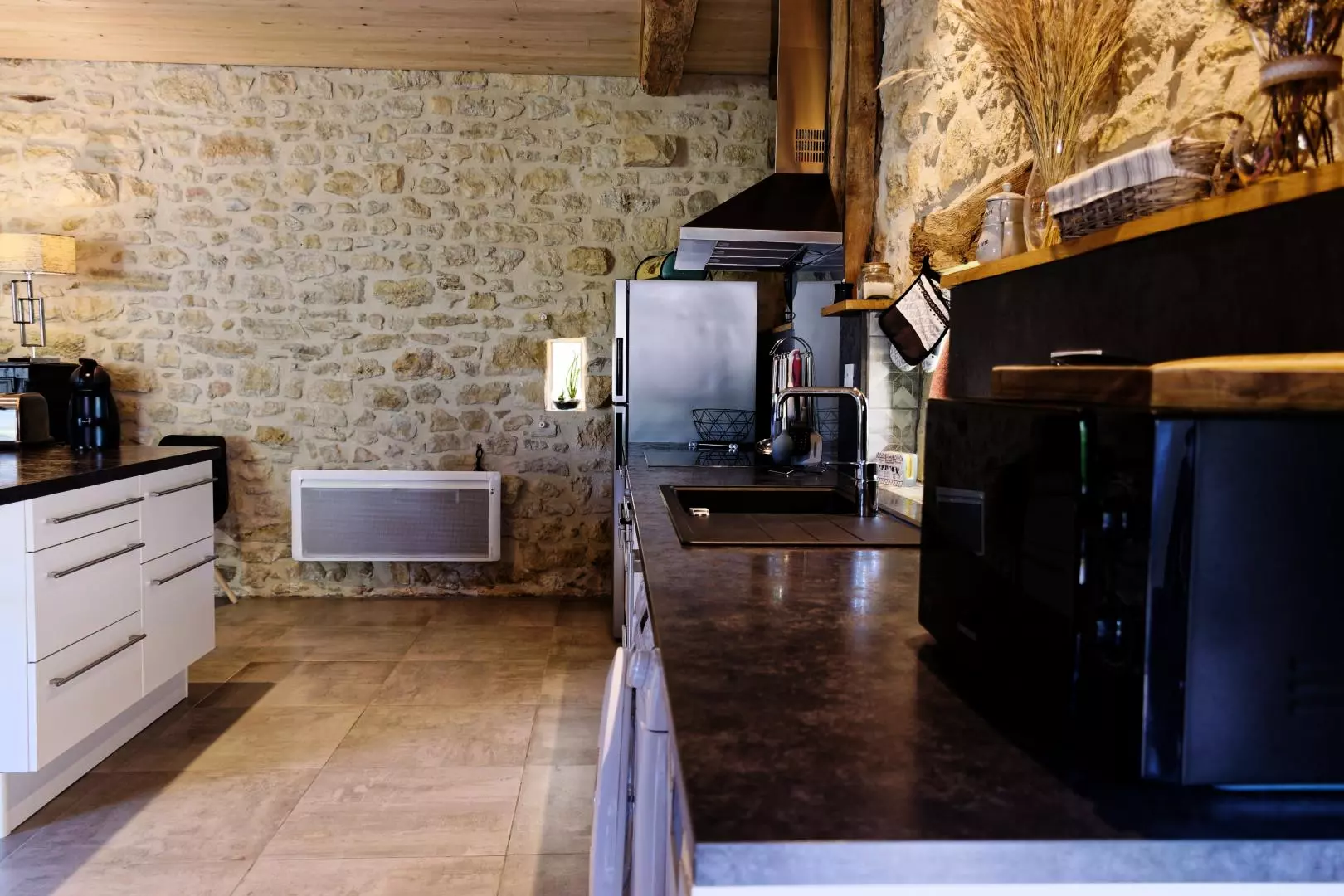 Une cuisine moderne équipée dans une pièce de vie unique dans laquelle un poêle de masse à bois et des convecteurs électriques sont présents pour un chauffage efficace.