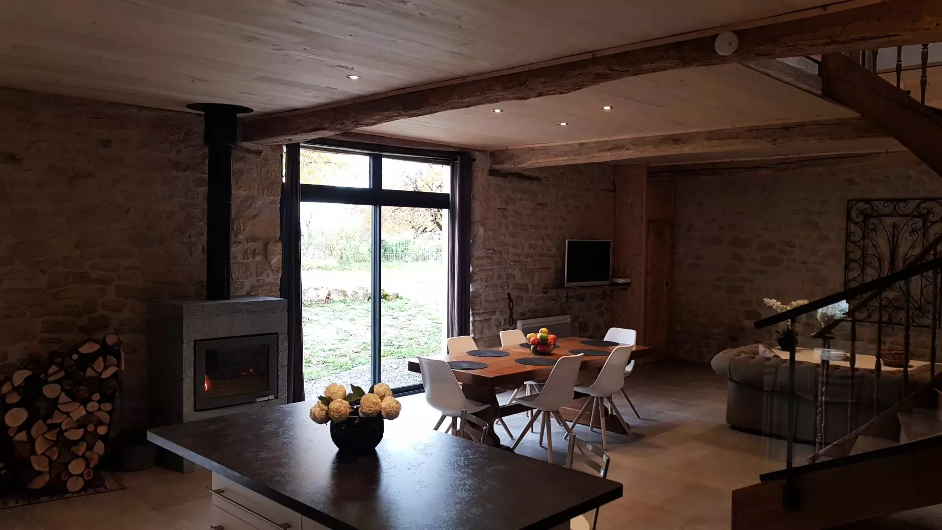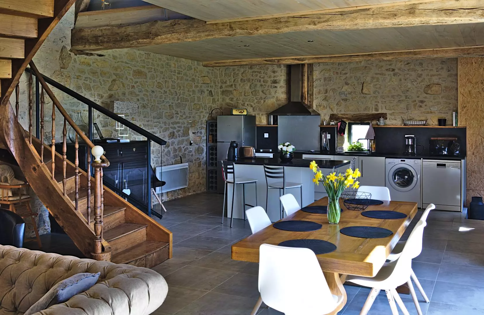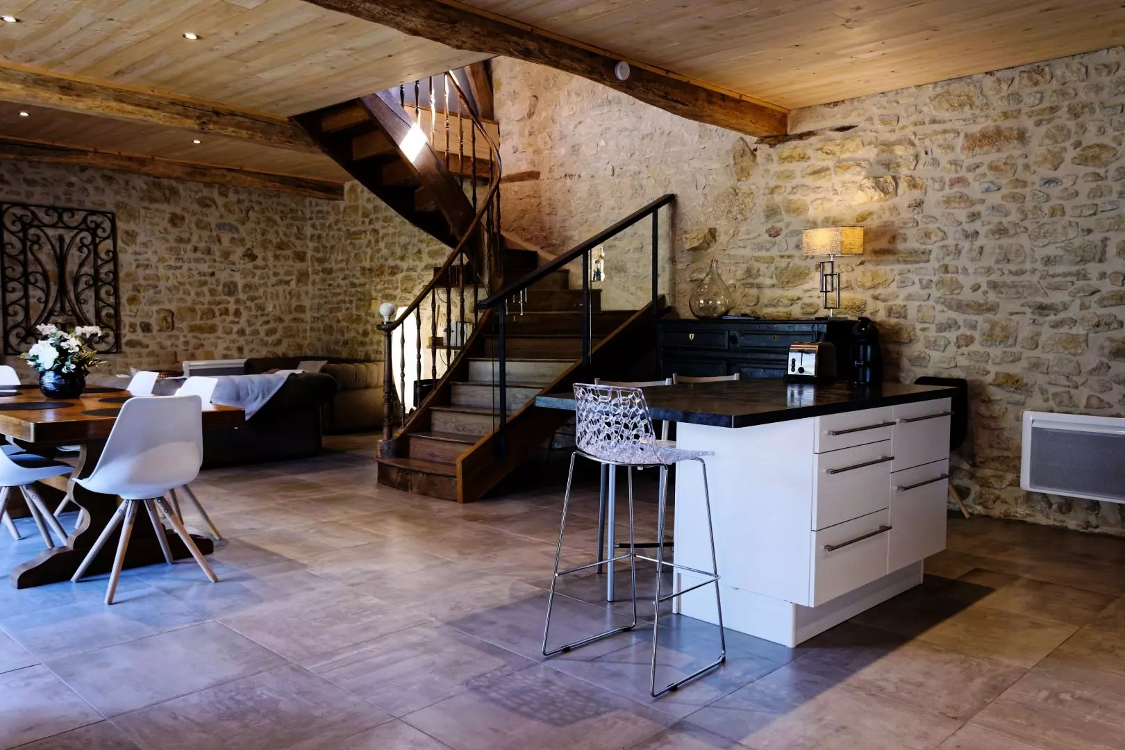 Une cuisine moderne équipée dans une pièce de vie unique dans laquelle un poêle de masse à bois et des convecteurs électriques sont présents pour un chauffage efficace.