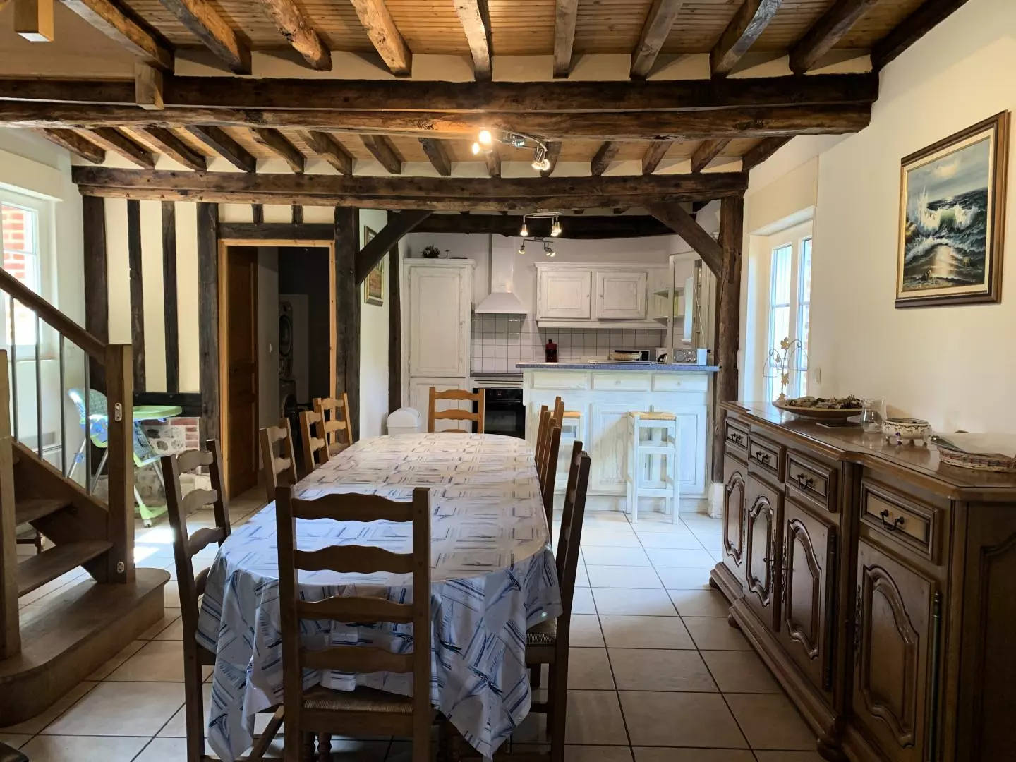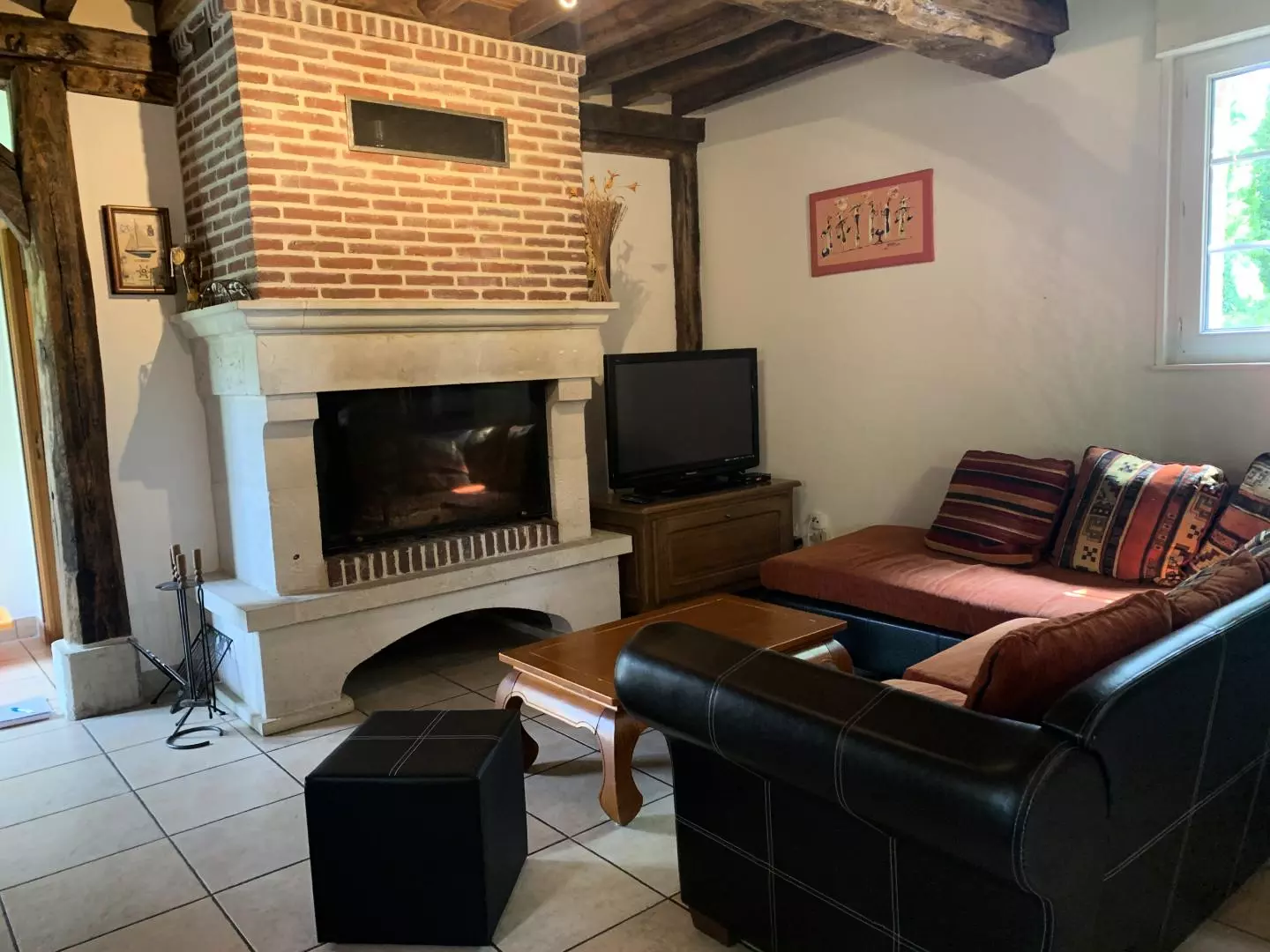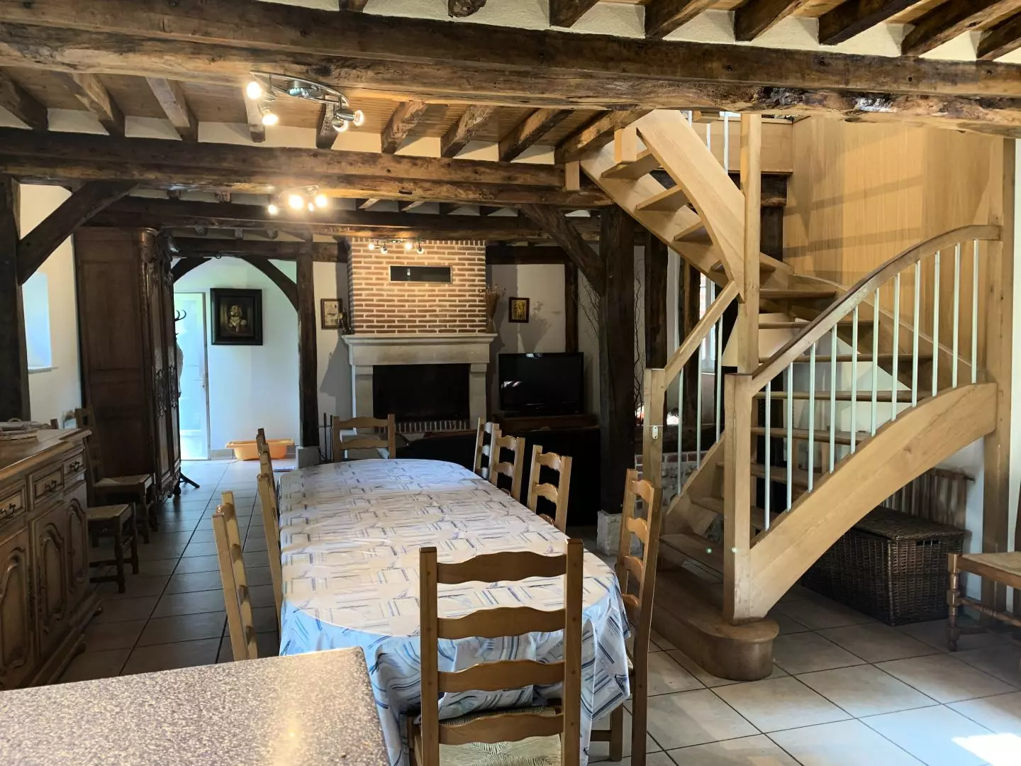 Rez-de-chaussée : - séjour-salon avec belle cheminée, TV, - coin cuisine (lave-vaisselle, micro-ondes),