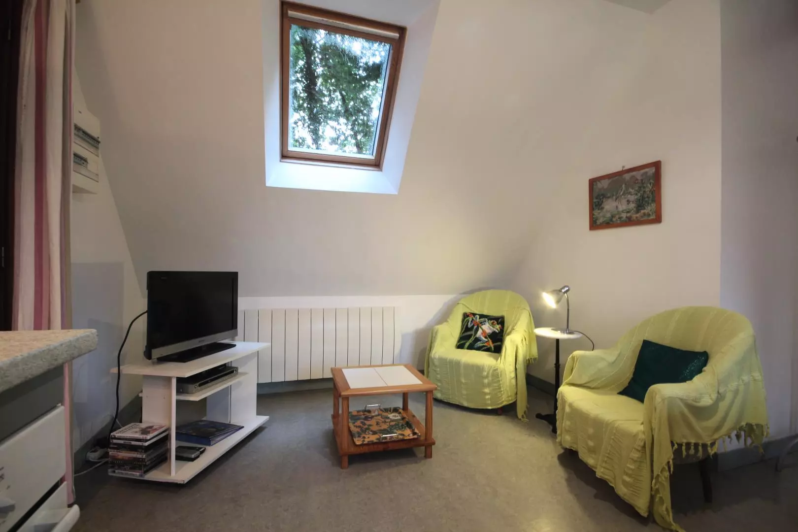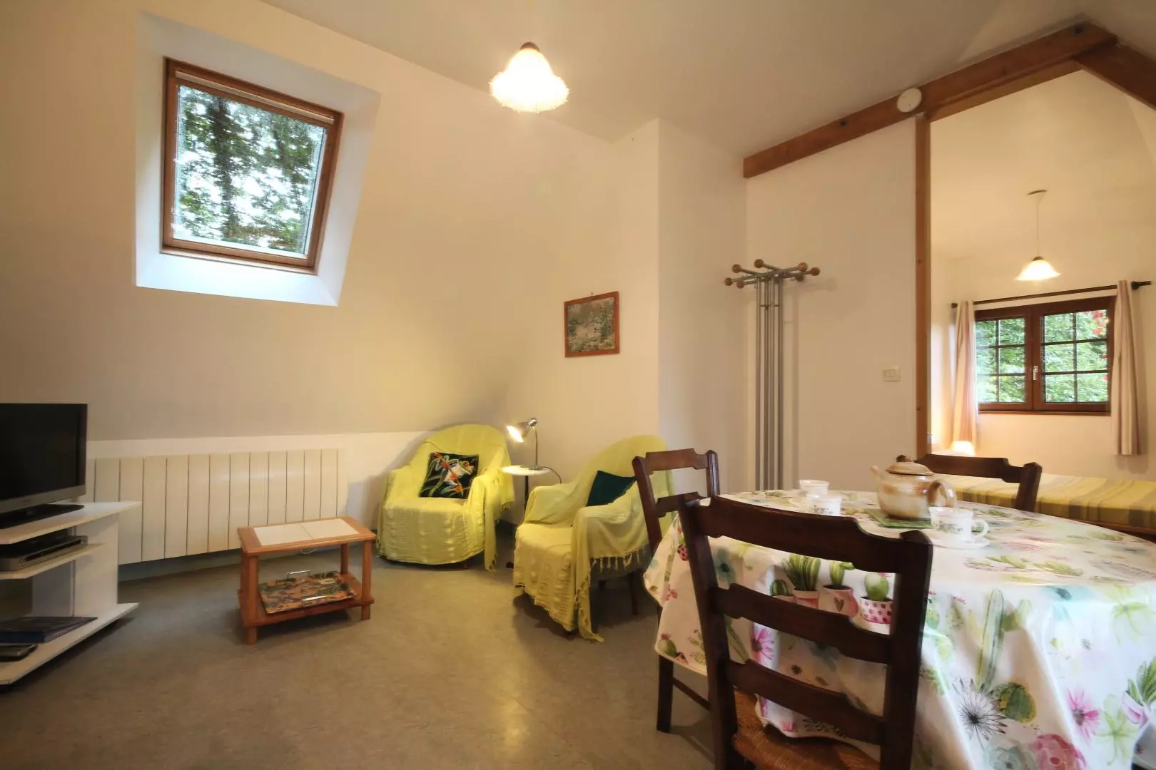 A l'étage : Espace de vie ouvert divisé en trois parties : - espace détente, Tv,