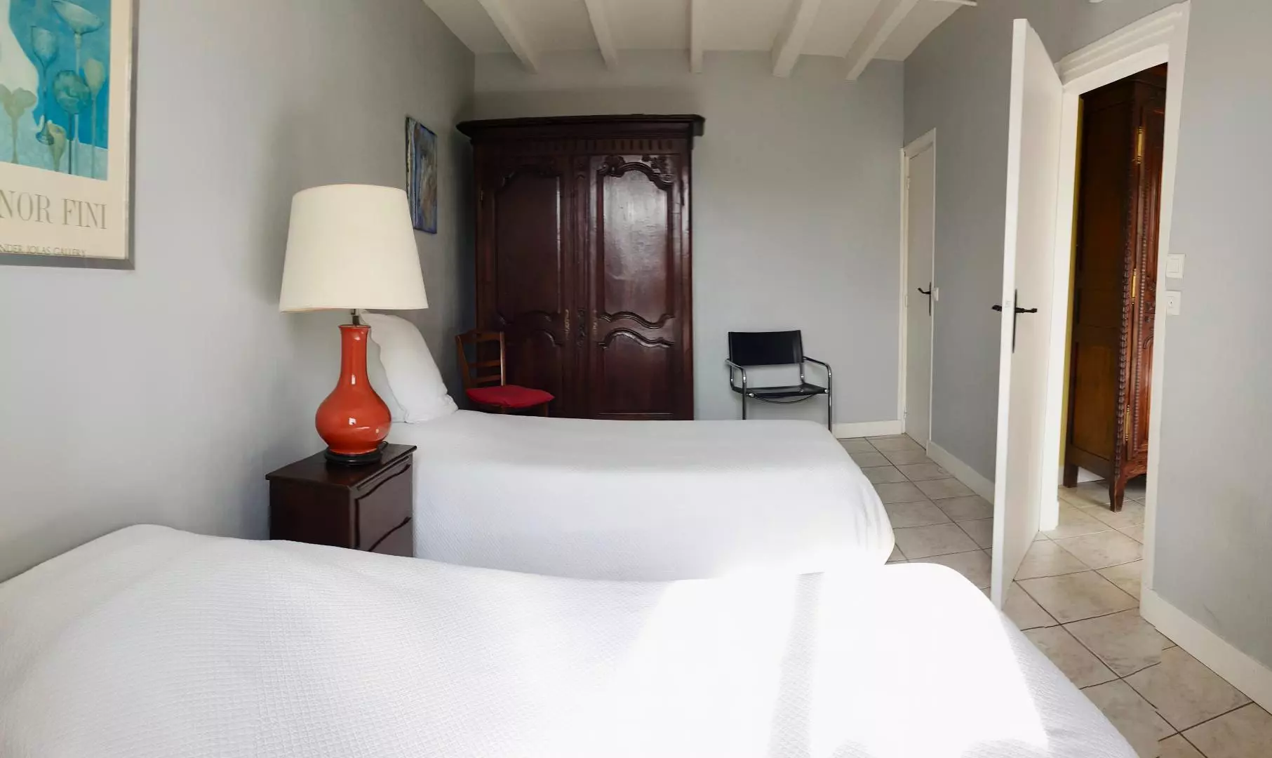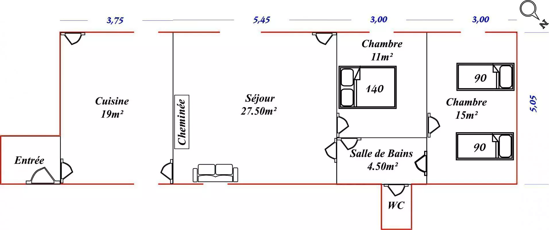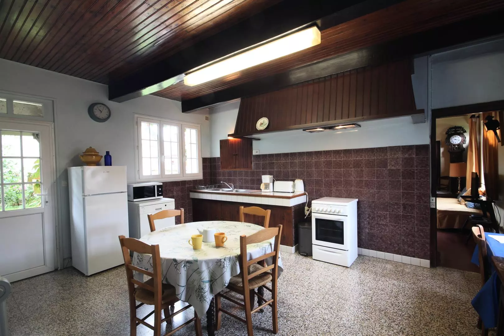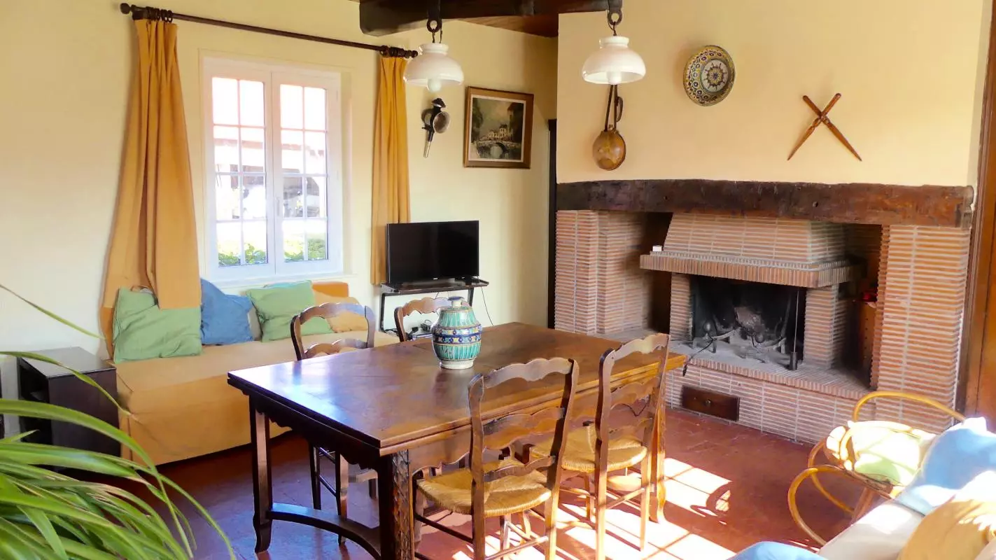 Plain-pied : - entrée avec lave-linge, - cuisine (lave-vaisselle, micro-ondes, case congélateur ), - séjour-salon, TV, lecteur DVD, cheminée, - 1 chambre (1 lit 2 personnes), - 1 chambre (2 lits 1 personne), - salle d'eau. Lit enfant (toile), chaise haute. Parking .