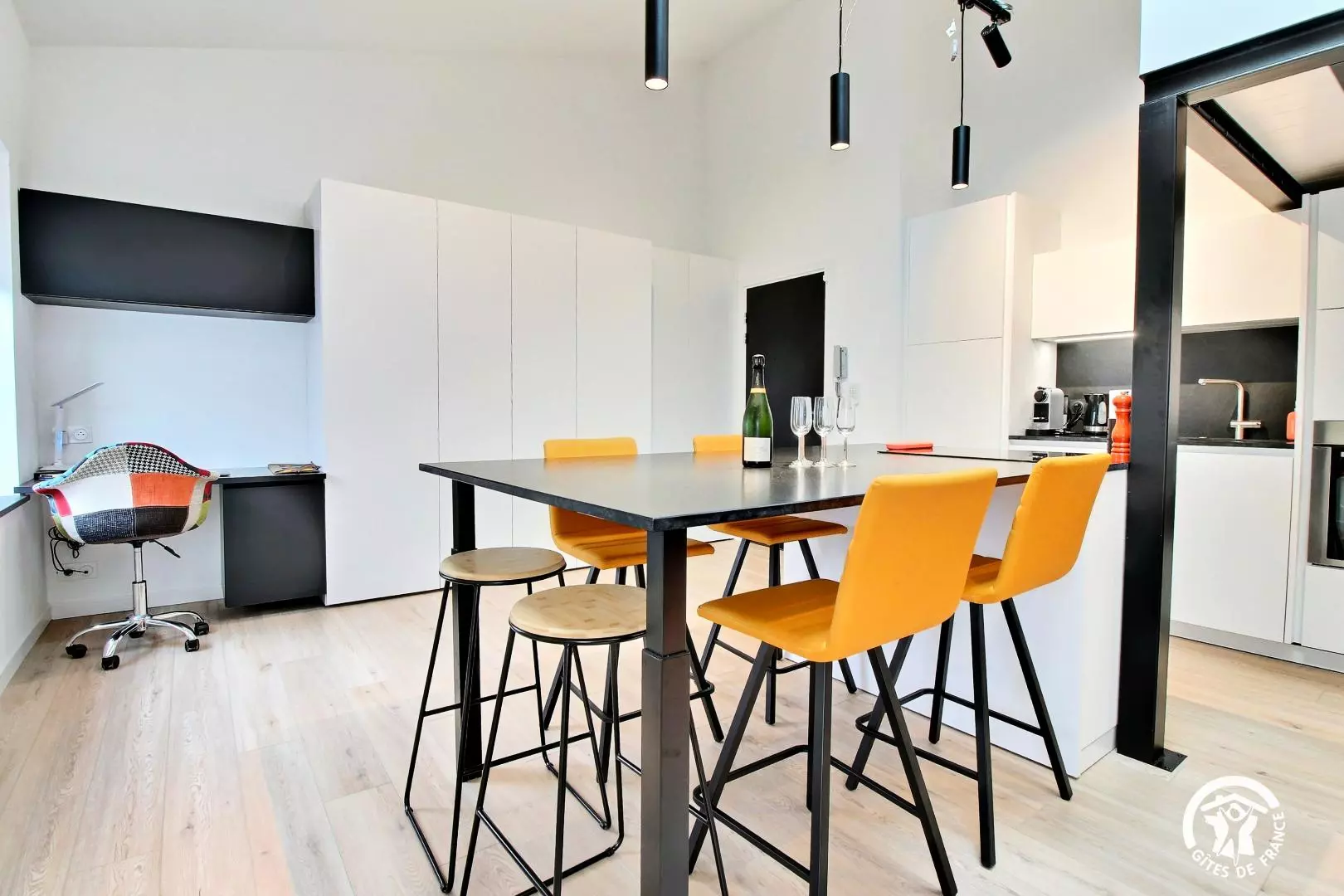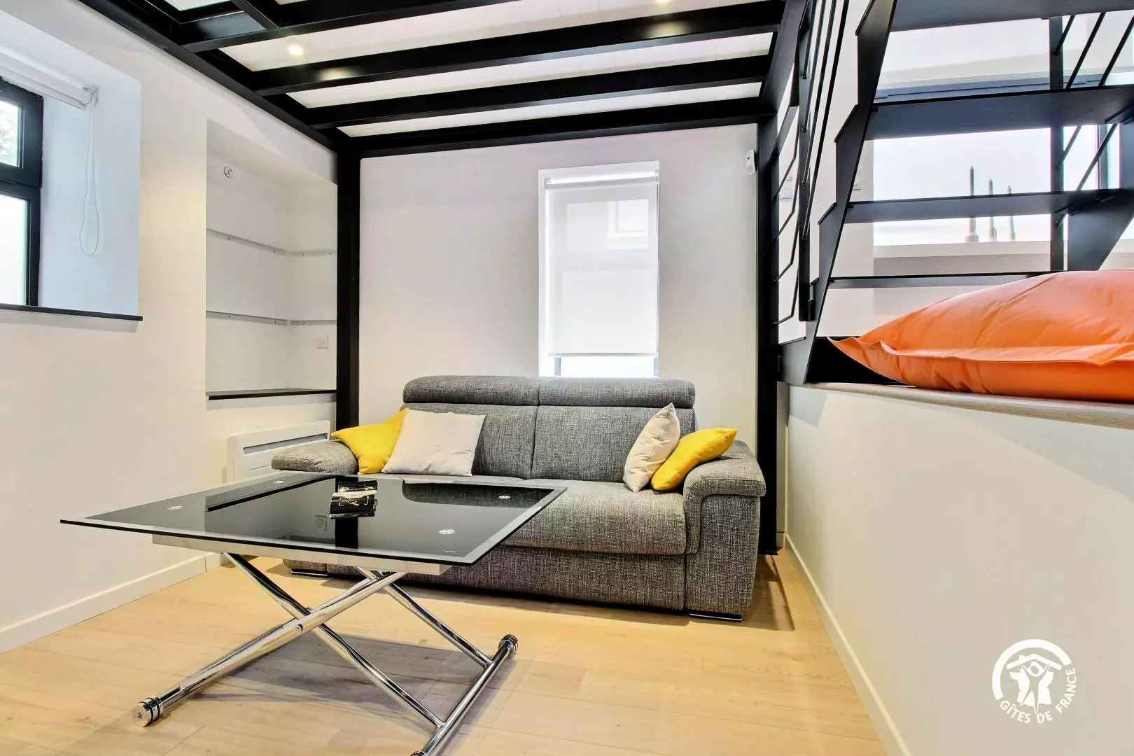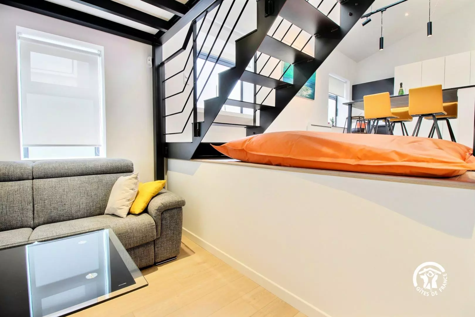 Appartement organisé comme suit : Pièce principale : cuisine aménagée, grand coin repas, espace bureau et nombreux rangements WC indépendant En contrebas : coin salon avec canapé convertible en 140 x 190 À l'étage : une chambre avec un lit en 160 x 200 Une salle d'eau avec douche accessible depuis la chambre (quelques marches) Informations : Places de stationnement public gratuites dans la rue ou parking gratuit à proximité immédiate Possibilité d'accueillir deux personnes supplémentaires (couchage dans le salon)