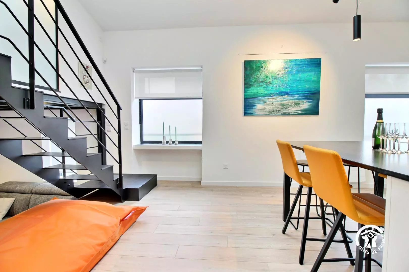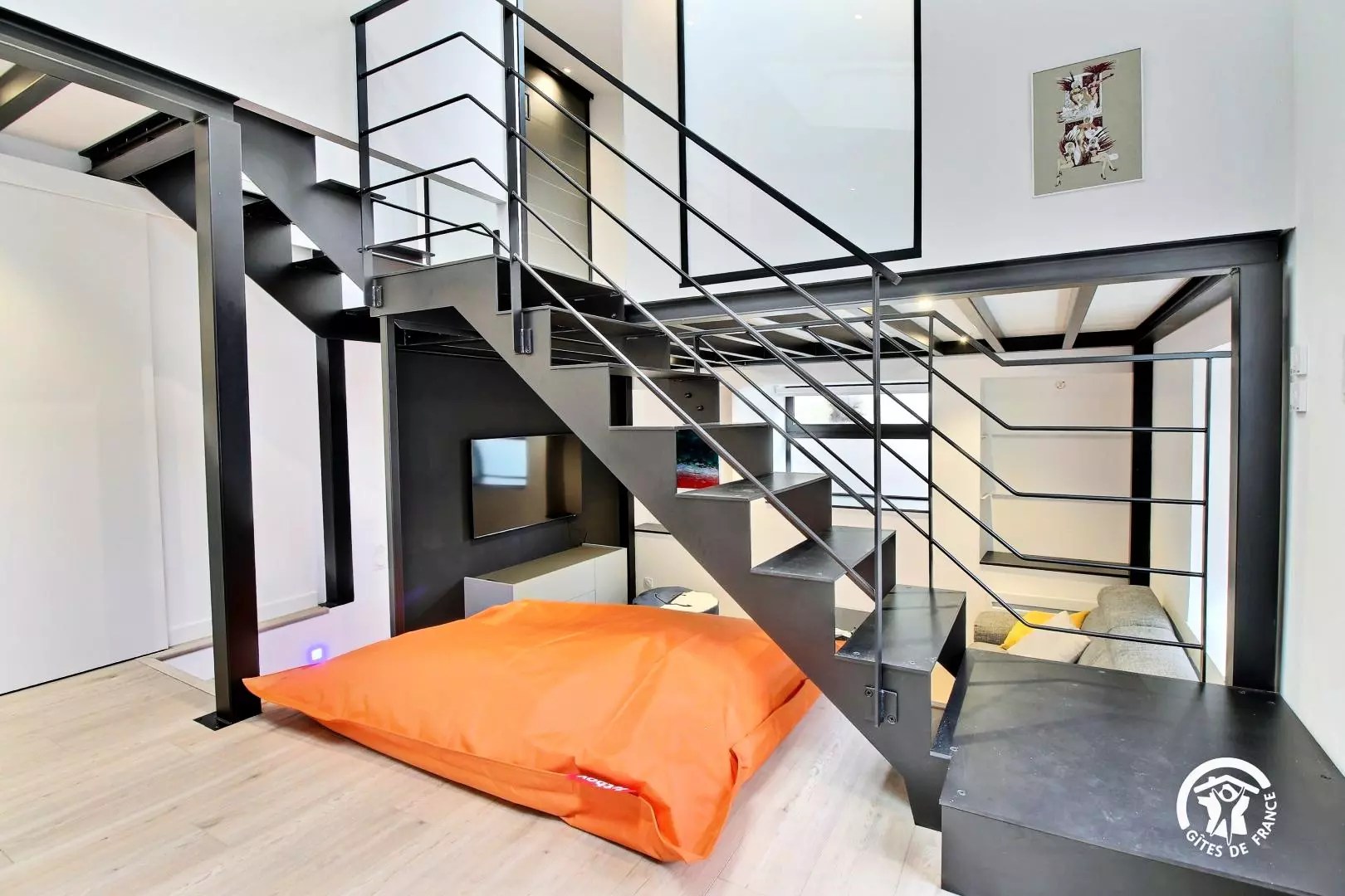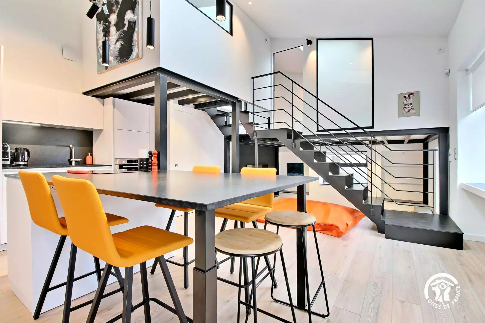 Bienvenue dans cet appartement contemporain entièrement rénové, aménagé dans un ancien bureau. Ce loft offre un agencement astucieux et la décoration marie parfaitement la modernité avec le grand escalier style industriel. Les hauts plafonds et les fenêtres laissent entrer un puits de lumière naturelle, créant une atmosphère lumineuse et aérée.