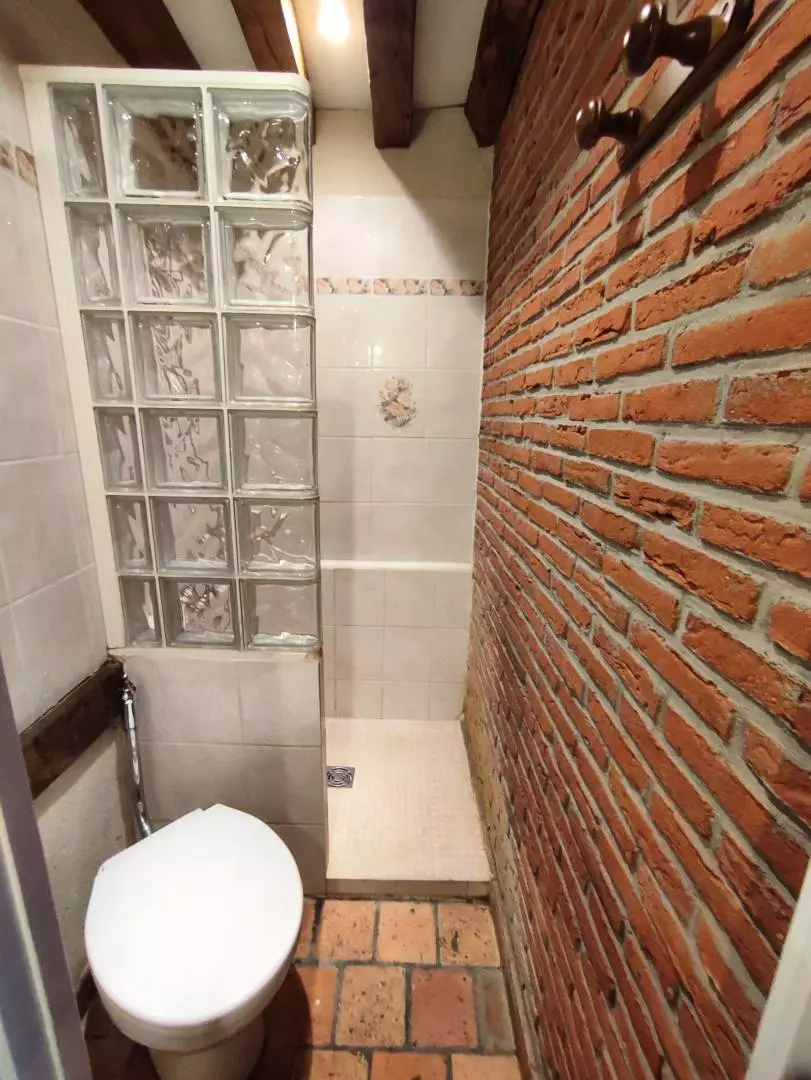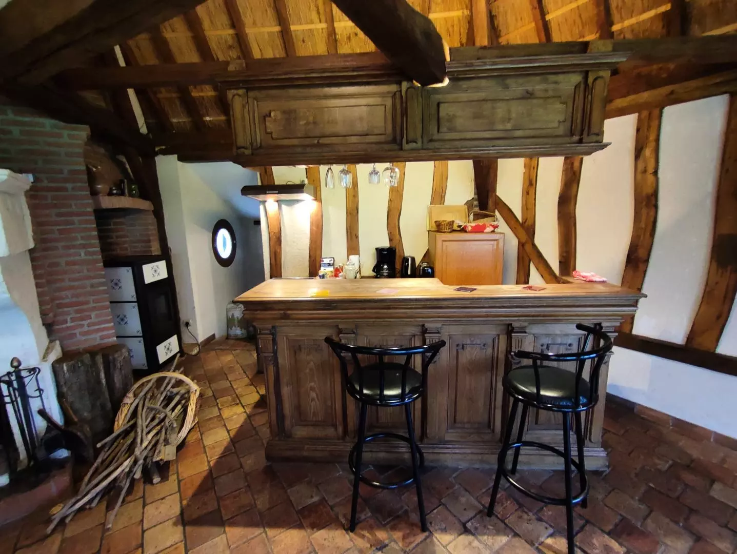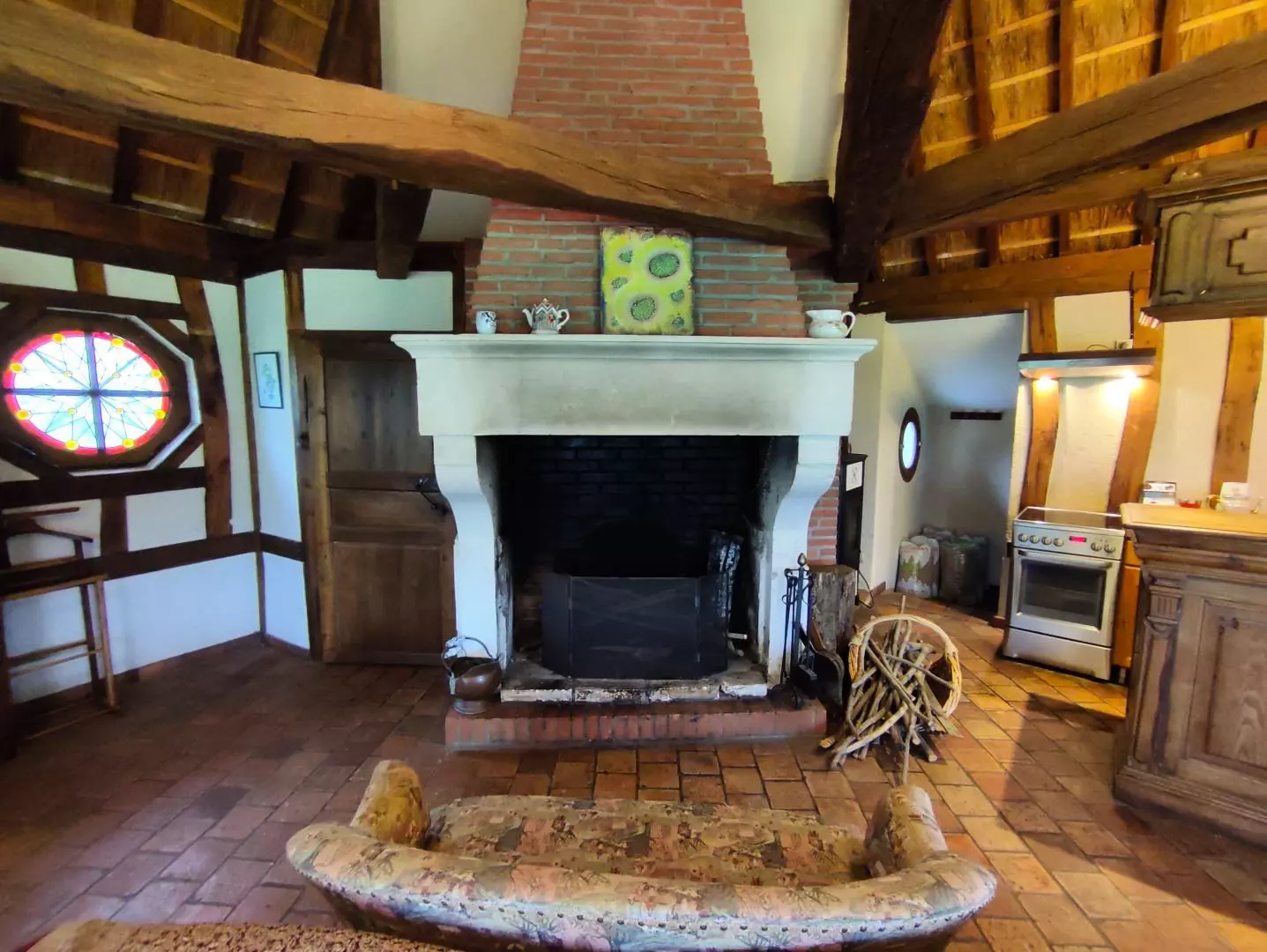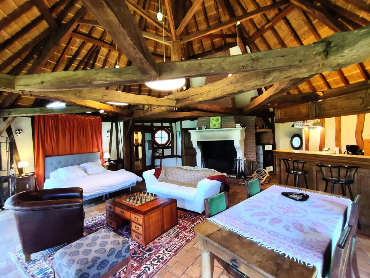 Vaste séjour avec lit 2 pers., coin cuisine (cuisinière électrique, four, micro-ondes, lave-vaisselle) avec bar, espace repas et salon (cheminée et TV LCD), salle d'eau avec wc, une très grande cheminée et un poêle à granulés.
