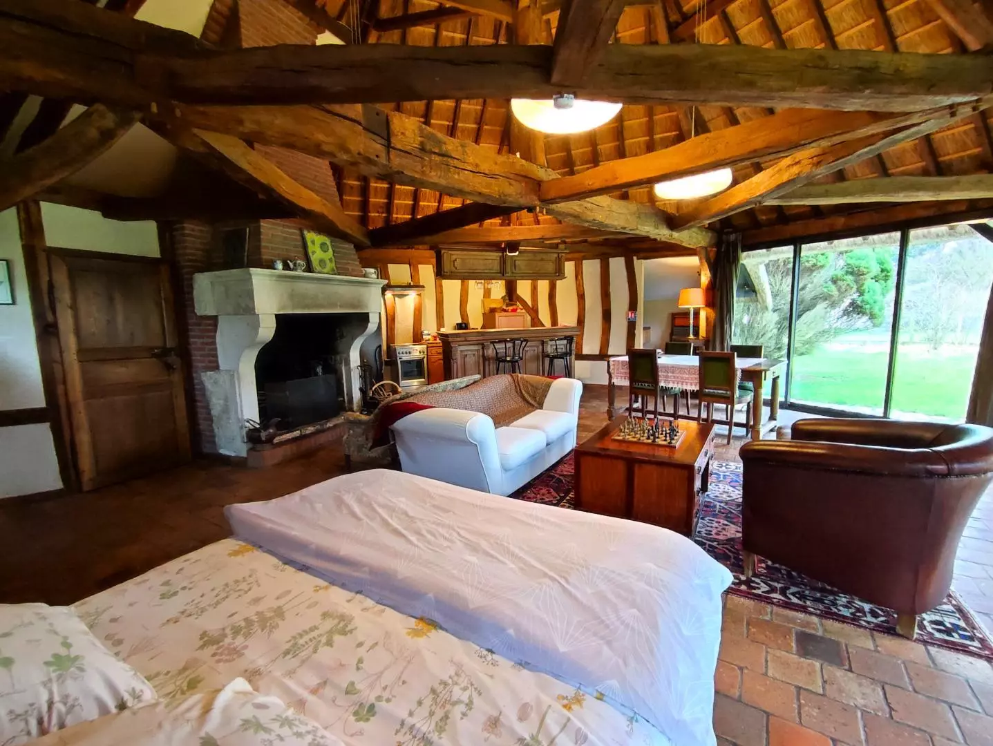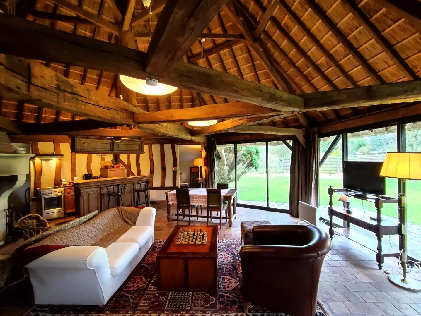 ELECTRICITE, CHAUFFAGE, DRAPS INCLUS. Forfait ménage possible. Taxe de séjour. Gîte non fumeur. Gîte au cachet unique situé en plein Parc naturel régional des Boucles de la Seine normande. La structure est celle d'une aire de battage du XVIIIe siècle, transplantée à proximité de la maison des propriétaires pour y être transformée en habitation à colombages, sur un jardin clos et arboré de 5 000m². A 500 m de la forêt de Brotonne, 1,5 km du fleuve et 7 km de la base de loisirs et du golf de Mesnil-sous-Jumièges.