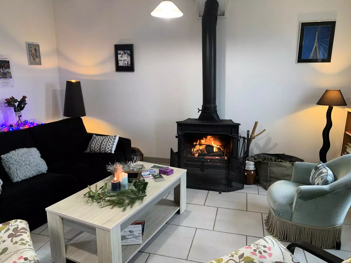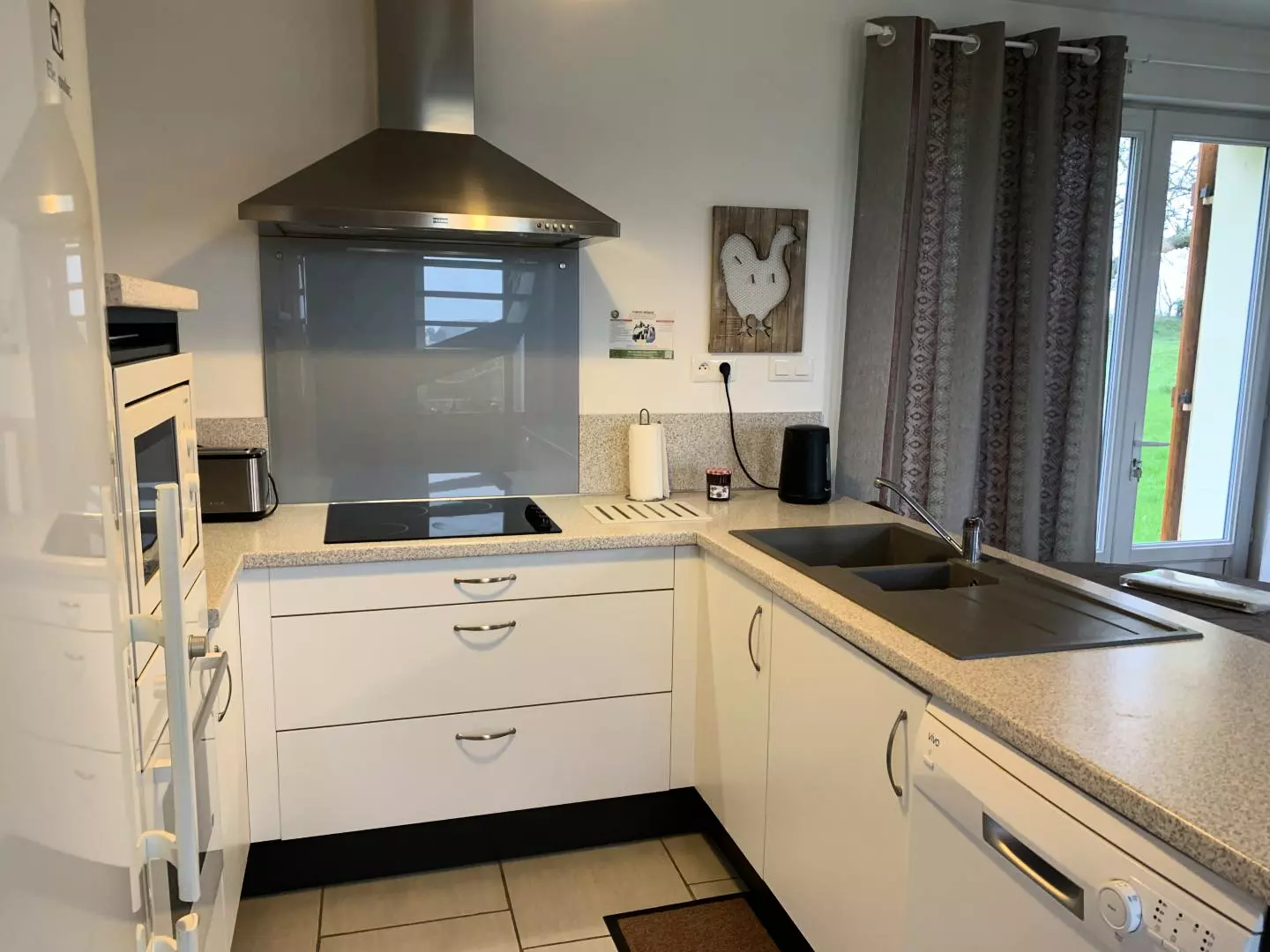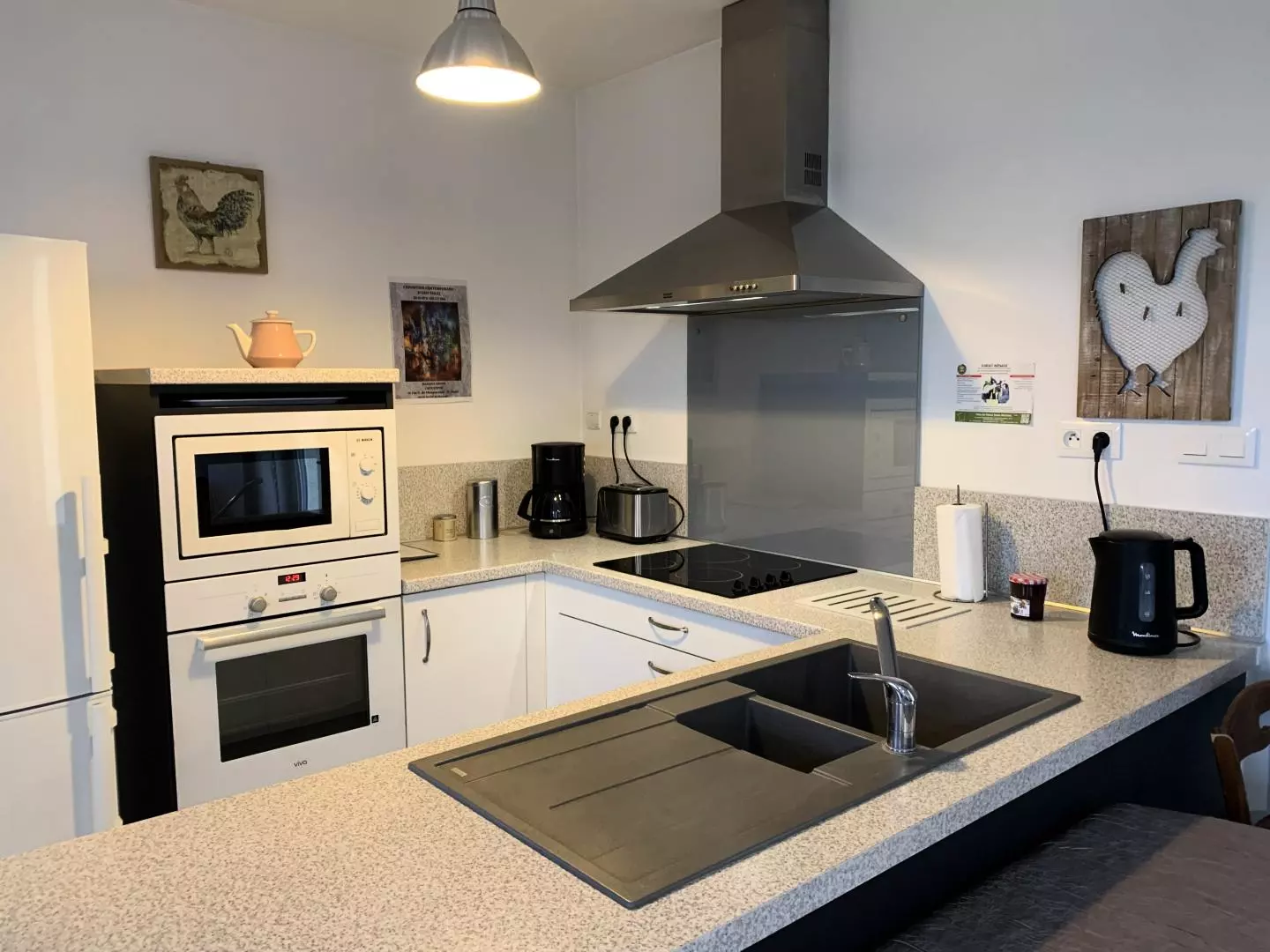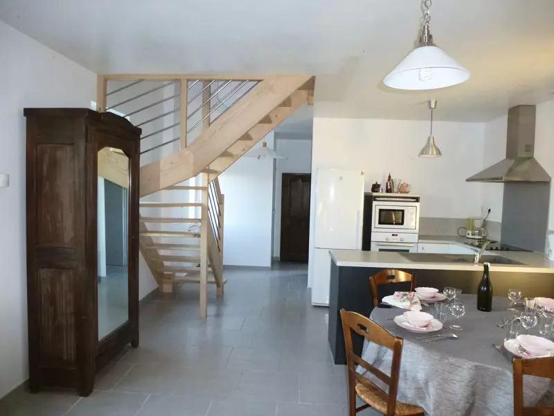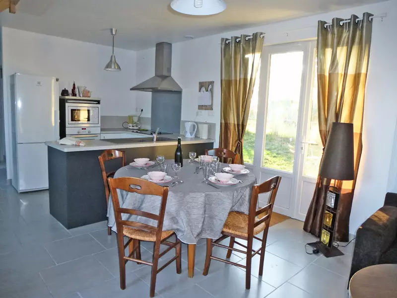 Rez-de-chaussée : - cuisine ouverte (plaque vitrocéramique 4 feux, four, micro-ondes, réfrigérateur avec 3 tiroirs congélateur, évier simple bac, lave-vaisselle) donnant sur - salon/salle à manger (convertible 2 places), poêle à bois Godin Colonial, TV et connexion adsl, lecteur DVD, colonne radio (Bluetooth et clé USB),