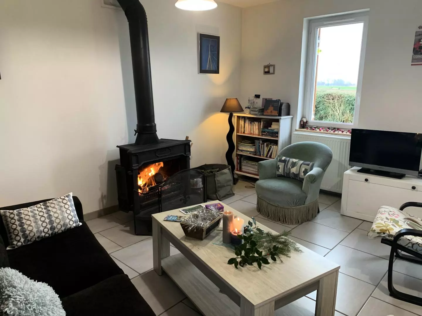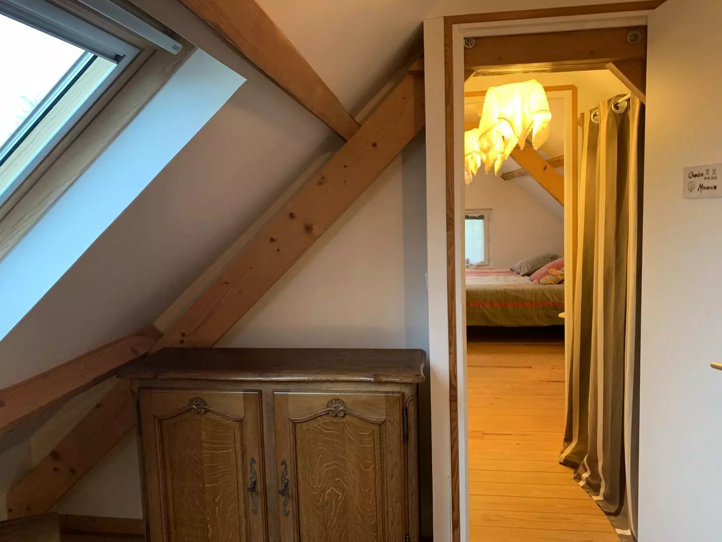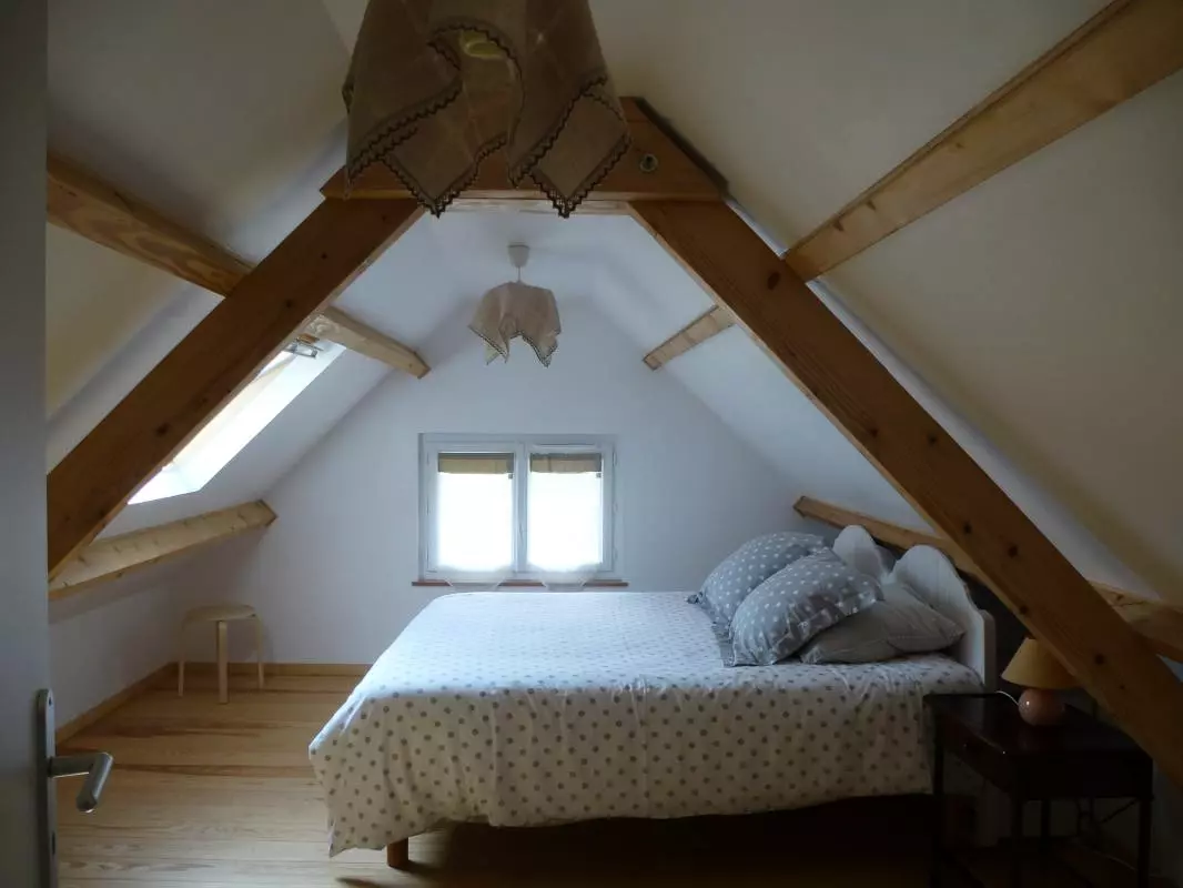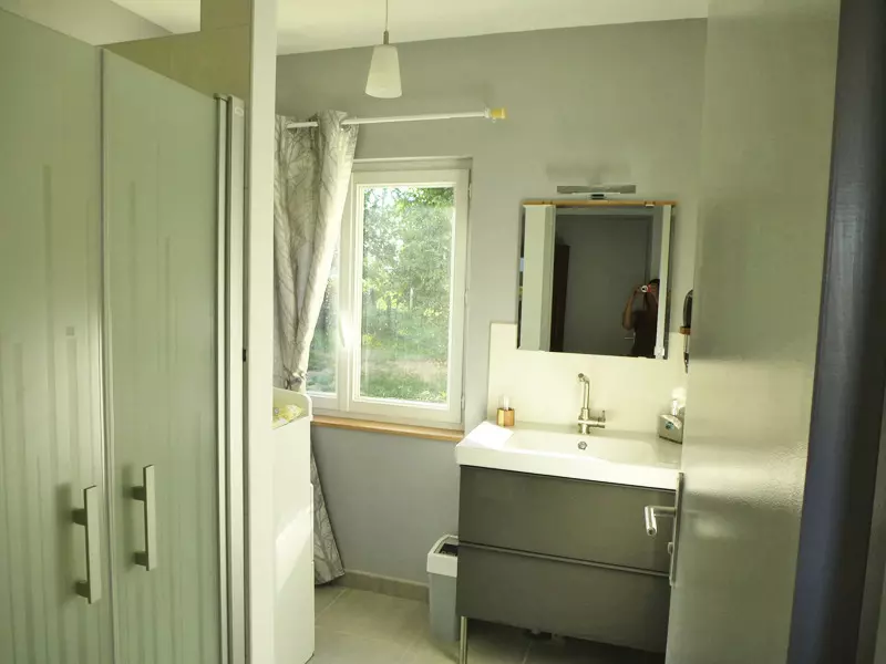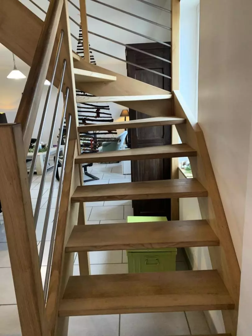 Rez-de-chaussée : - cuisine ouverte (plaque vitrocéramique 4 feux, four, micro-ondes, réfrigérateur avec 3 tiroirs congélateur, évier simple bac, lave-vaisselle) donnant sur - salon/salle à manger (convertible 2 places), poêle à bois Godin Colonial, TV et connexion adsl, lecteur DVD, colonne radio (Bluetooth et clé USB),
