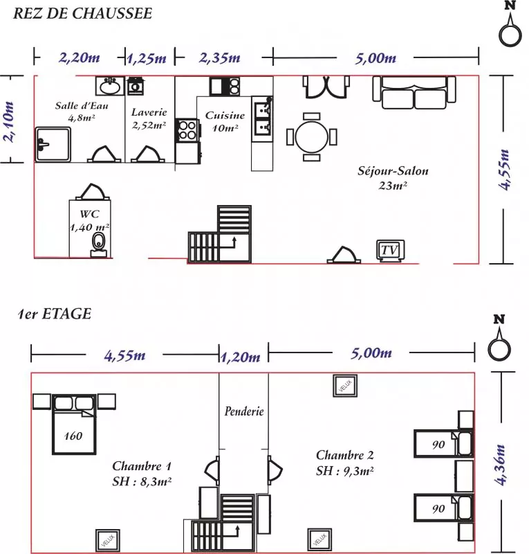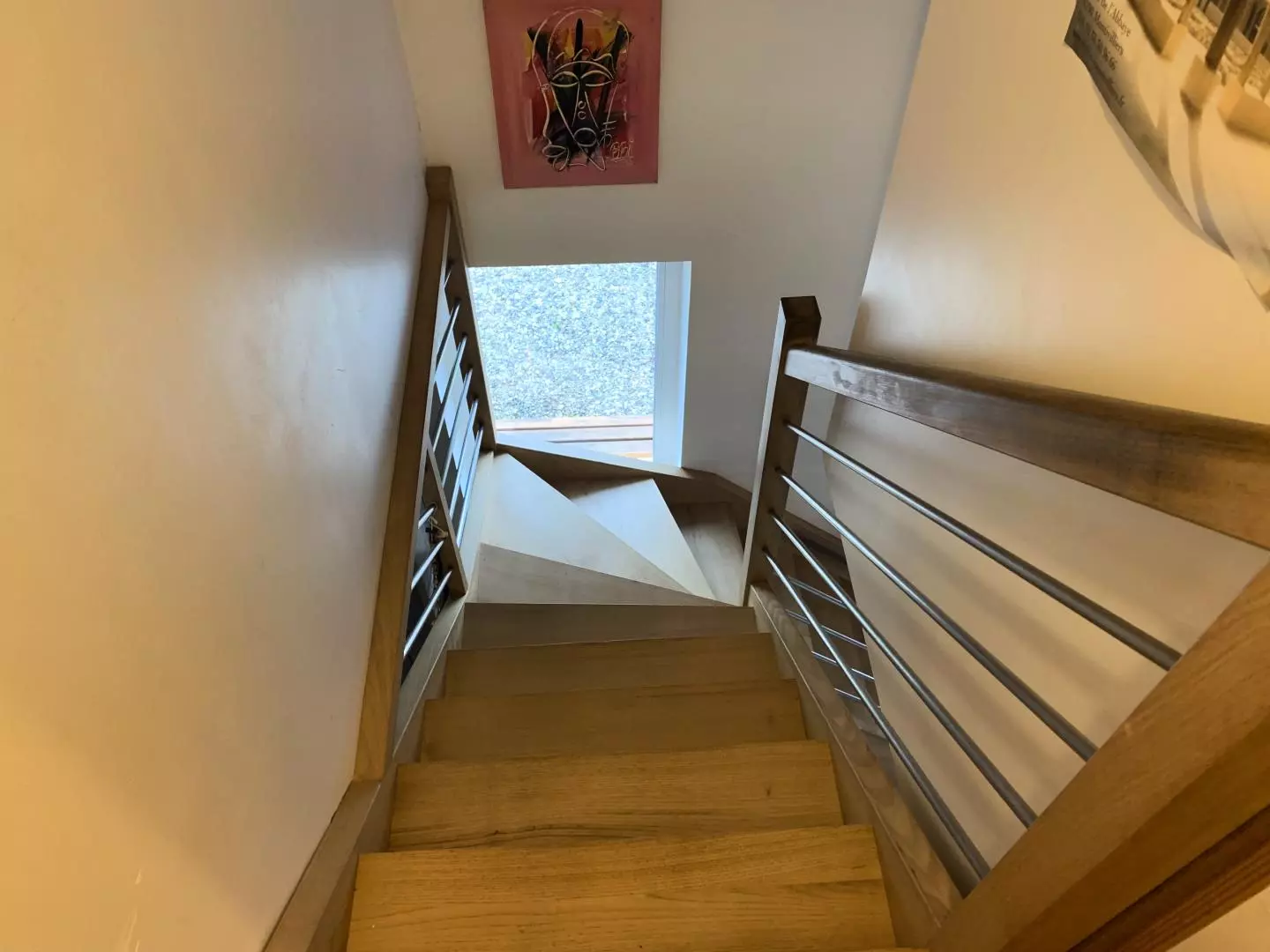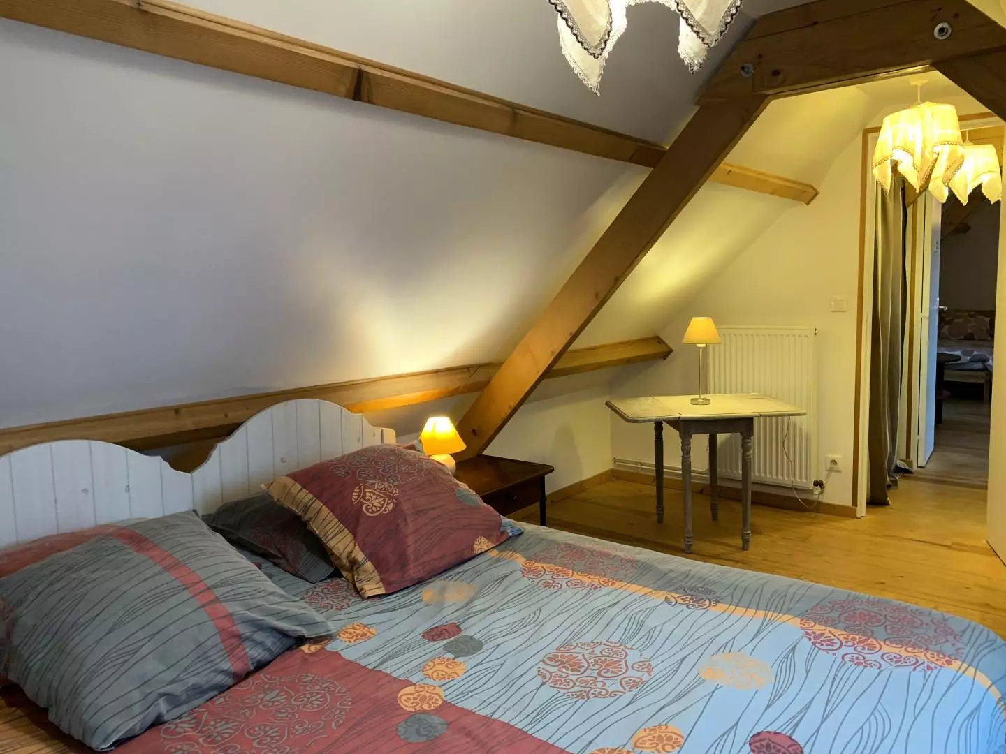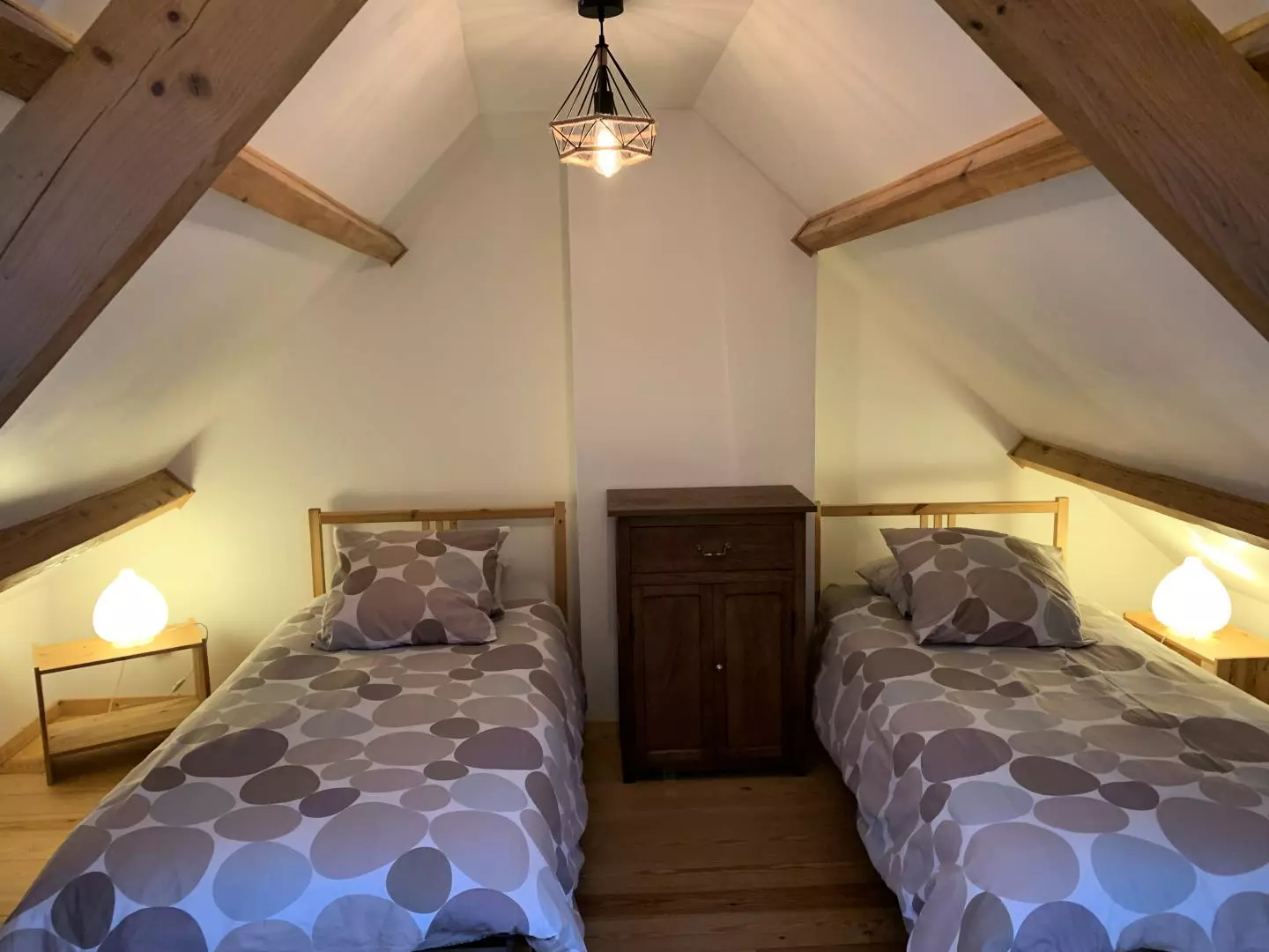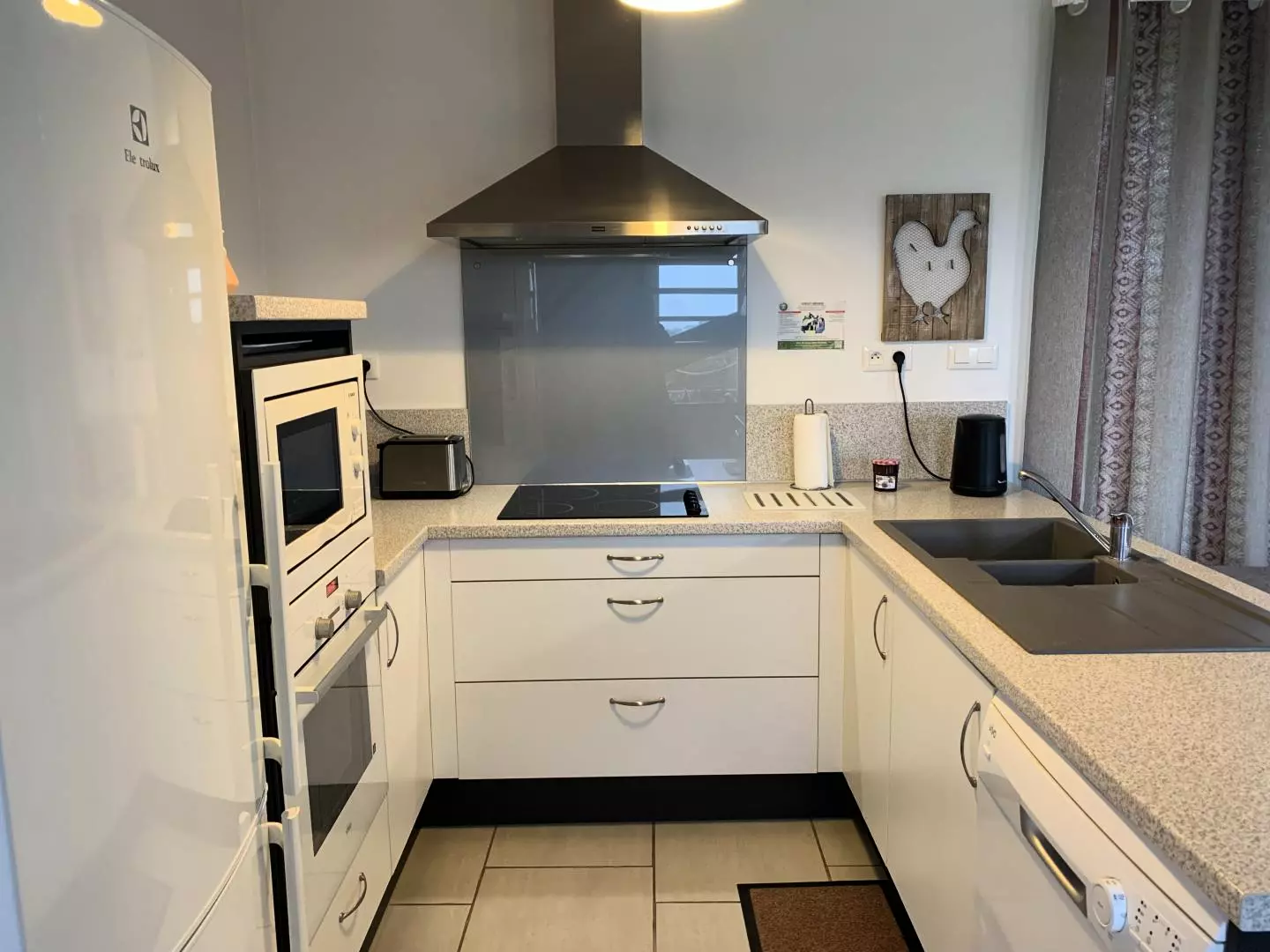Rez-de-chaussée : - cuisine ouverte (plaque vitrocéramique 4 feux, four, micro-ondes, réfrigérateur avec 3 tiroirs congélateur, évier simple bac, lave-vaisselle) donnant sur - salon/salle à manger (convertible 2 places), poêle à bois Godin Colonial, TV et connexion adsl, lecteur DVD, colonne radio (Bluetooth et clé USB),
