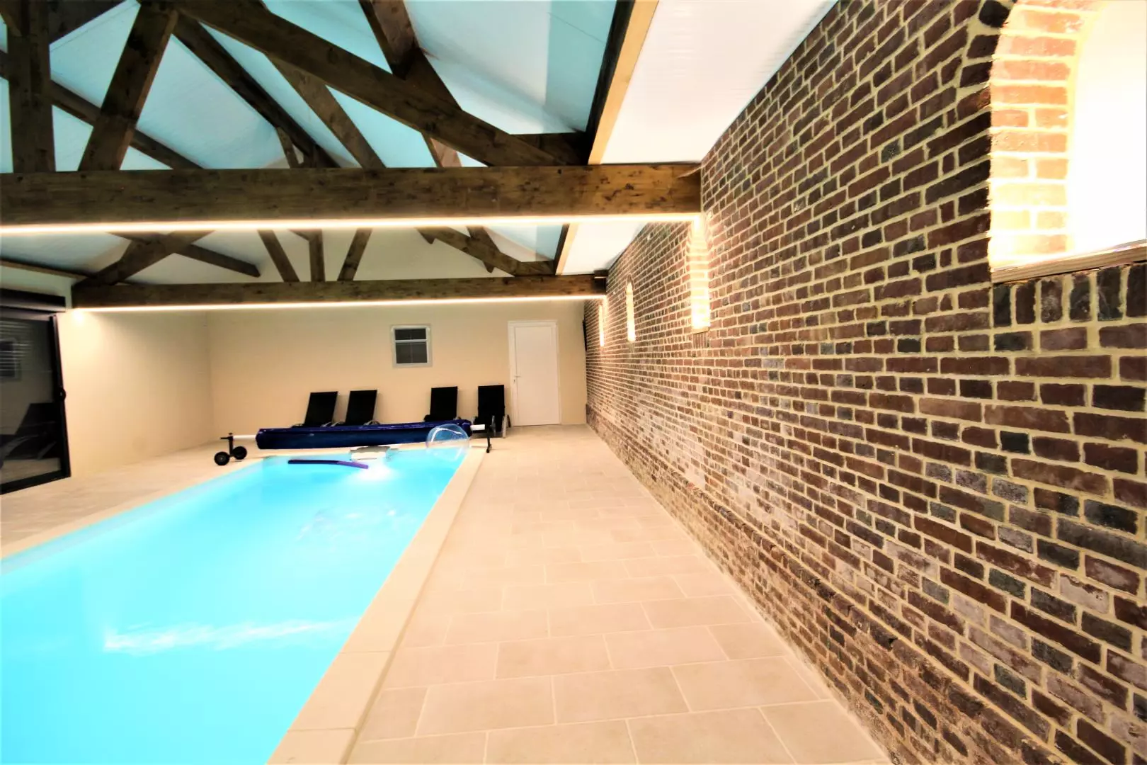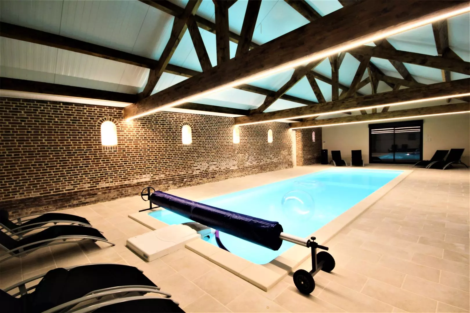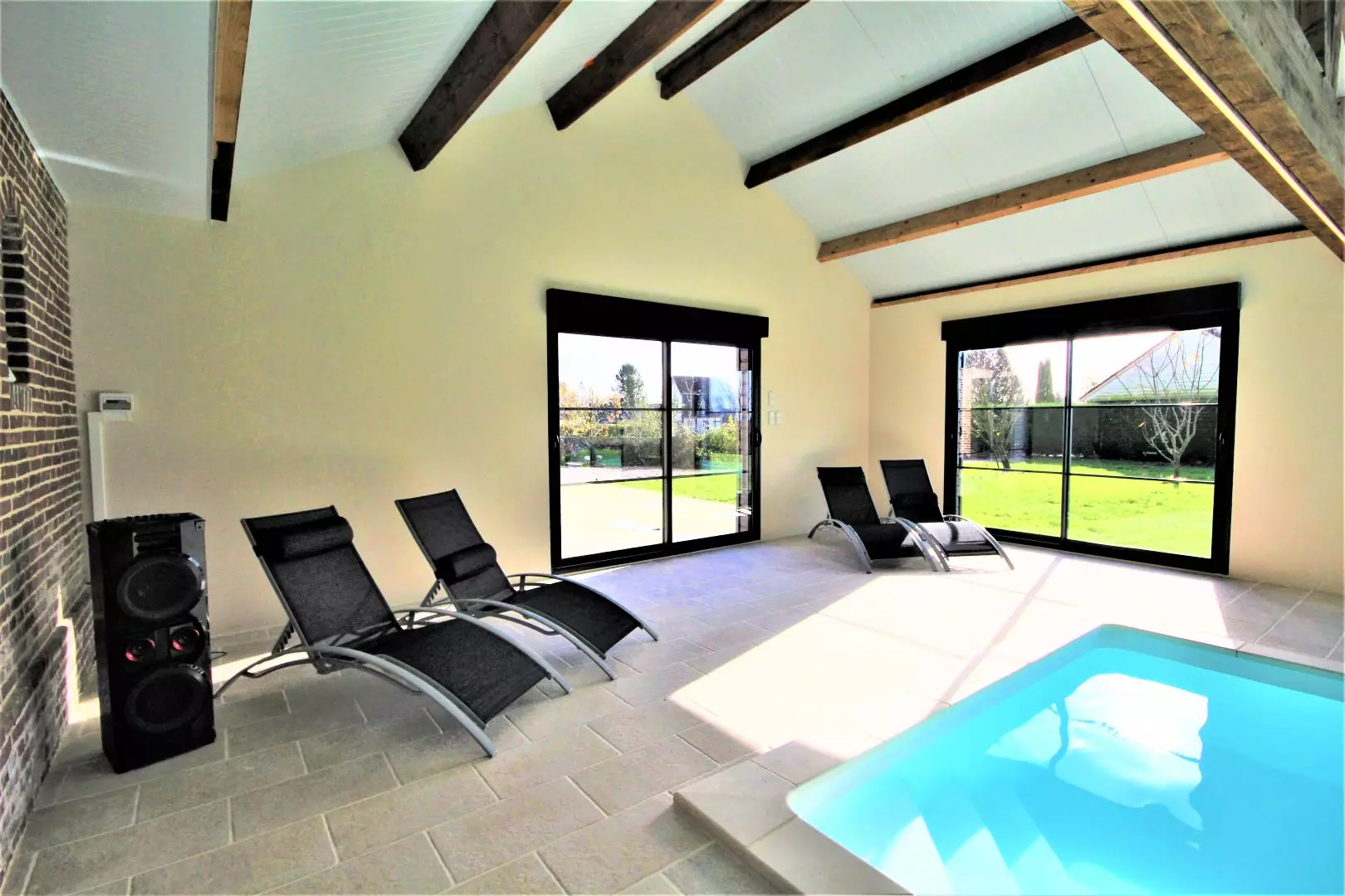 • belle piscine couverte avec grandes baies vitrées, lumières d'ambiance, enceinte Bluetooth et chaises longues pour 9 personnes avec accès direct via le séjour par couloir, douche italienne juste avant l'entrée.
