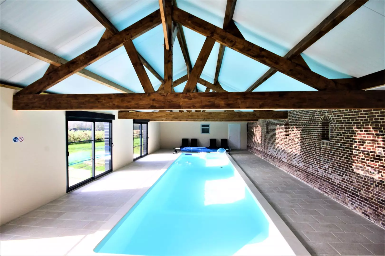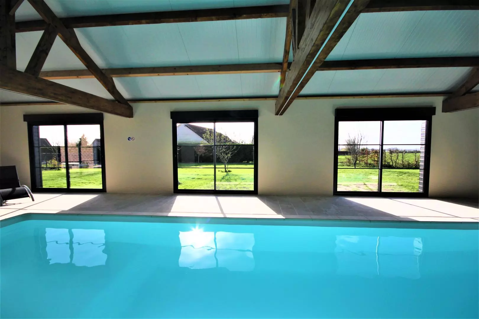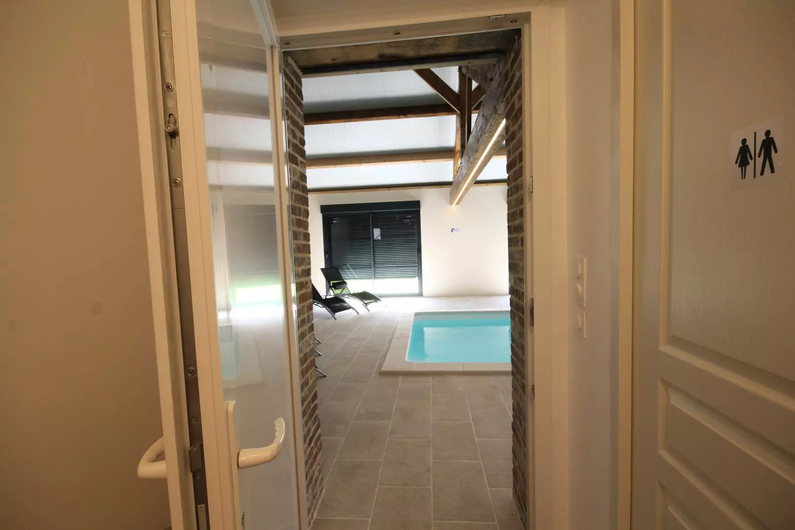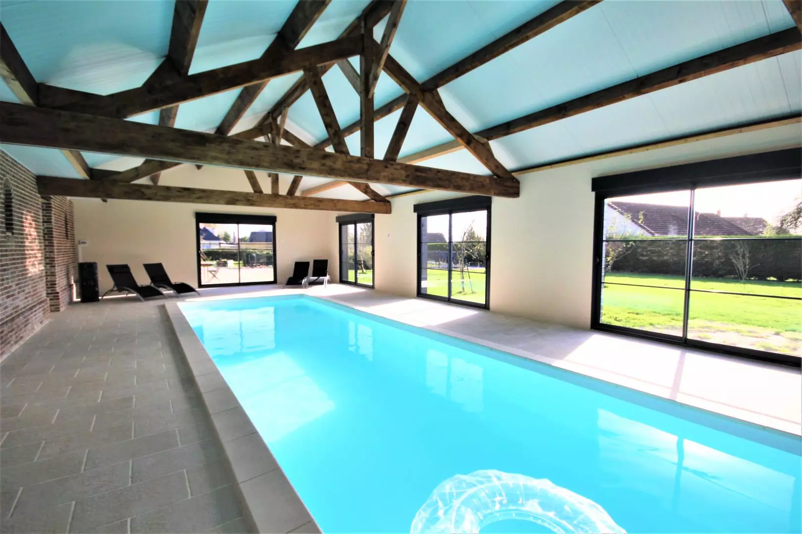 • belle piscine couverte avec grandes baies vitrées, lumières d'ambiance, enceinte Bluetooth et chaises longues pour 9 personnes avec accès direct via le séjour par couloir, douche italienne juste avant l'entrée.