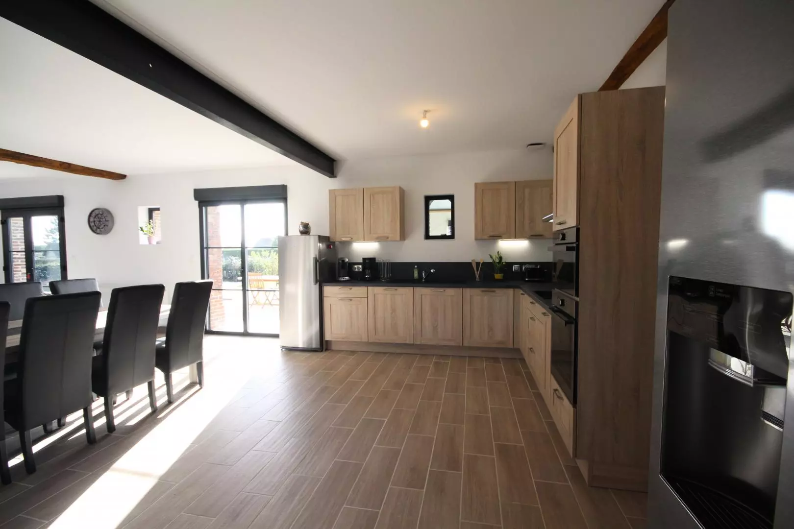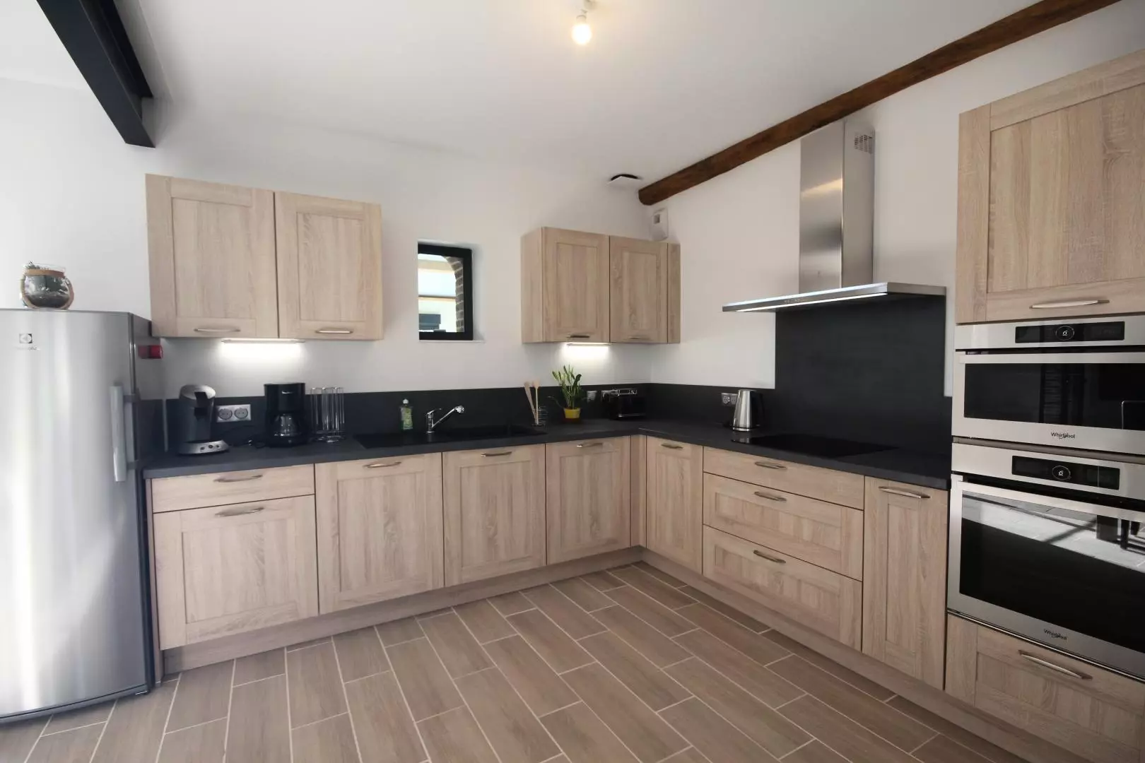 • cuisine toute équipée ouverte sur séjour (frigo américain, lave-vaisselle, cafetière à filtre et à dosettes Senséo, bouilloire, four encastré, frigo d'appoint supplémentaire etc.),
