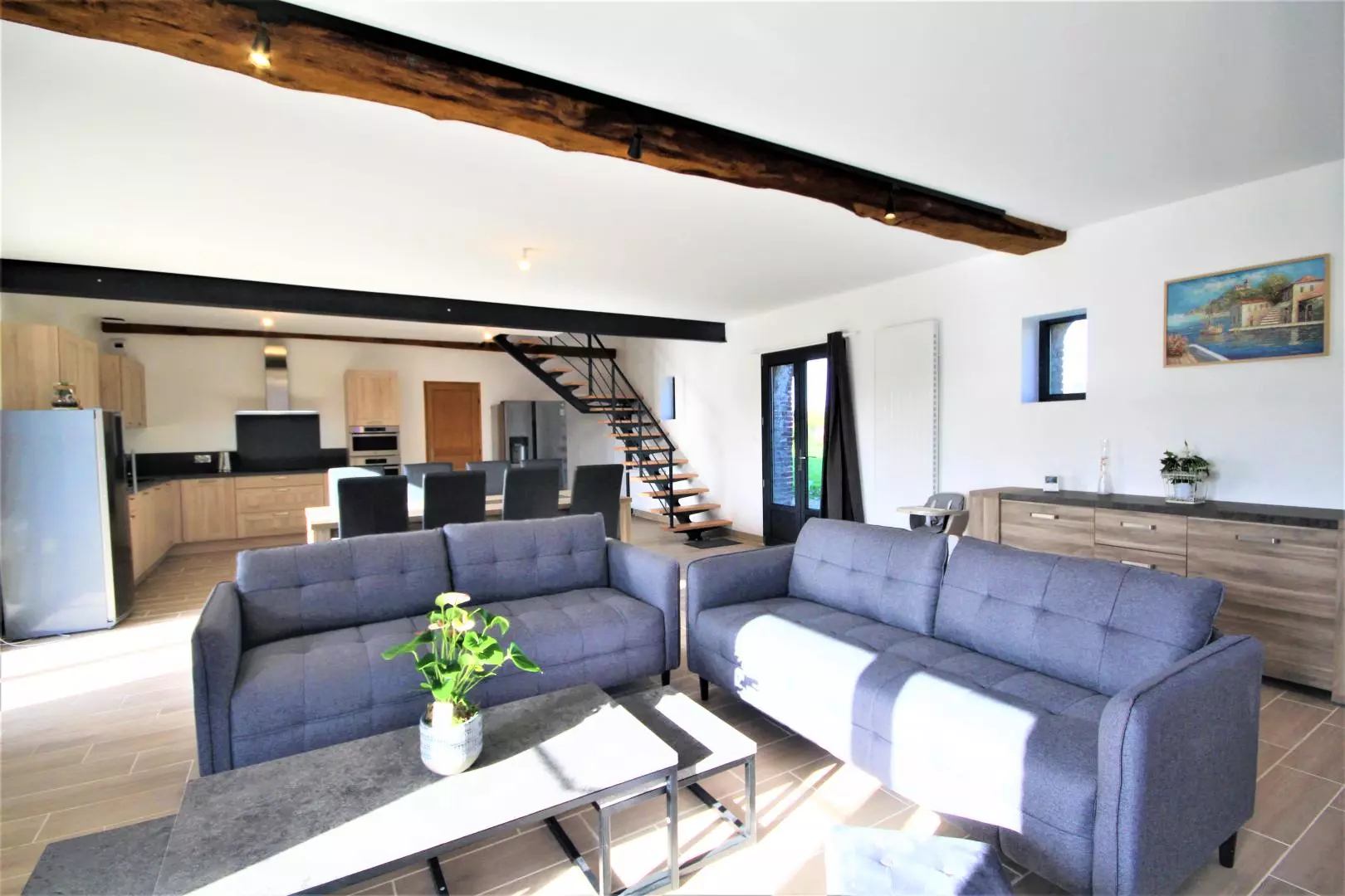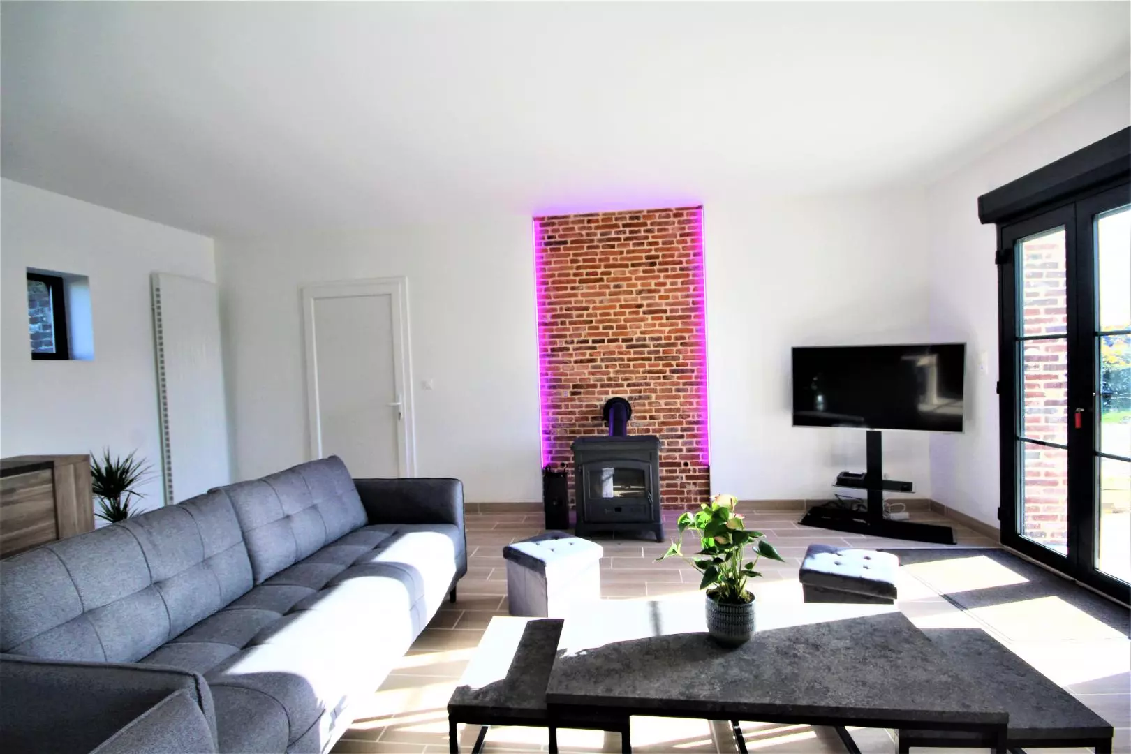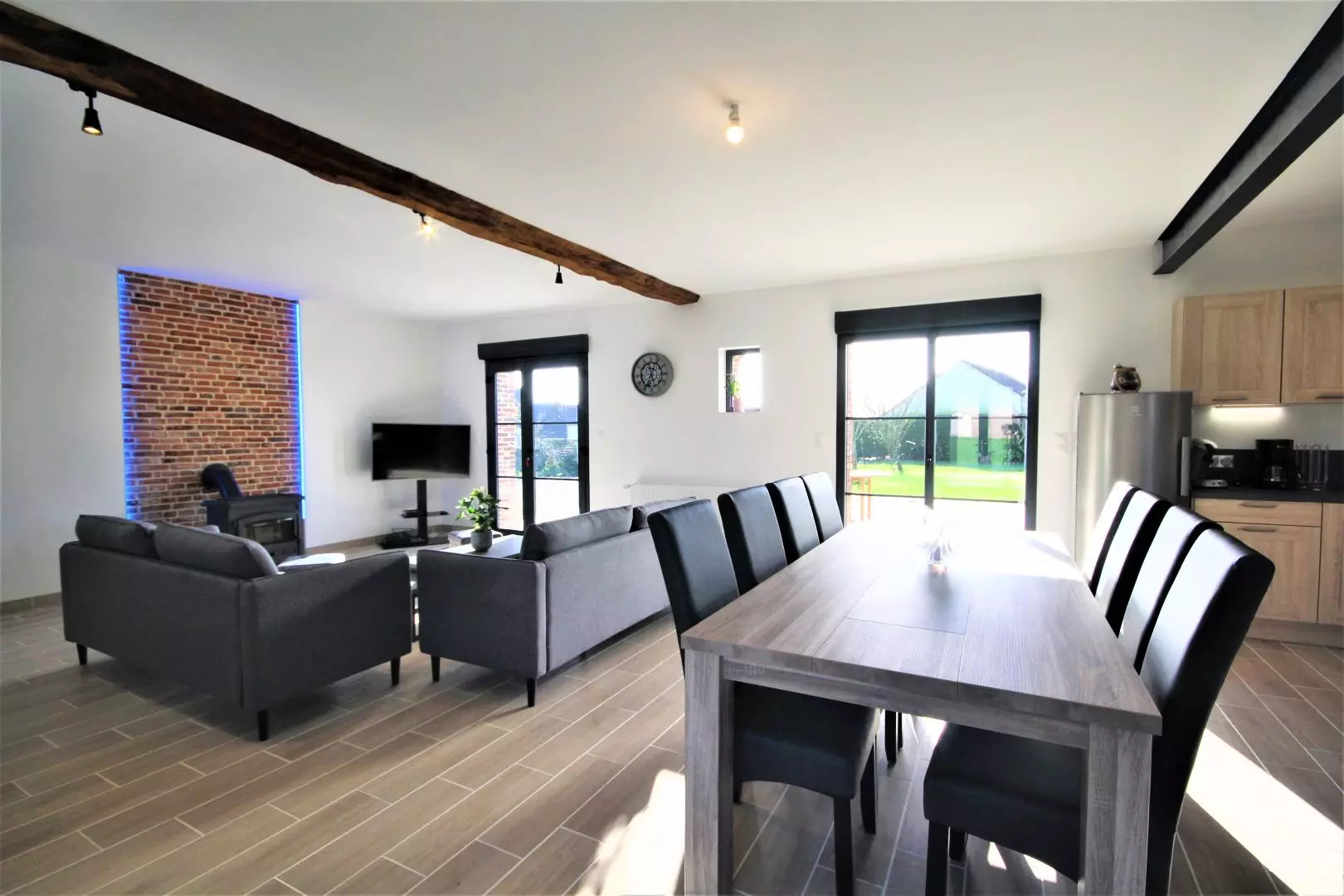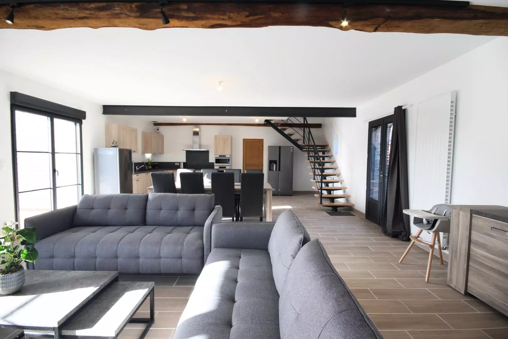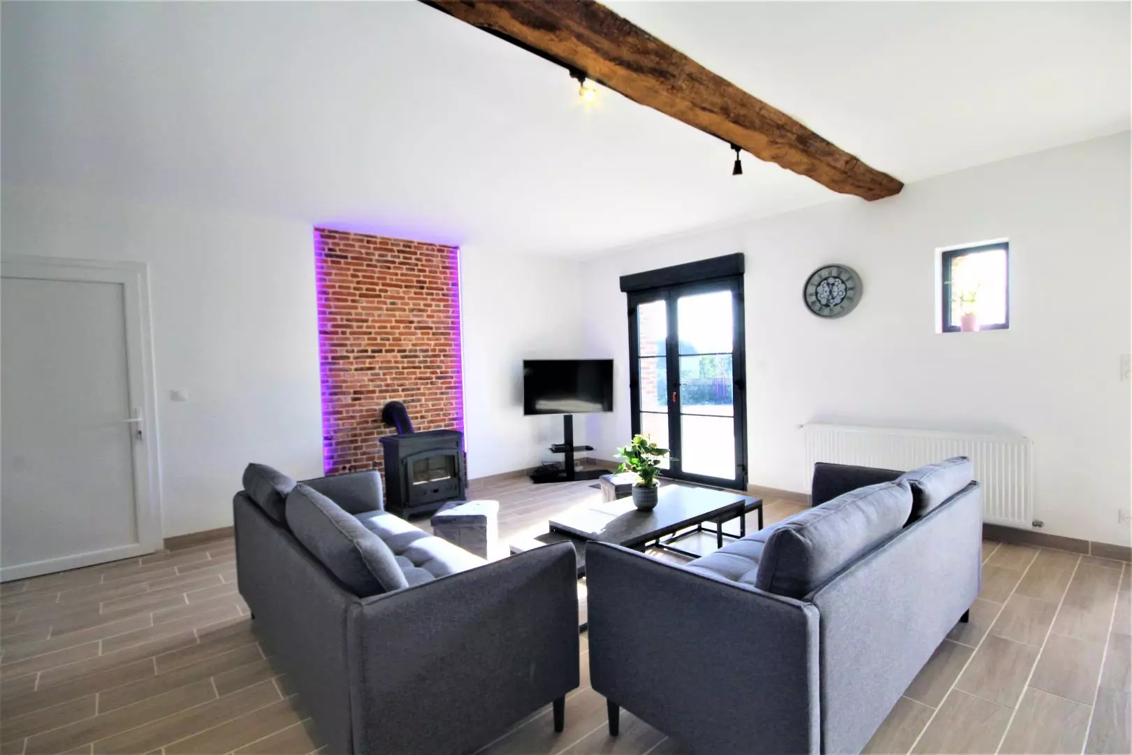 • séjour/salon moderne et lumineux avec canapés, TV écran plat, poêle à bois et accès Netflix avec vos propres codes,
