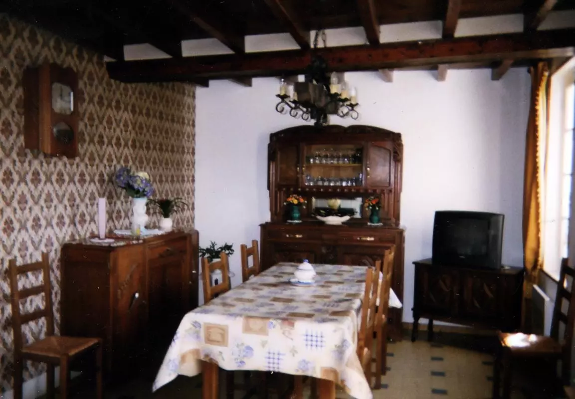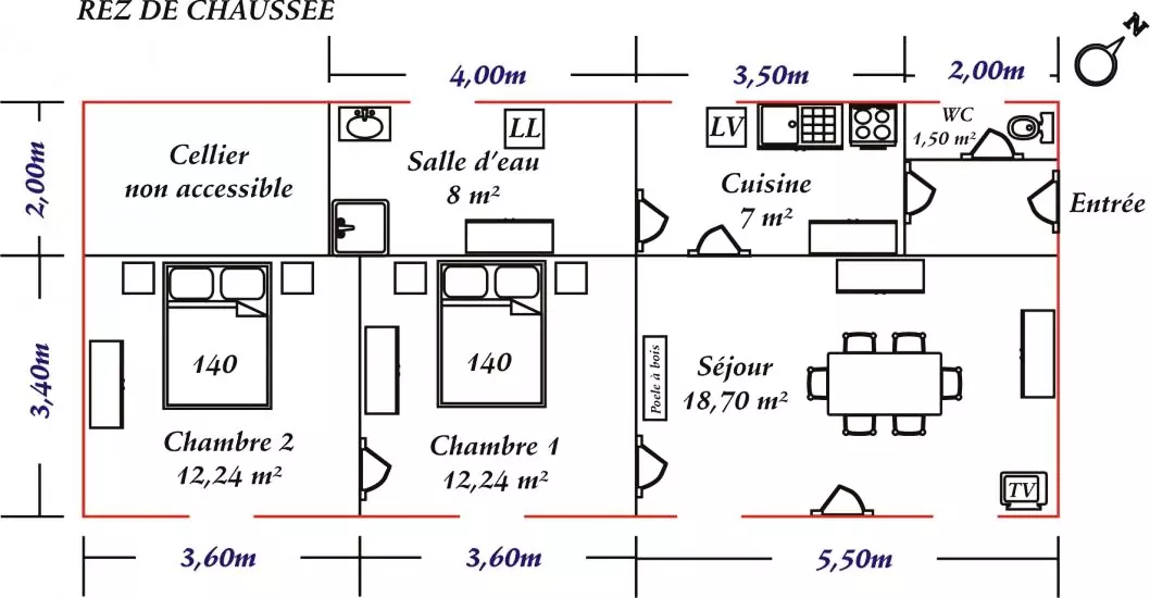 Plain-pied : - entrée, - cuisine (lave-vaisselle, mini four, réfrigérateur/congélateur, micro-ondes), - salle à manger avec canapé clic-clac, TV, poêle à bois, - salle d'eau (lave-linge), - wc séparé, - 2 chambres en enfilade avec 1 lit 2 personnes dans chaque chambre.