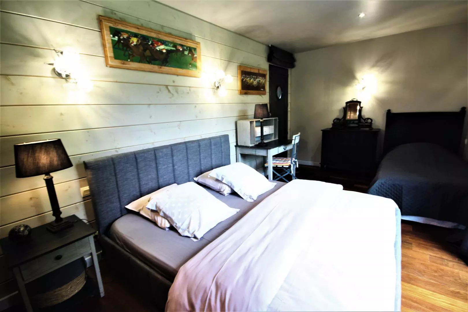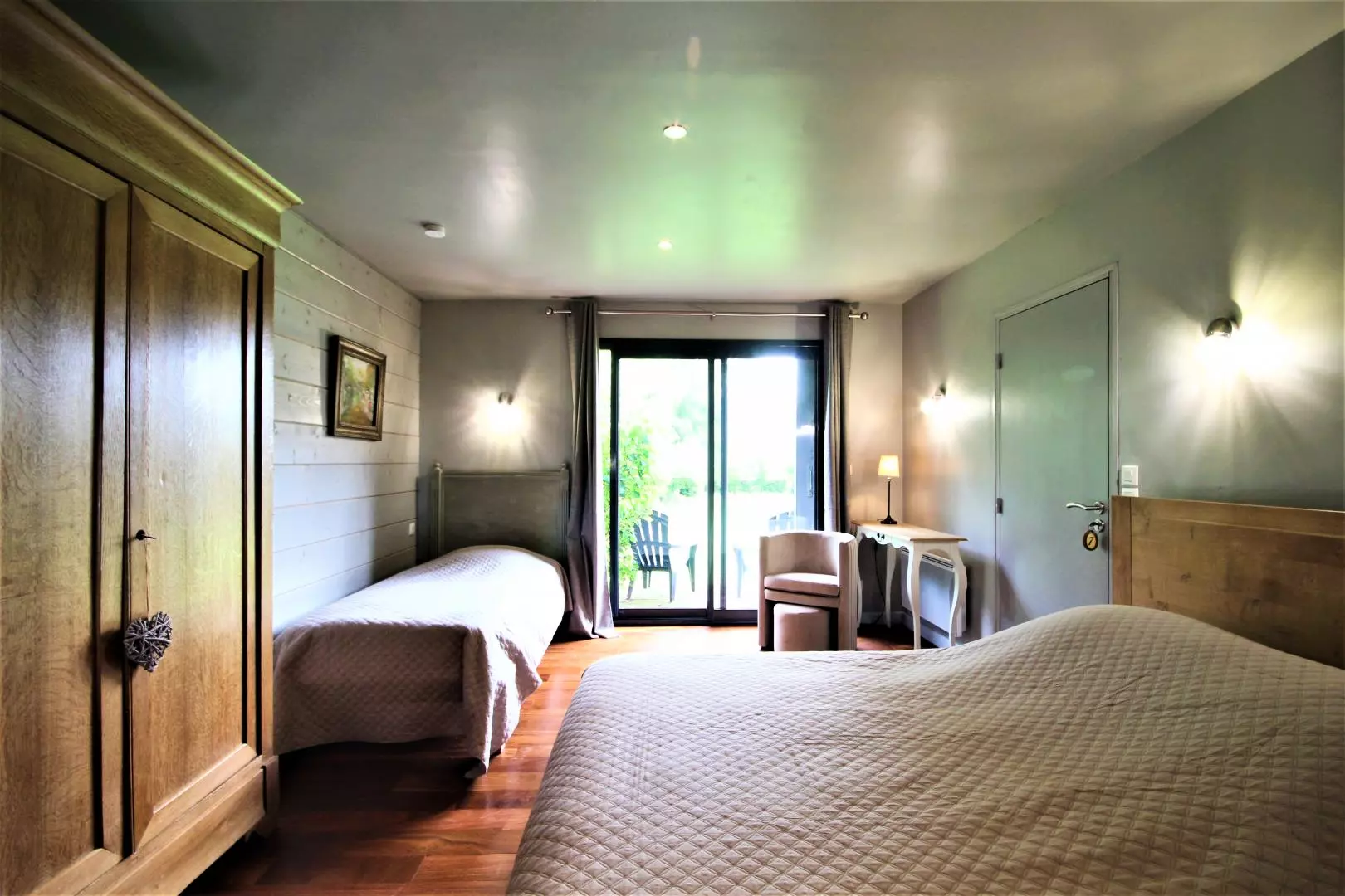 • Spacieuse chambre familiale 3 personnes avec TV, lit double (160x200cm) , lit simple (90x190cm) et belle terrasse avec salon de jardin, chaises longues et barbecue donnant sur un vaste jardin arboré.