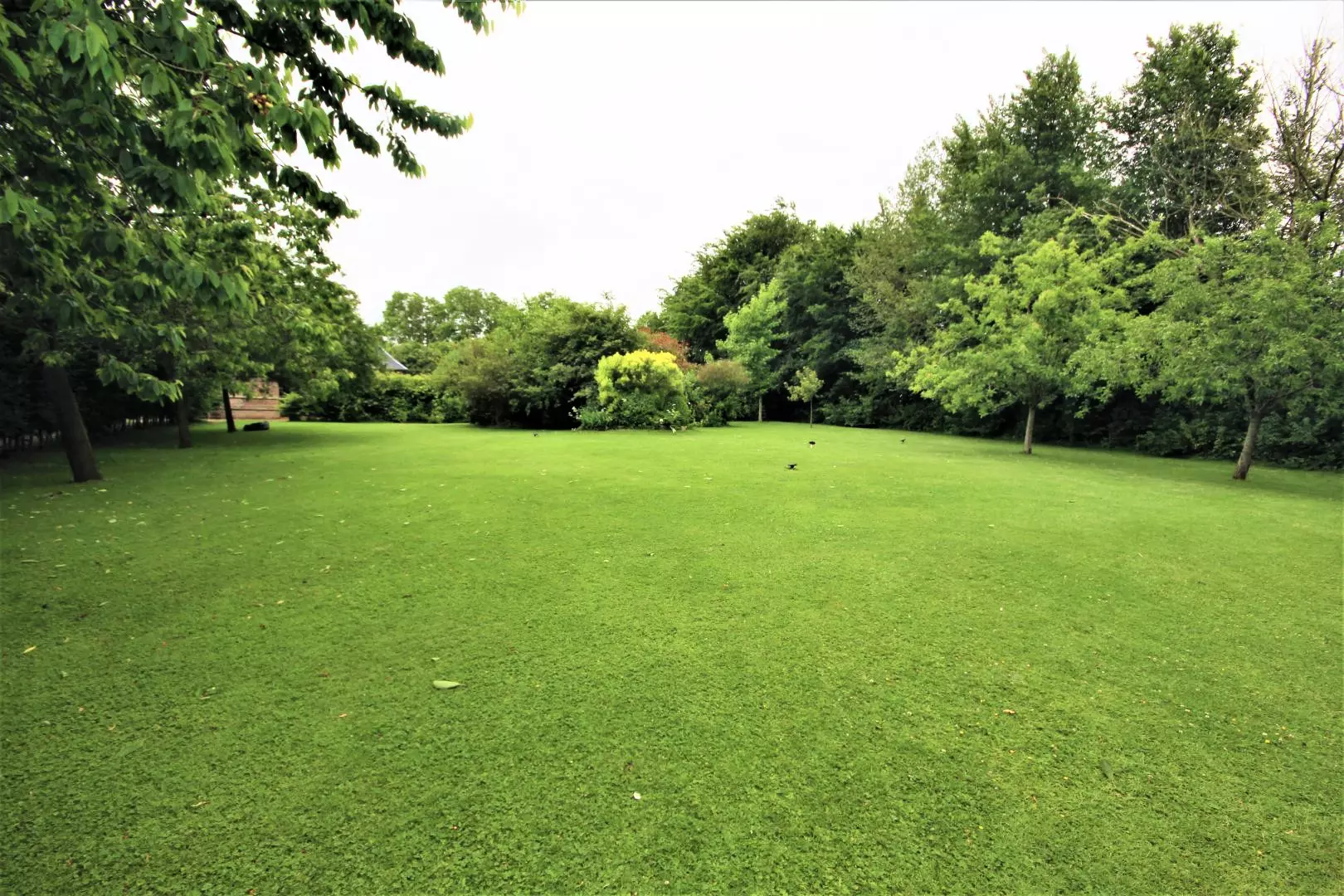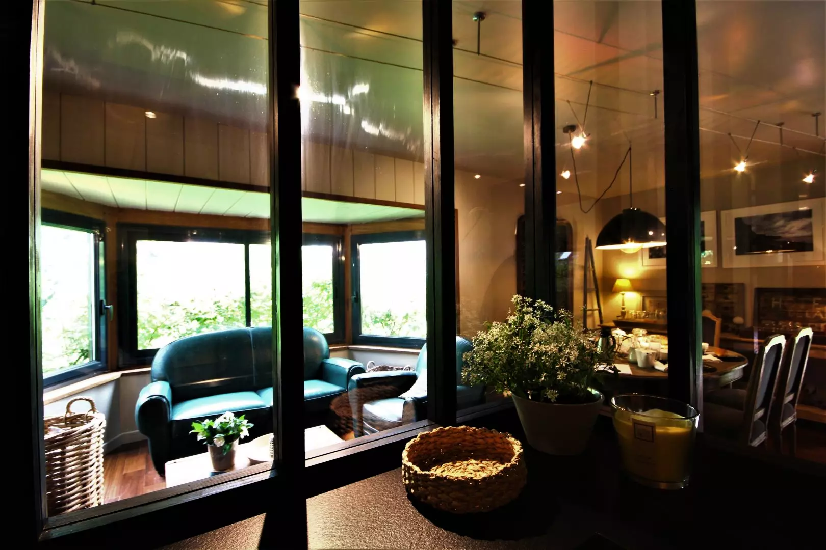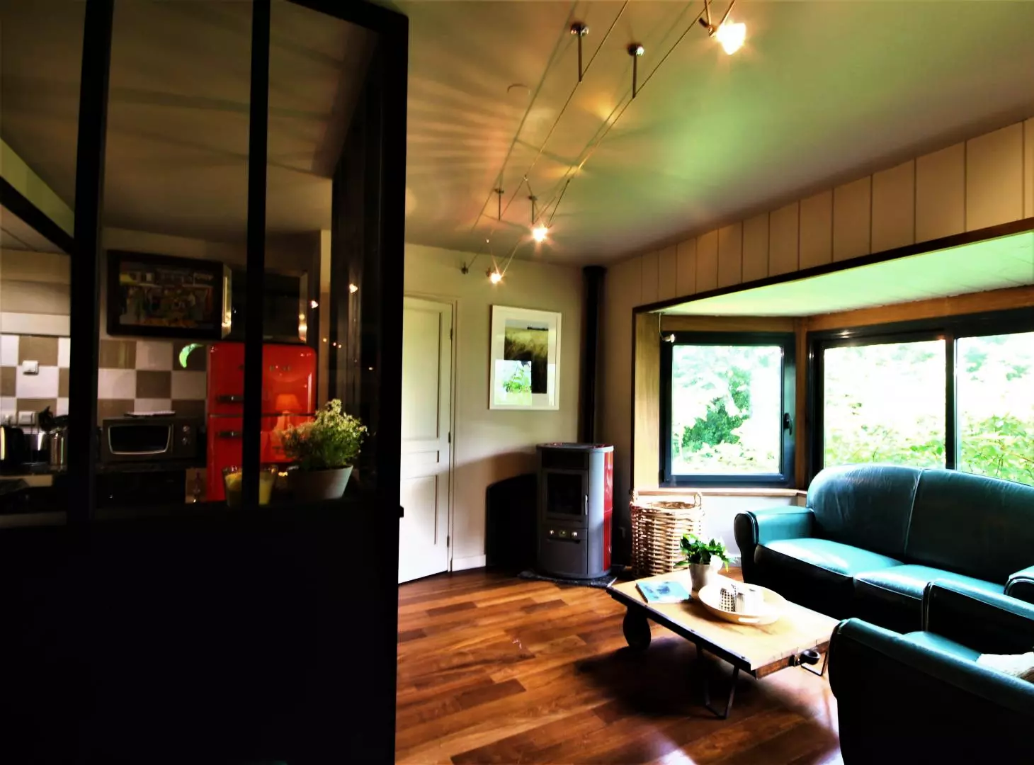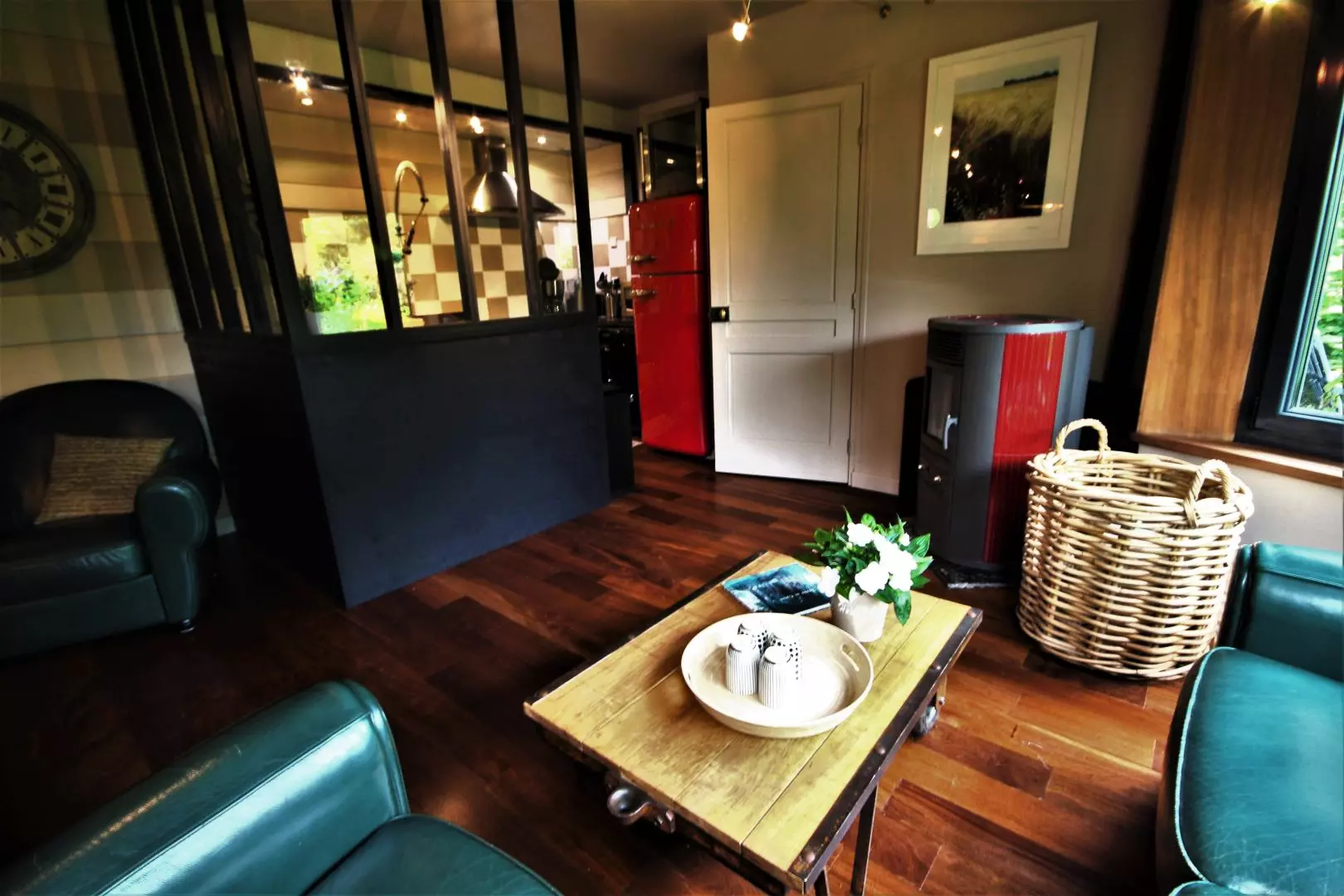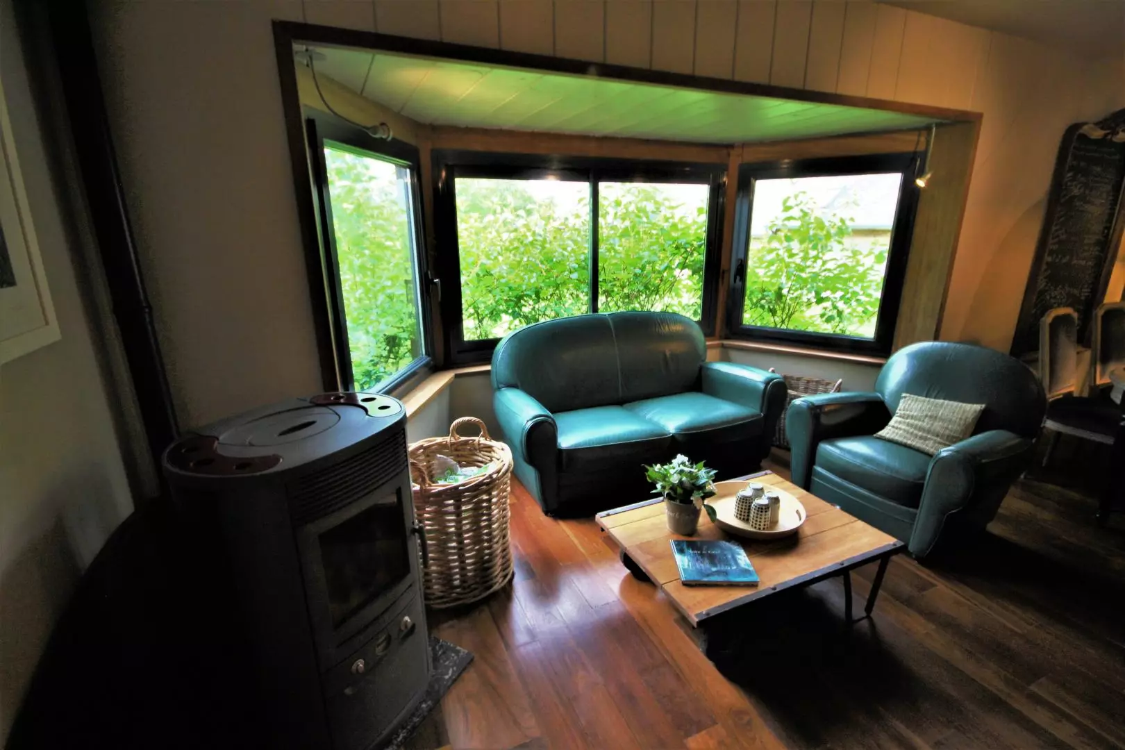 • Séjour avec canapés et fauteuils, poêle à bois et fenêtre type "Bow-window" offrant une vue dégagée sur le jardin arboré,