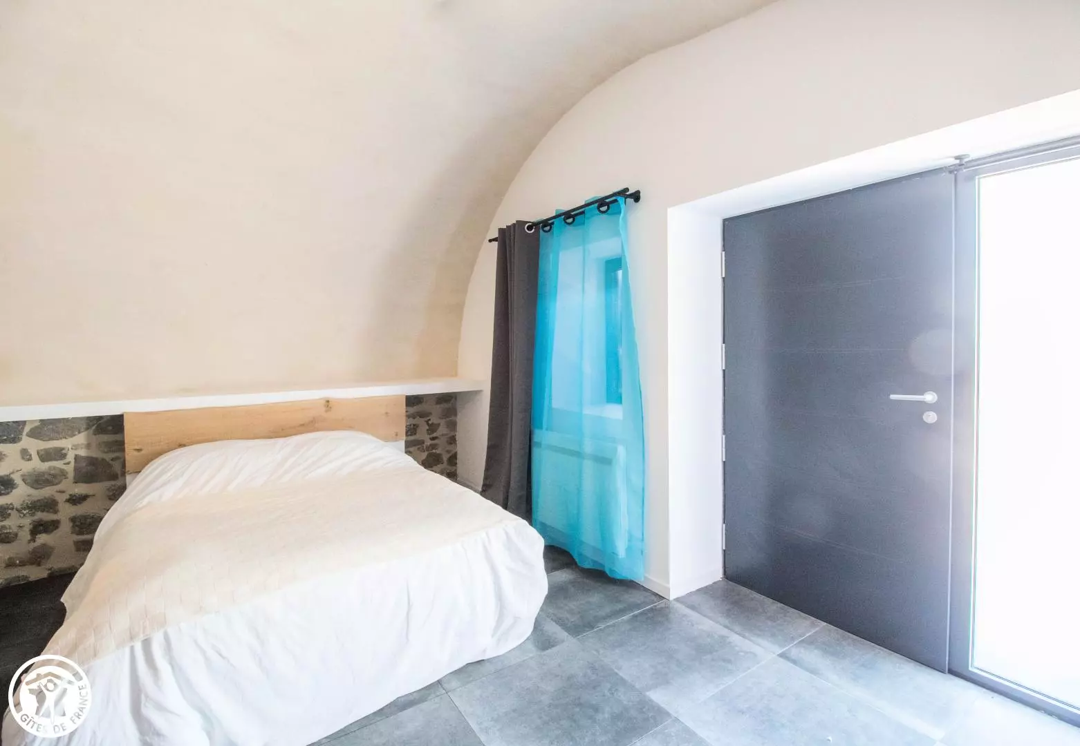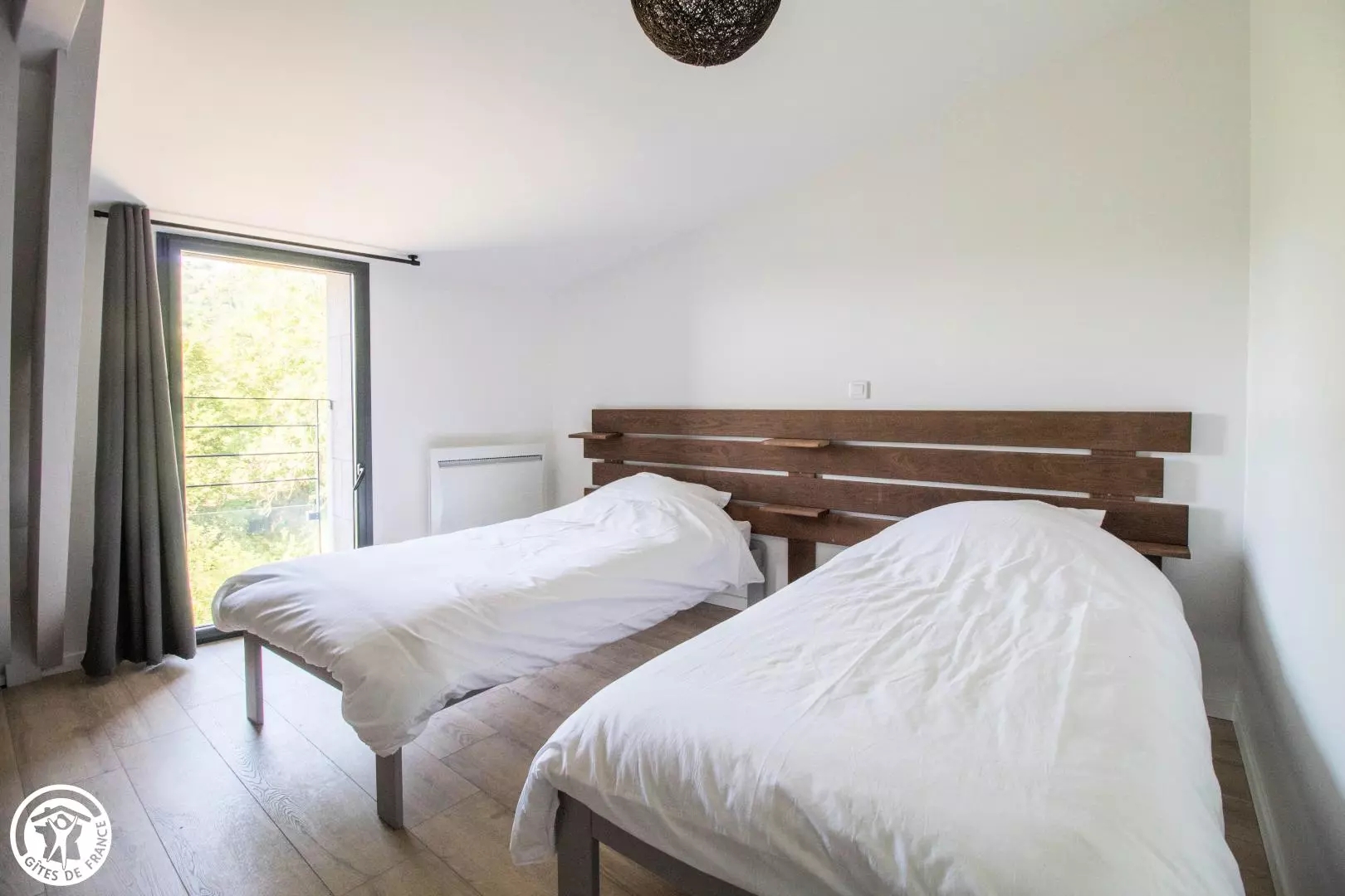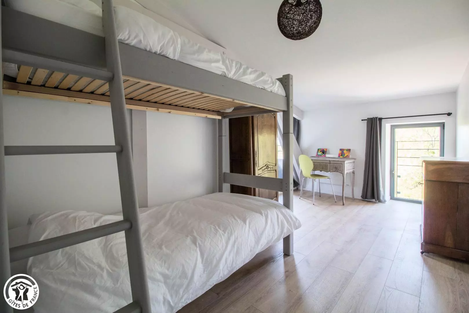 -d'une chambre avec un lit 160 et accès terrasse -d'une chambre avec deux lits 90 superposés (le lit du haut est interdit aux enfants de moins de 6 ans)