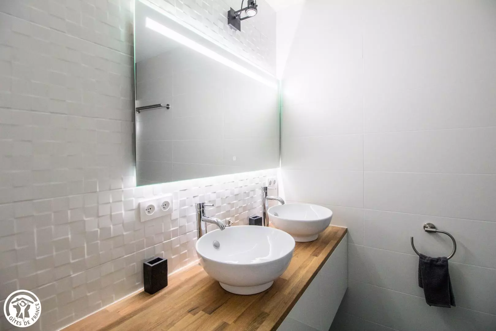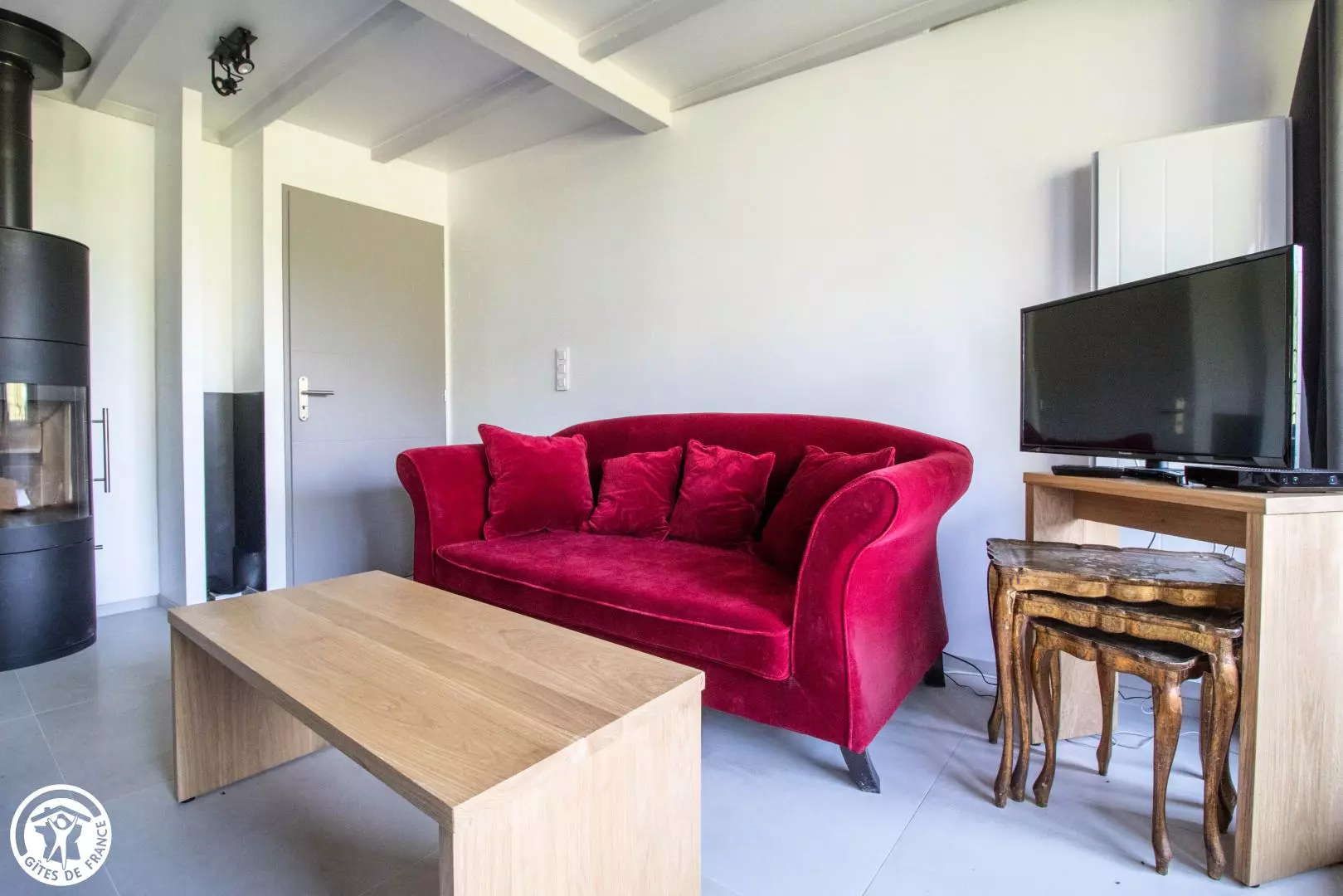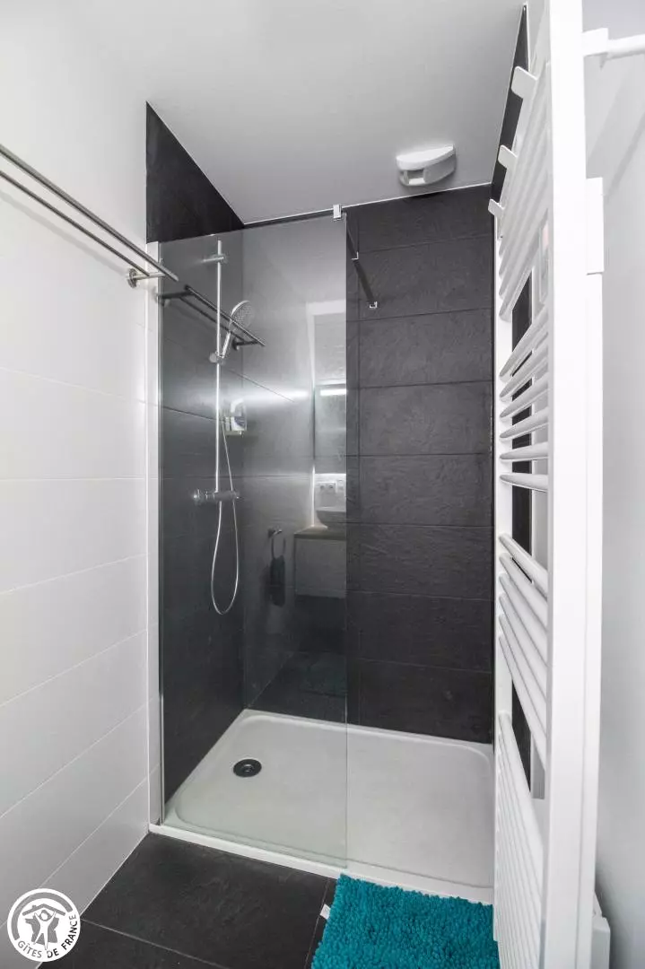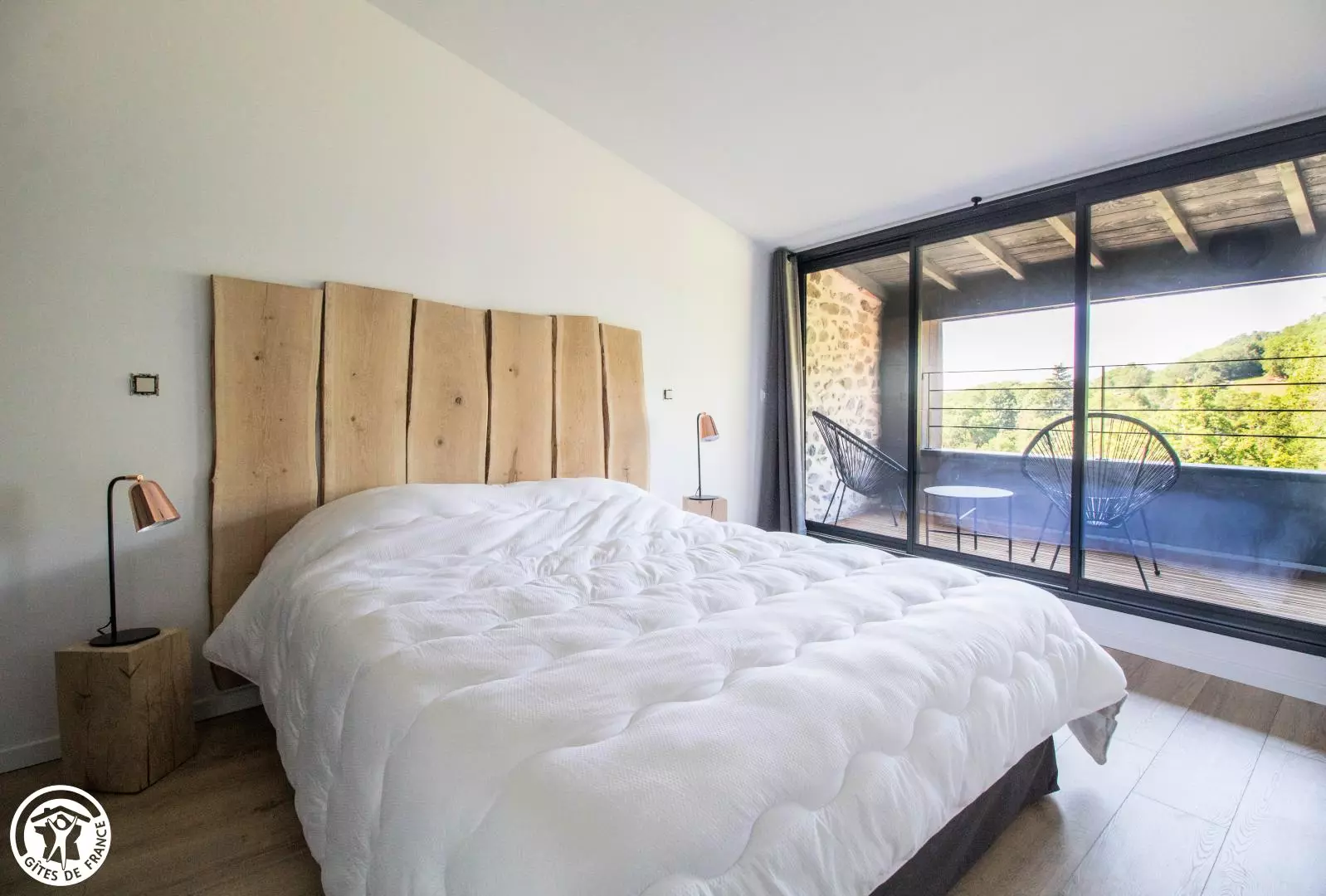 -d'une chambre avec un lit 160 et accès terrasse -d'une chambre avec deux lits 90 superposés (le lit du haut est interdit aux enfants de moins de 6 ans)