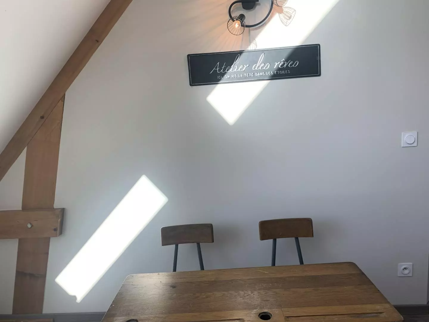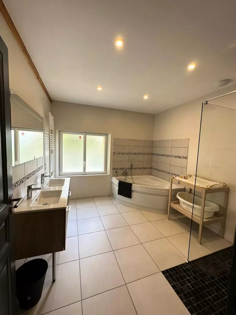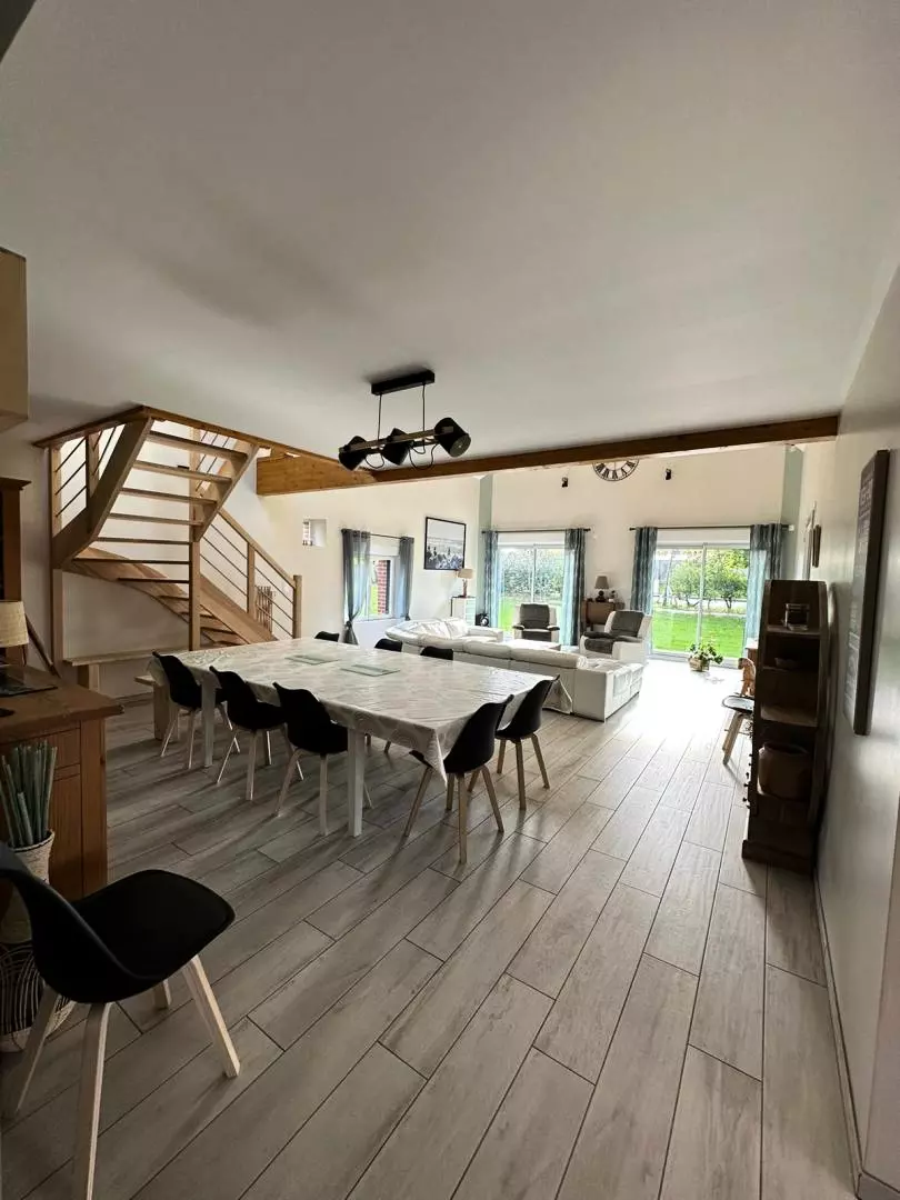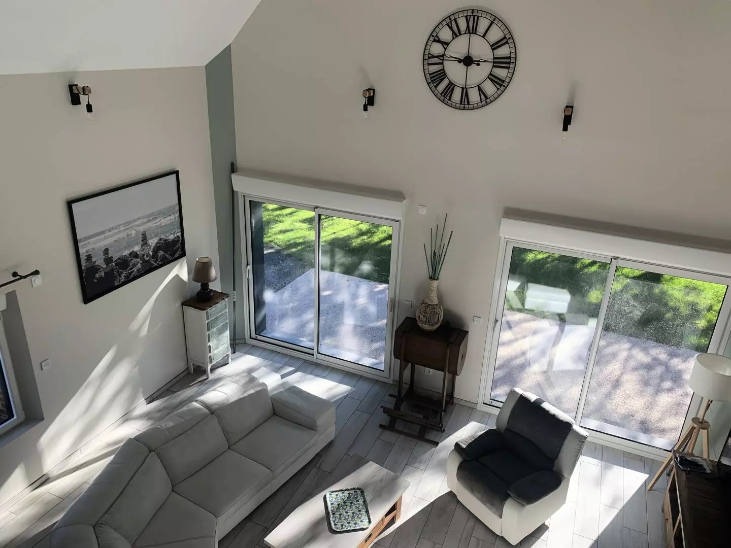 Rez-de-chaussée : - salle à manger/salon lumineux avec grandes baies vitrées, TV, enceinte bluetooth,