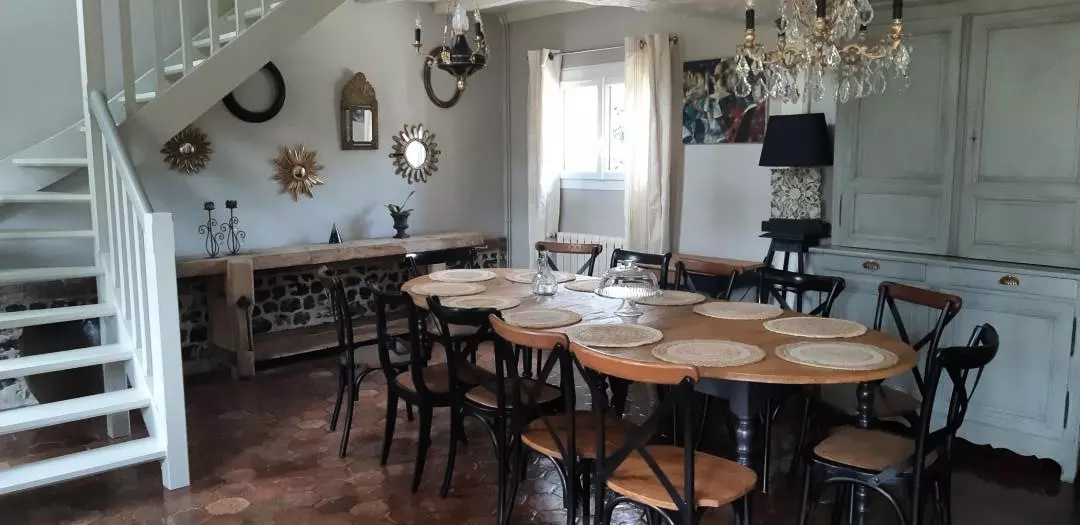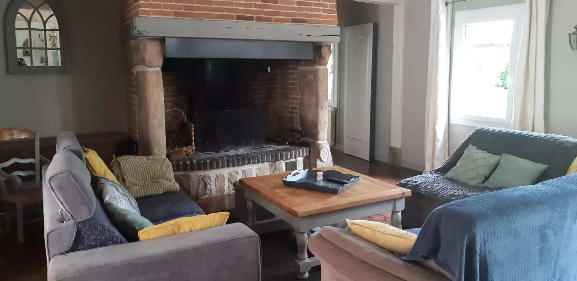 • Pièce de vie lumineuse : vaste salon/salle à manger avec grande table repas, canapés, TV écran plat connectée et cheminée,