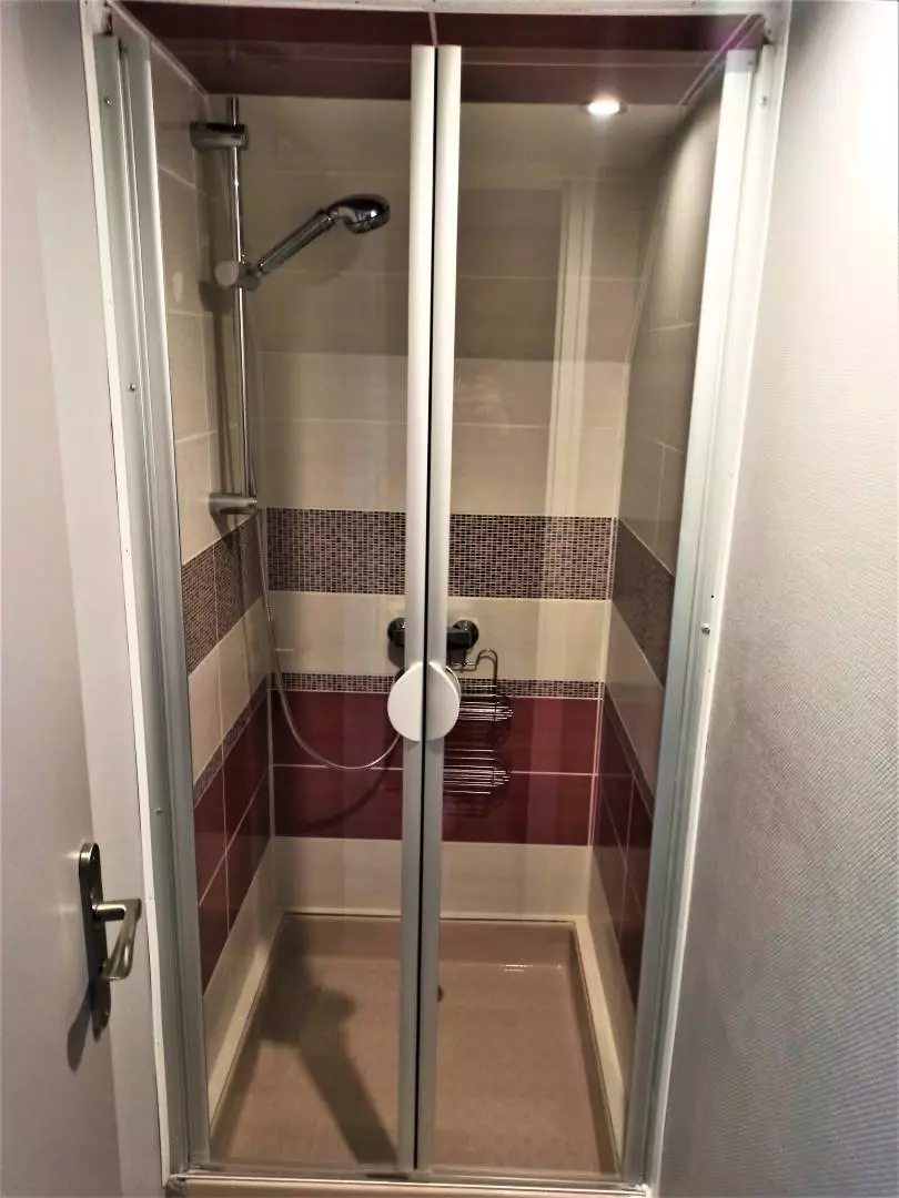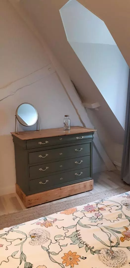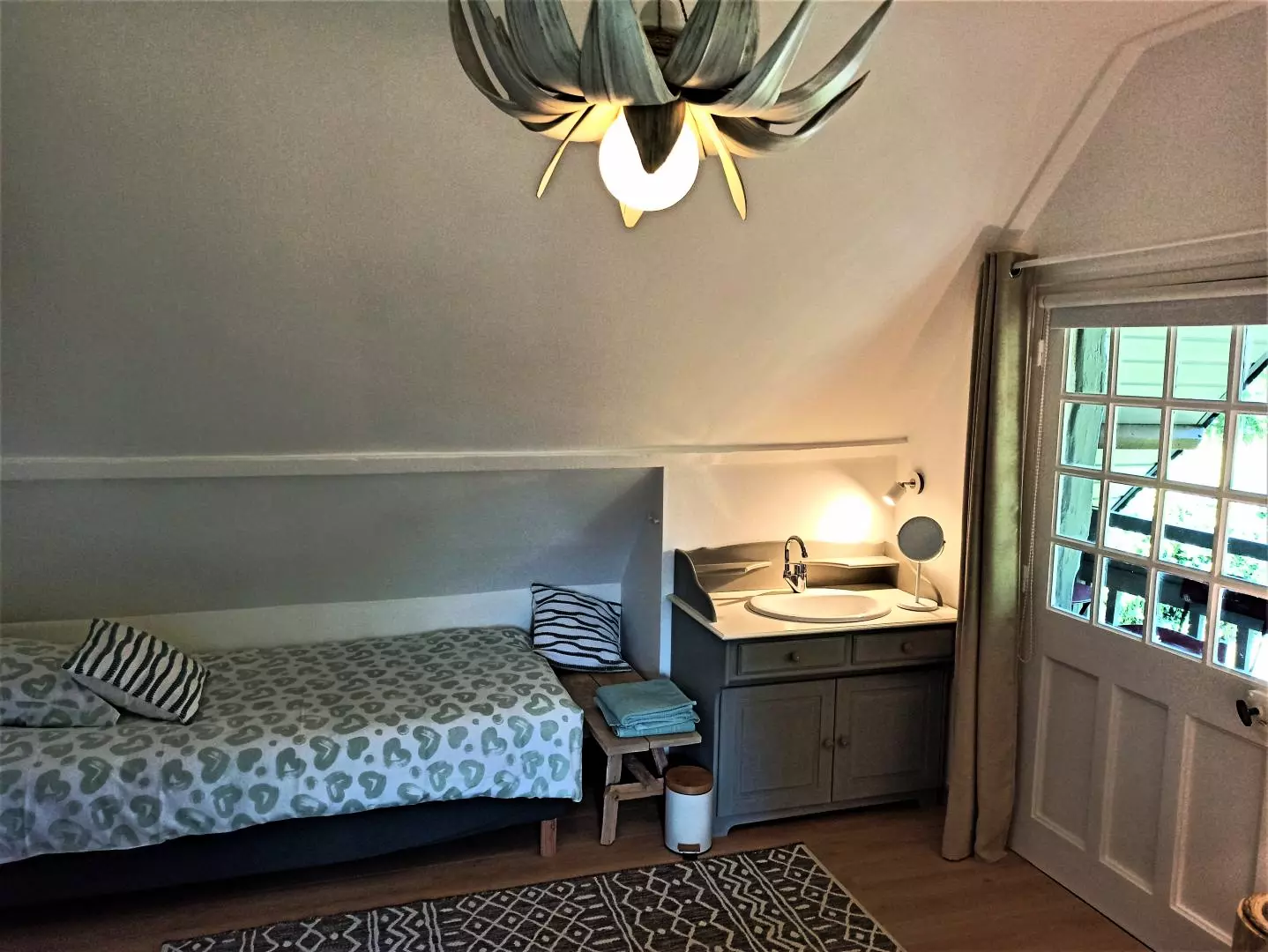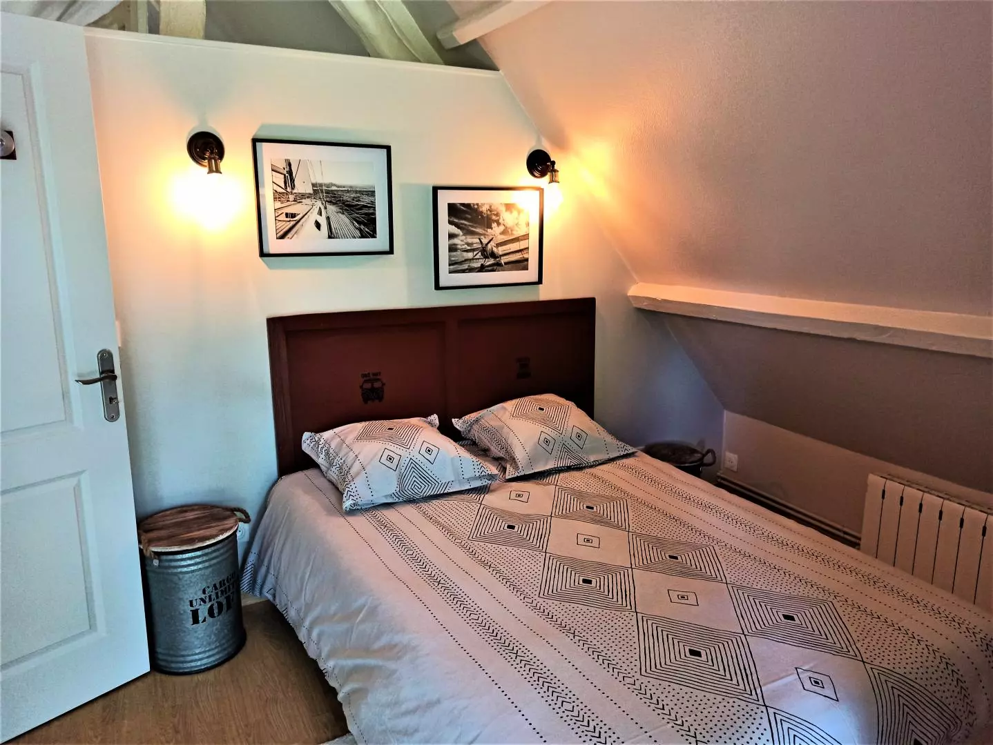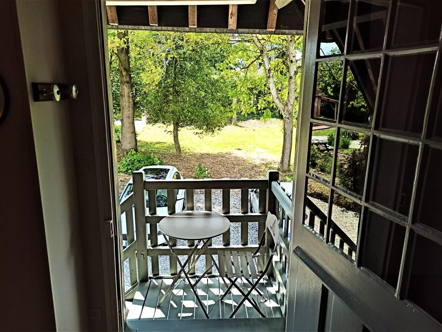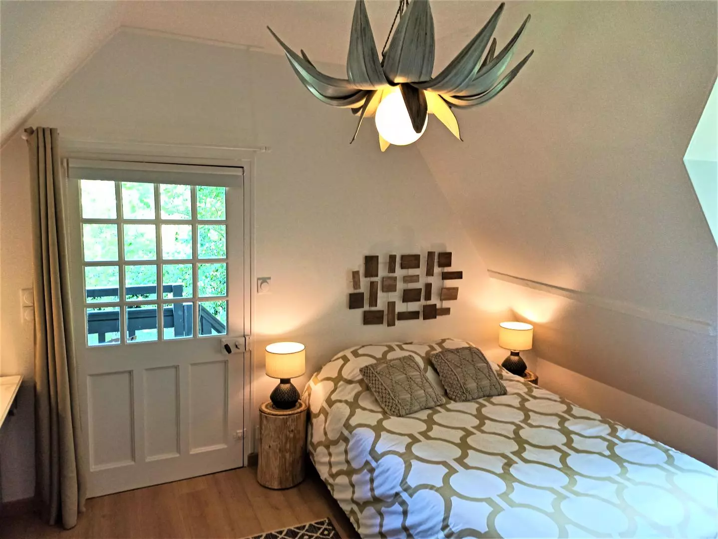 • Chambre 3 personnes en mezzanine : 1 lit 140x190cm et lit 90x190cm (pièce fermée avec porte), petit balcon avec table et accès indépendant escalier,