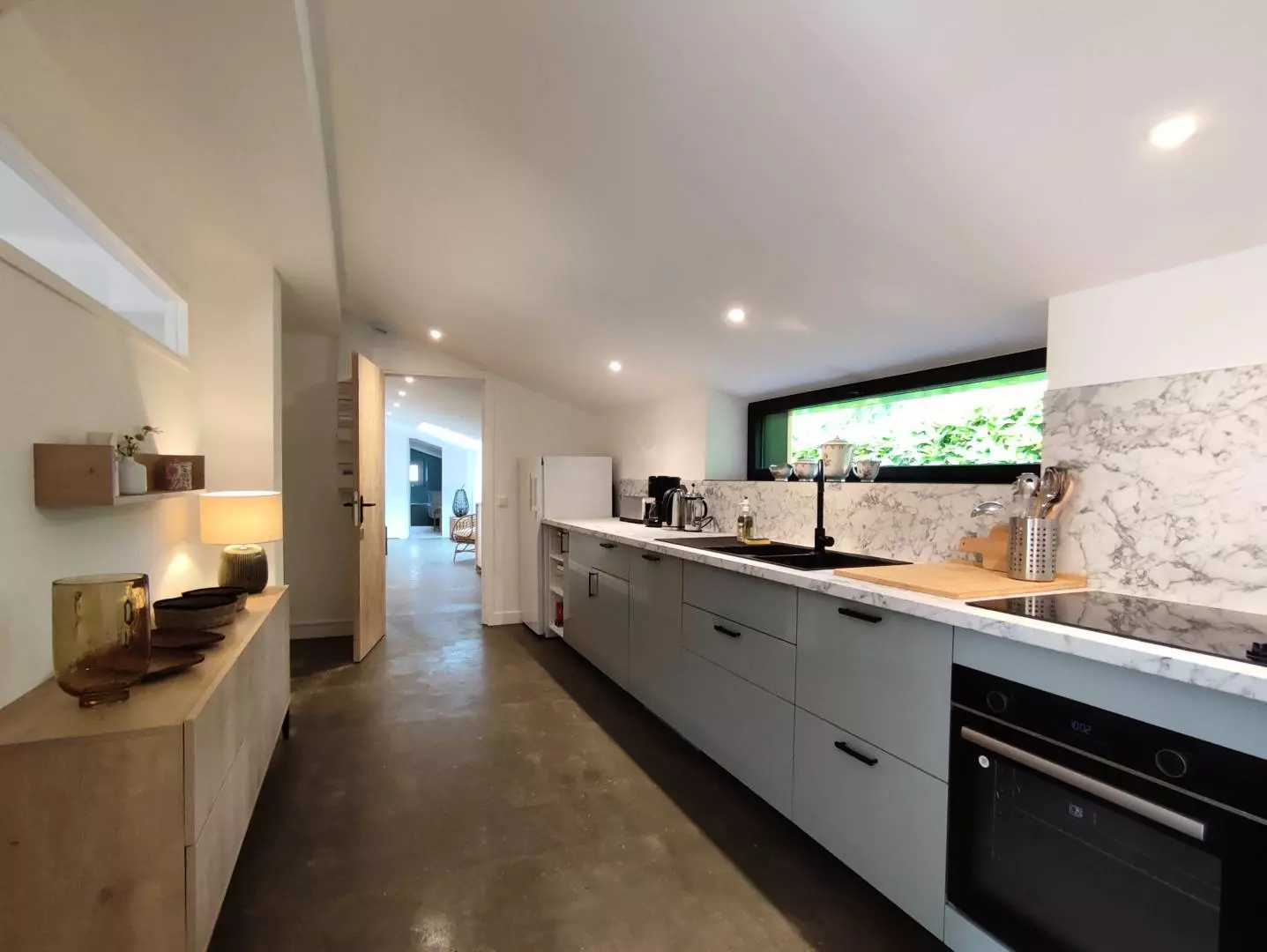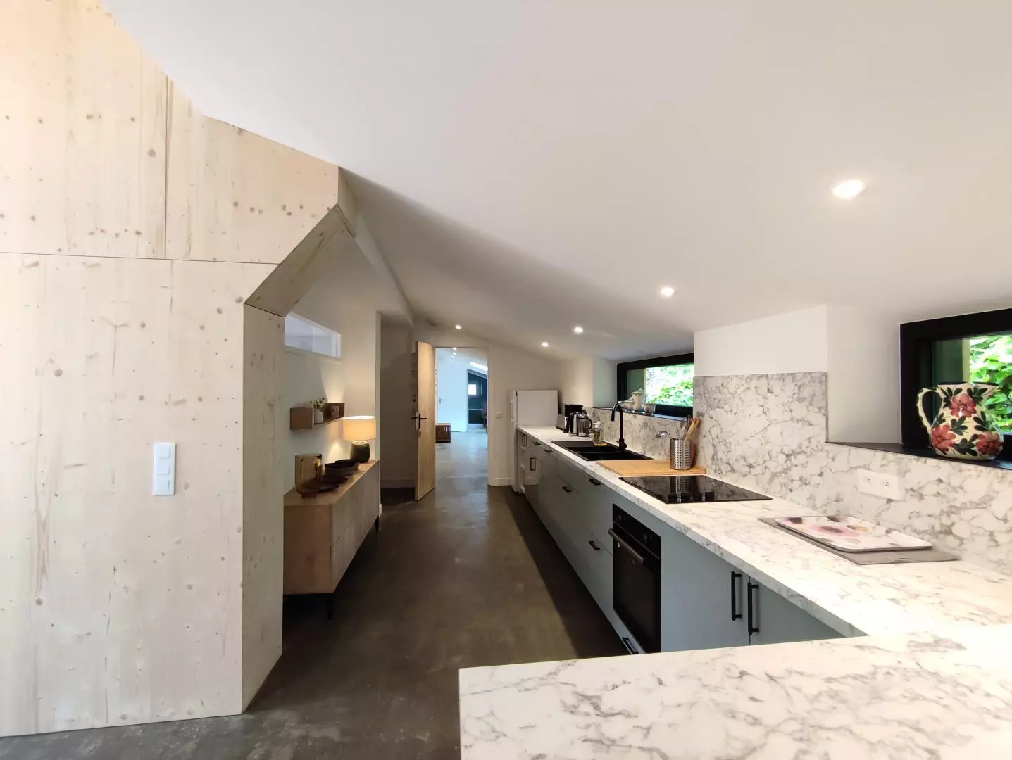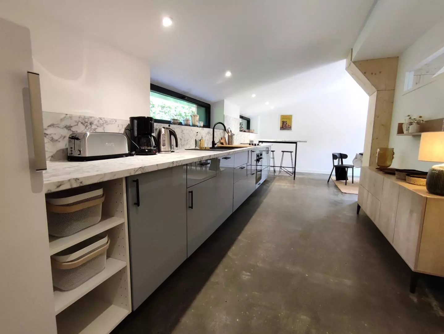 • cuisine [18,57m²] ouverte (réfrigérateur, congélateur, évier 2 bacs, lave-vaisselle, plaque vitrocéramique 4 feux, mange-debout avec 2 tabourets hauts),