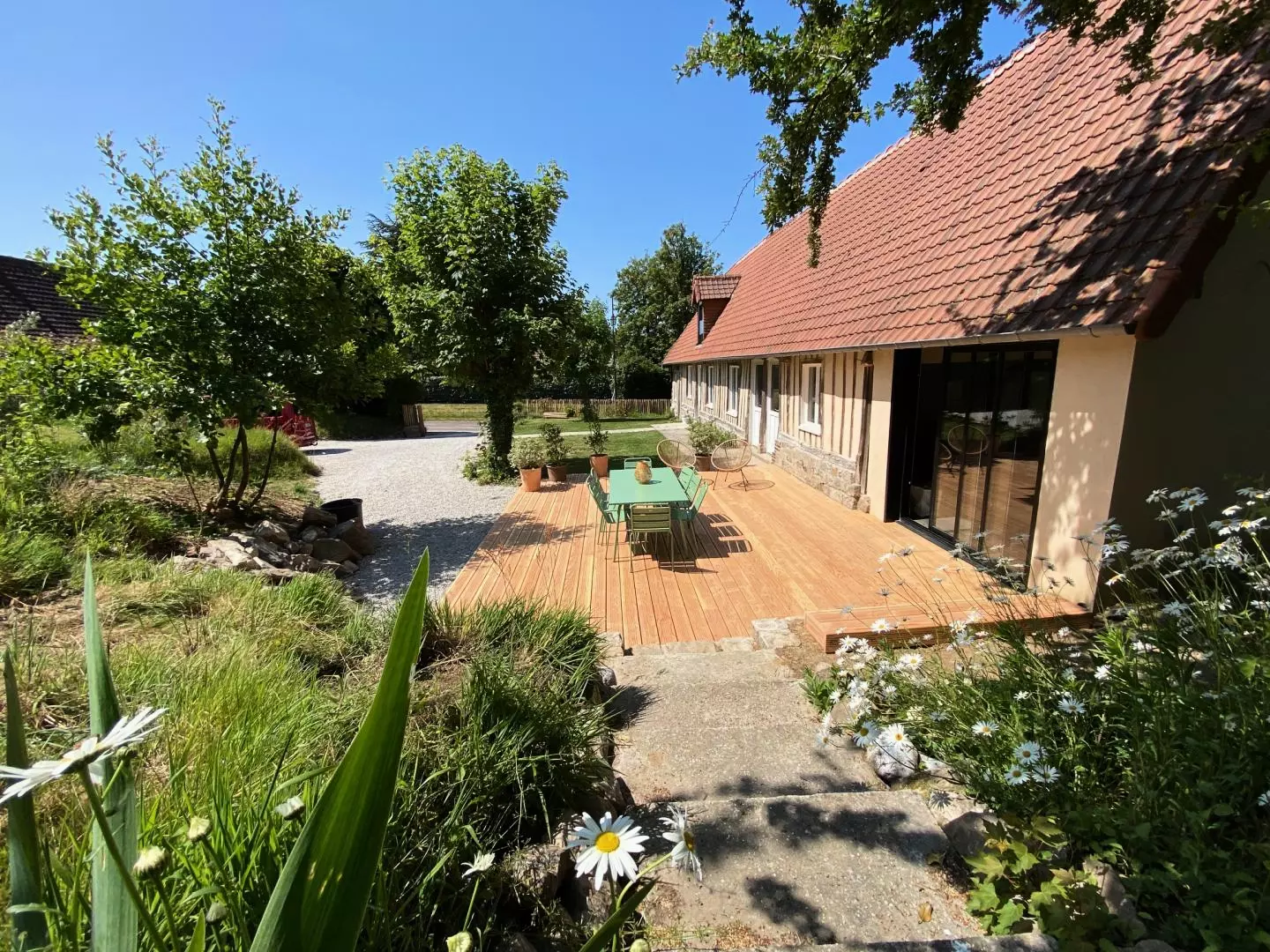 Extérieur : jardin "terrasse" clos par de la ganivelle (petite clôture en bois) : les chiens devront rester sous surveillance. Cette jolie longère normande entre mer et campagne, à 10 minutes de la mer à pied (plage, restaurants, pêcheurs) a été entièrement rénovée pour vous accueillir et pour vous permettre de passer un agréable séjour en famille ou entre amis.
