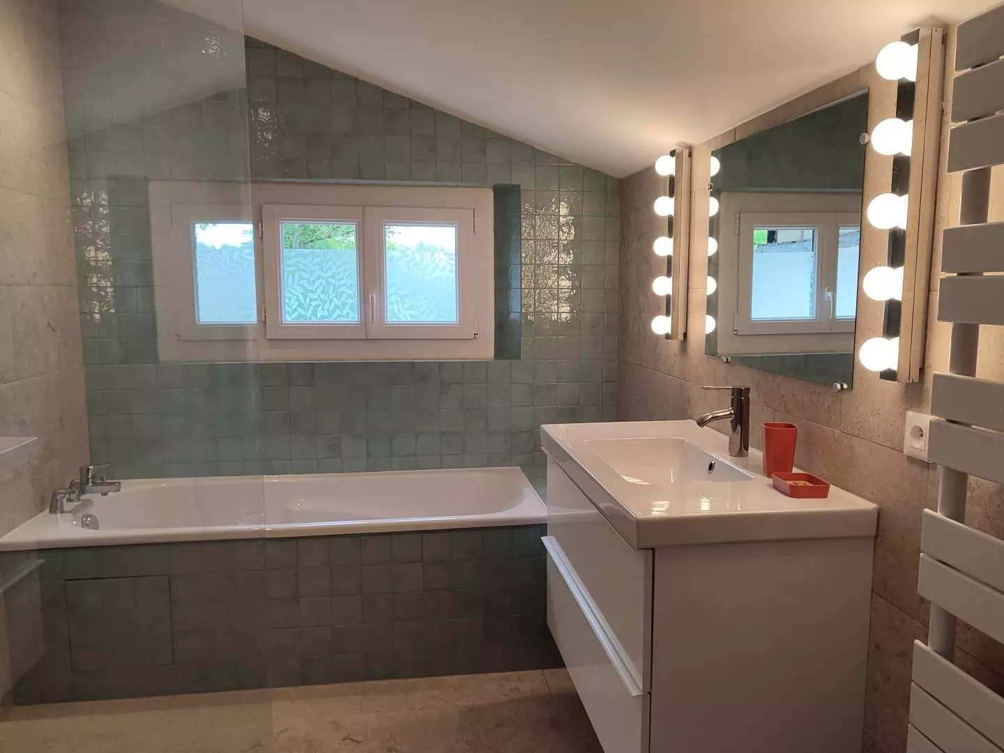 • salle de bain : grande baignoire, grande douche 90x140cm, sèche-serviettes,