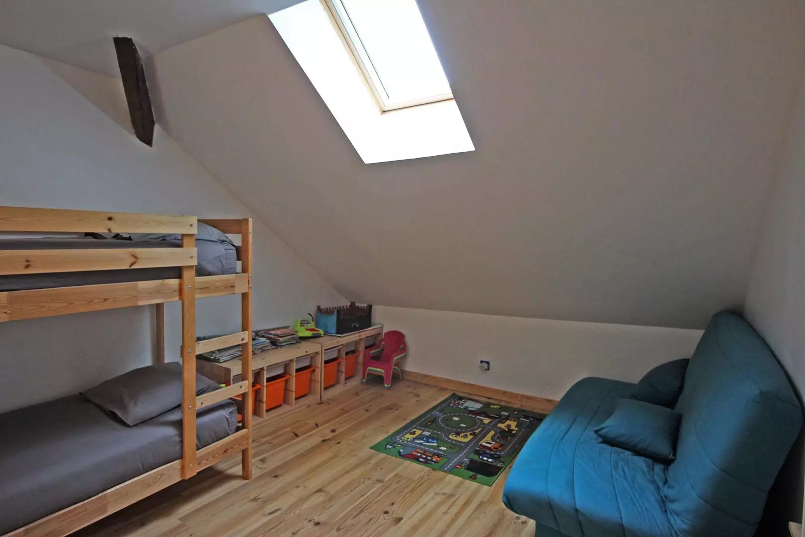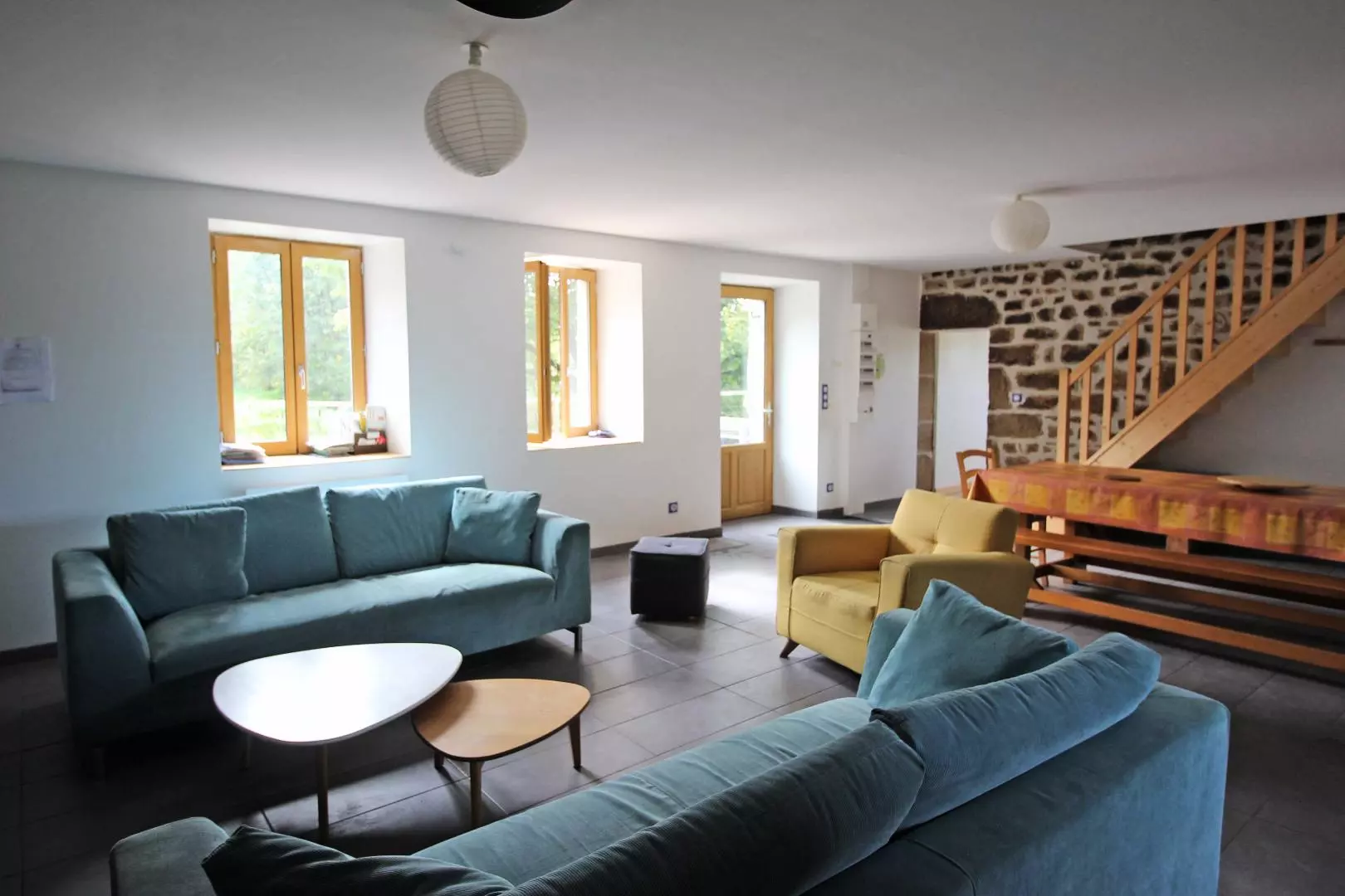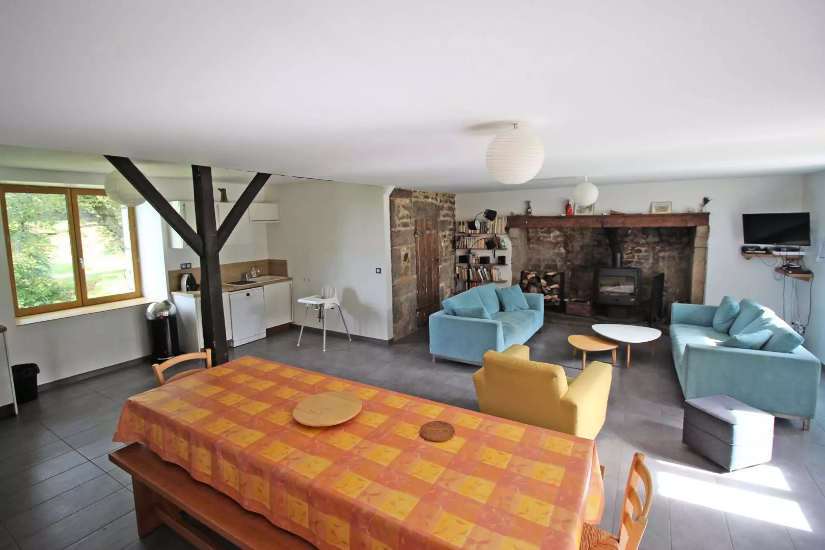 En rez-de-chaussée, accès direct à une vaste pièce à vivre qui dispose d'un espace salon avec poêle à bois, un espace cuisine et repas, une buanderie (lave-linge, sèche-linge, congélateur). Un autre petit salon cosy avec bibliothèque donne accès à un wc et une chambre (1 lit 2 pers. 160 cm). En rez-de-chaussée moins 1, une chambre (2 lits 90 jumelables) et une salle de bains. Au 1er étage une grande chambre traversante (2 X 2 lits superposés en 90, 1 lit bébé), 1 chambre (2 lits 90 jumelables) éclairée par un velux, 1 chambre (2 lits 90 jumelables), 2 petites salles d'eau dont 1 avec wc., 1 WC séparé. Chauffage électrique. Barbecue, chaises longues et meubles de jardin, tennis de table, terrain de pétanque, trampoline (4m de diamètre) d'avril à octobre. Au pays de la nature sauvage, entre le lac de Vassivière et Nedde, la maison isolée à flanc de colline, dispose d'une vue dégagée sur la campagne. Il n'est pas rare d'apercevoir un lièvre ou une biche se balader dans le jardin. Sa terrasse en bois, suspendue au dessus de la prairie, invite à la sérénité ou aux joyeuses tablées.