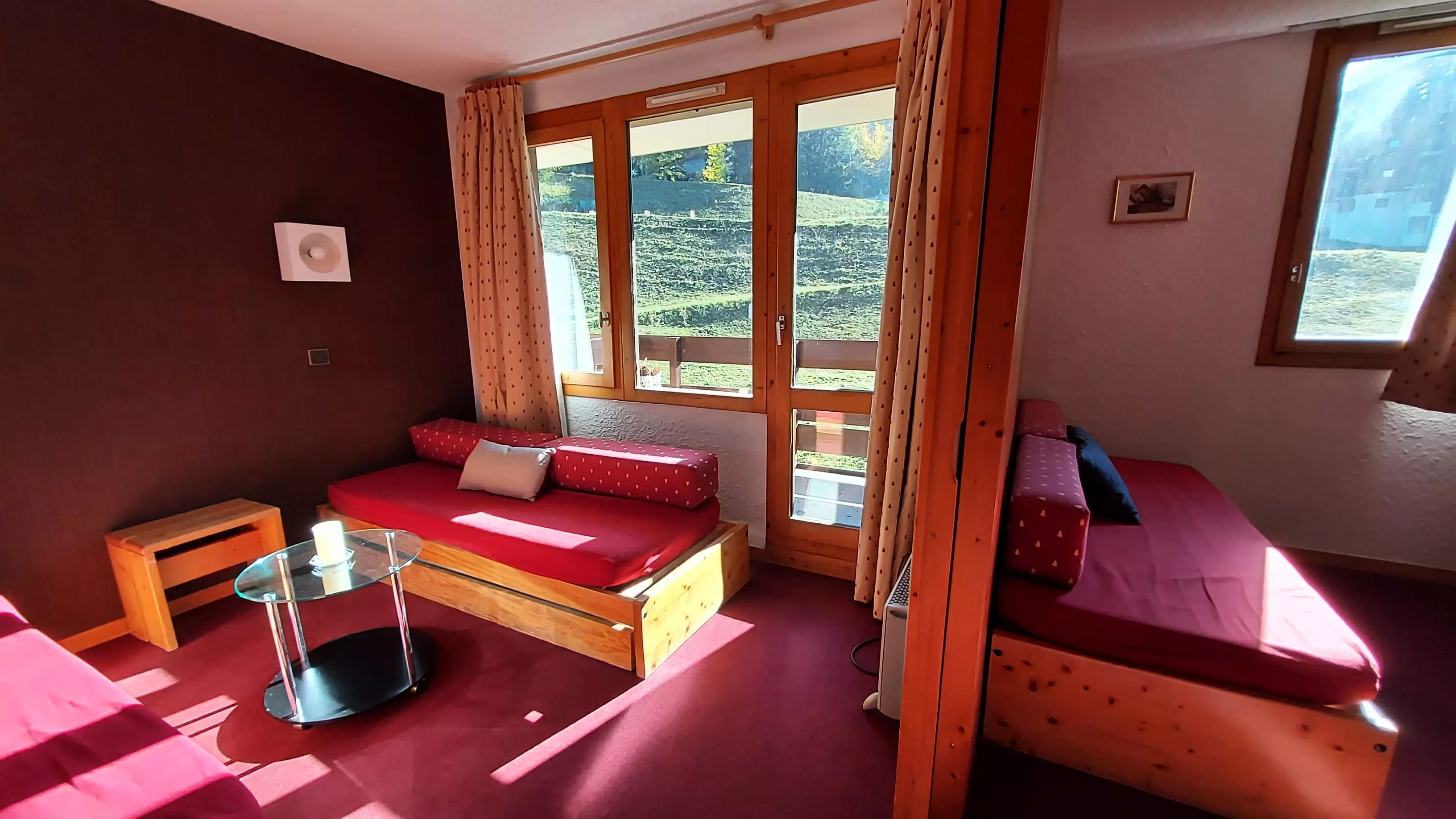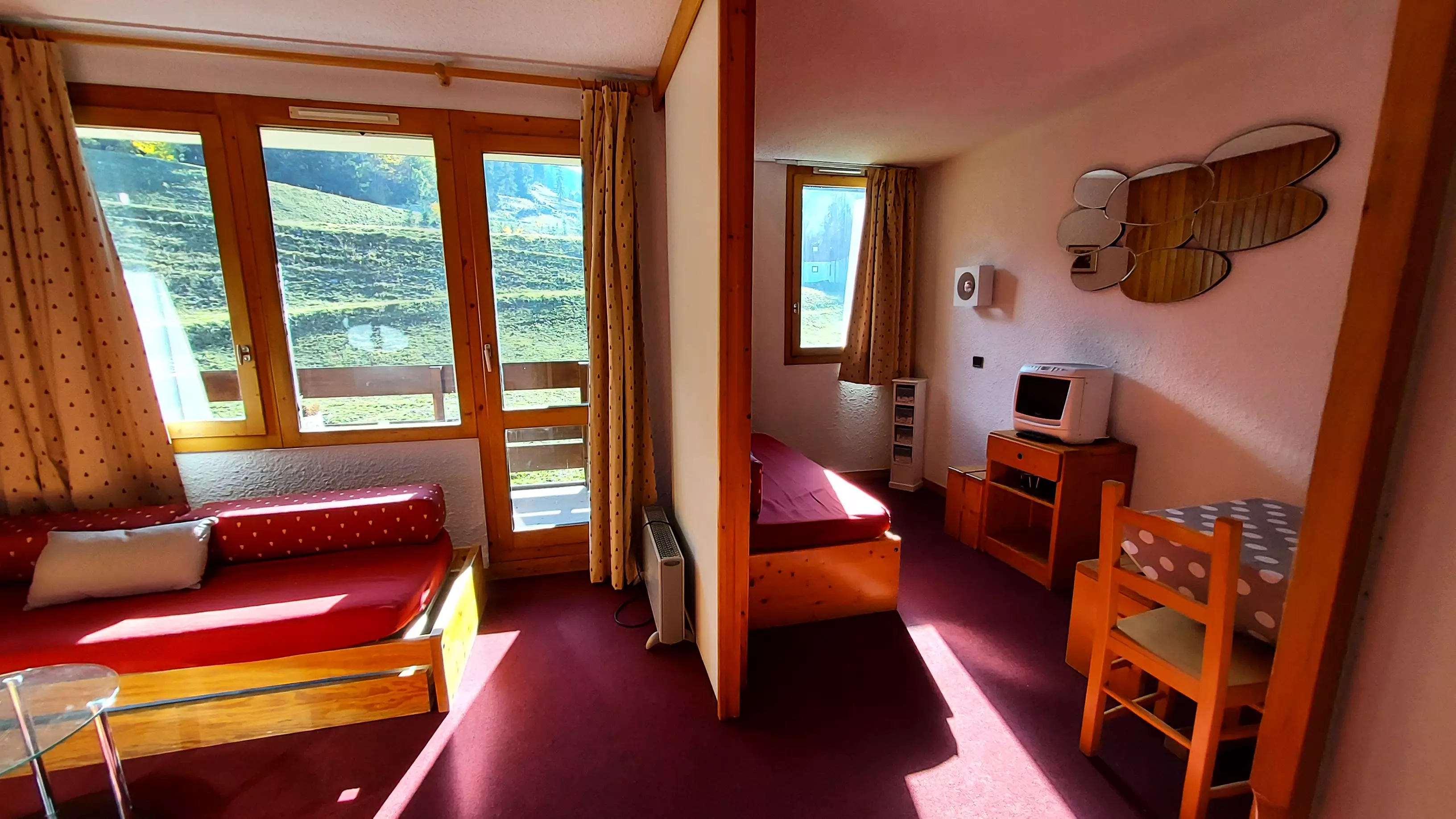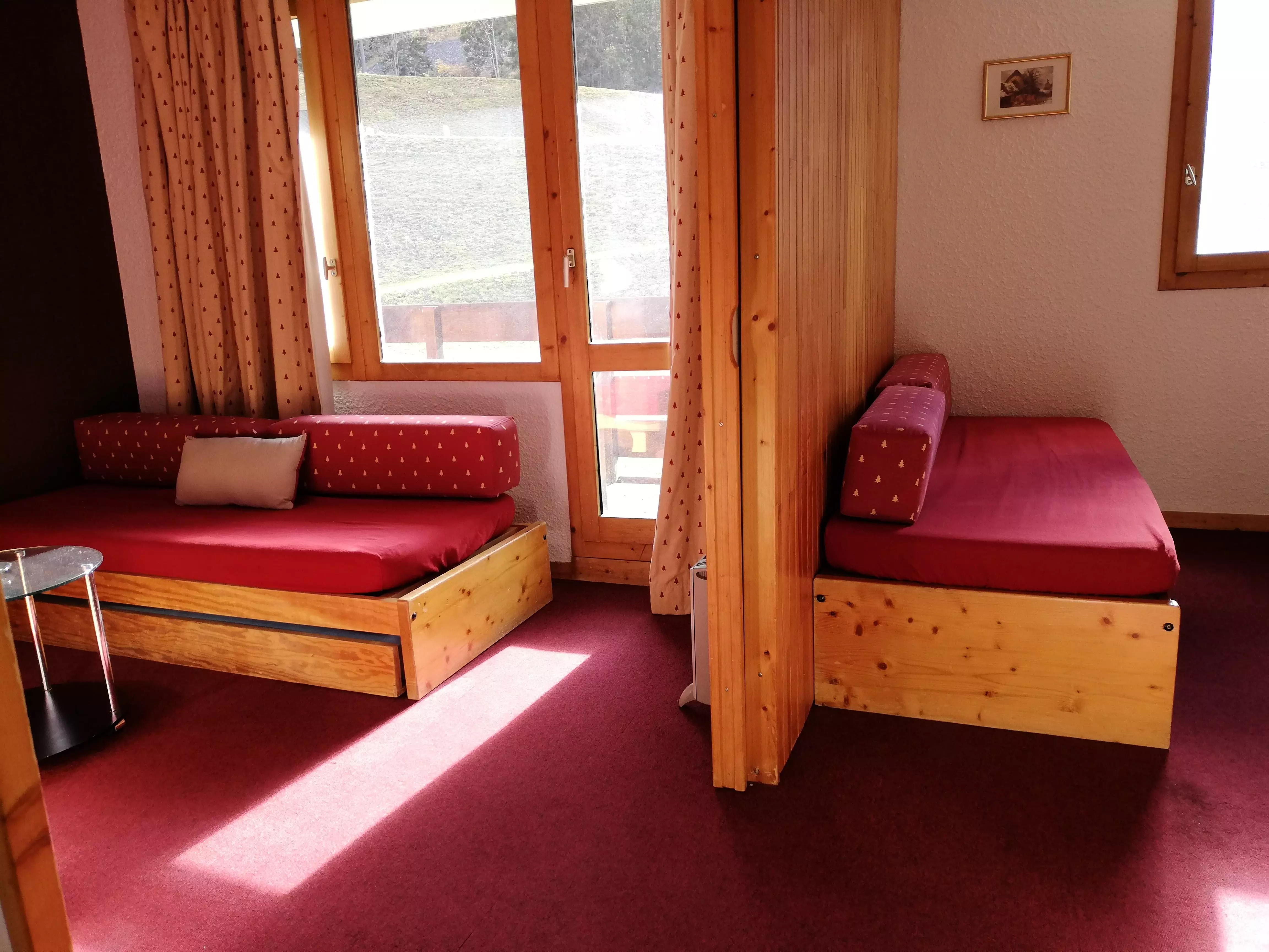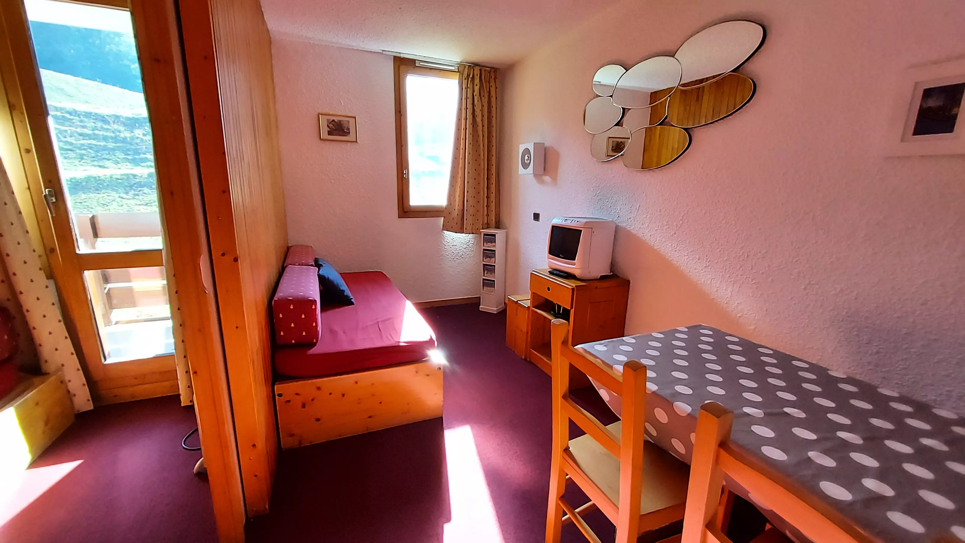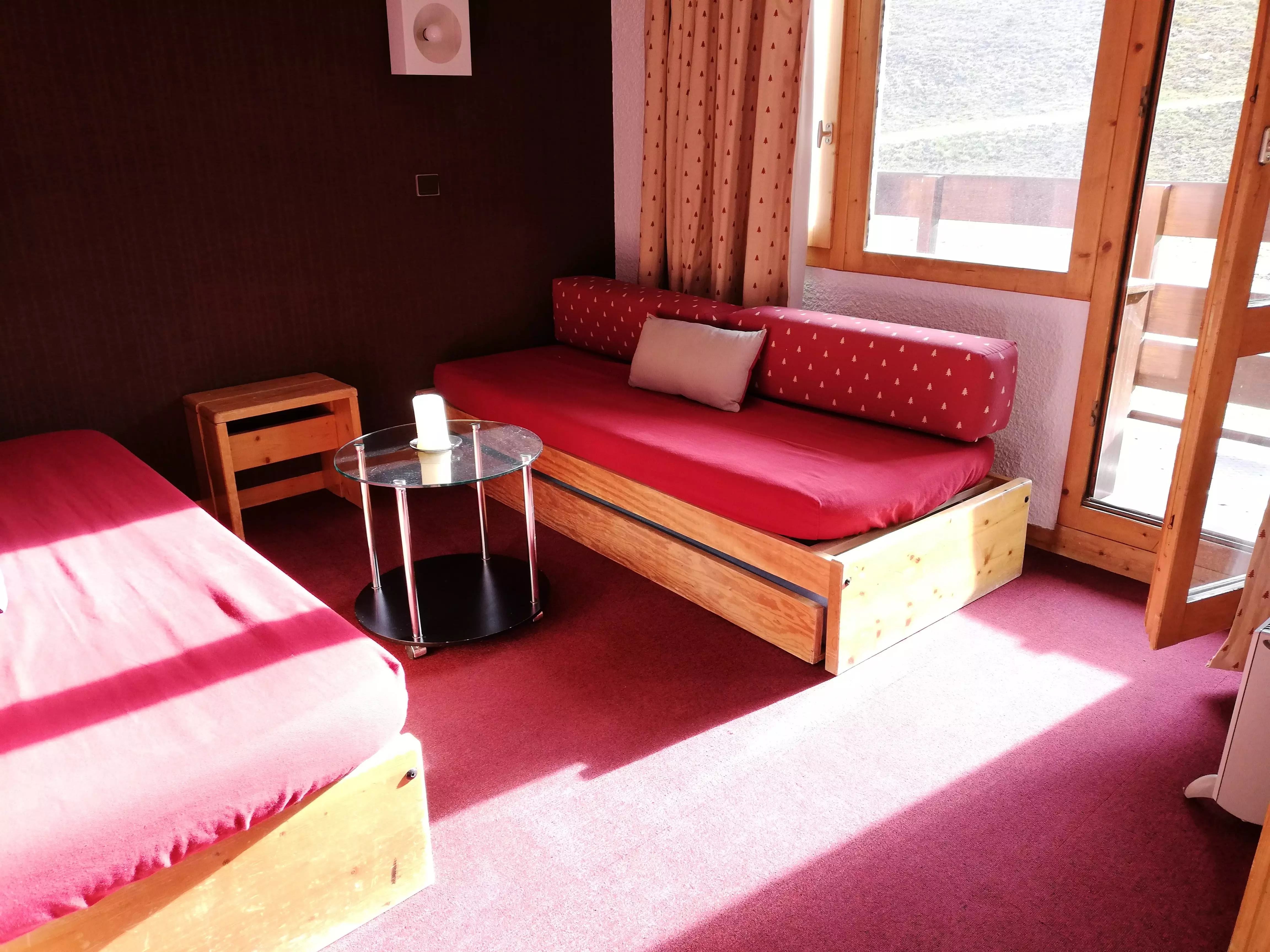 L'appartement: Dans le séjour divisible se trouve 2 banquettes lits simples avec lits gigognes et une télévision. La cuisine est équipée de plaques électriques, lave vaisselle, four, et réfrigérateur. Salle de bains - wc avec sèche serviettes électrique. Balcon. Casier à skis dans la résidence.