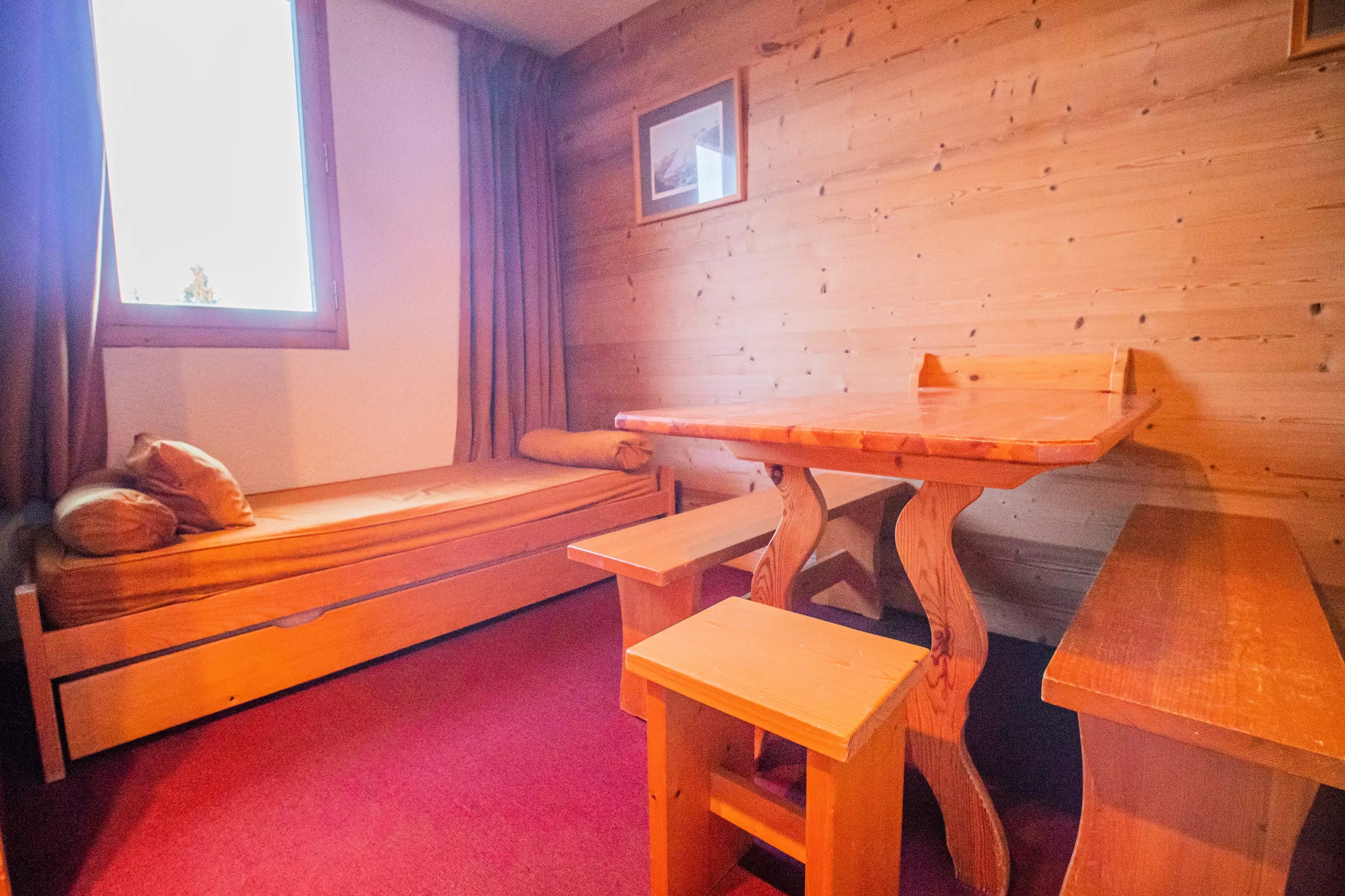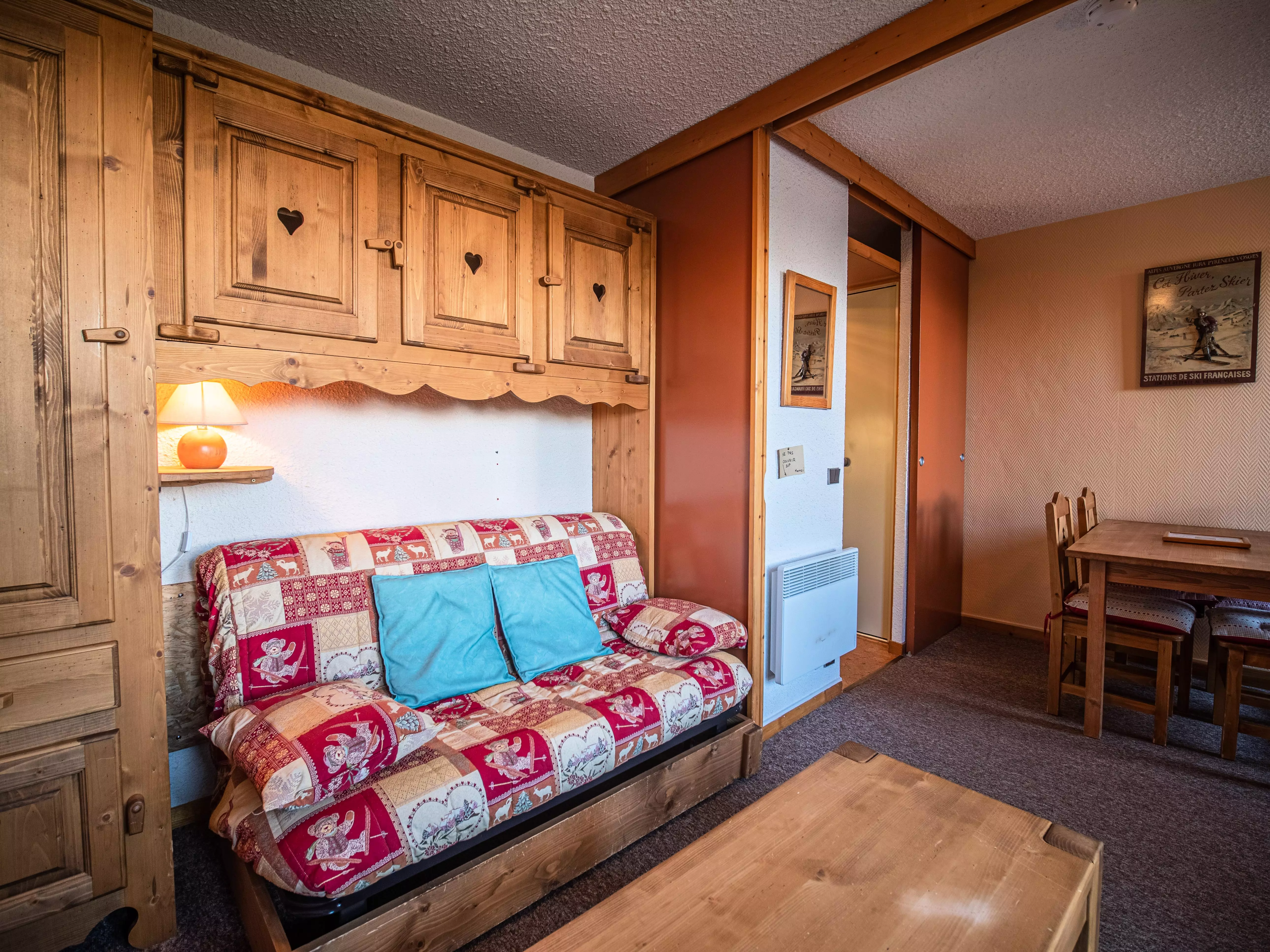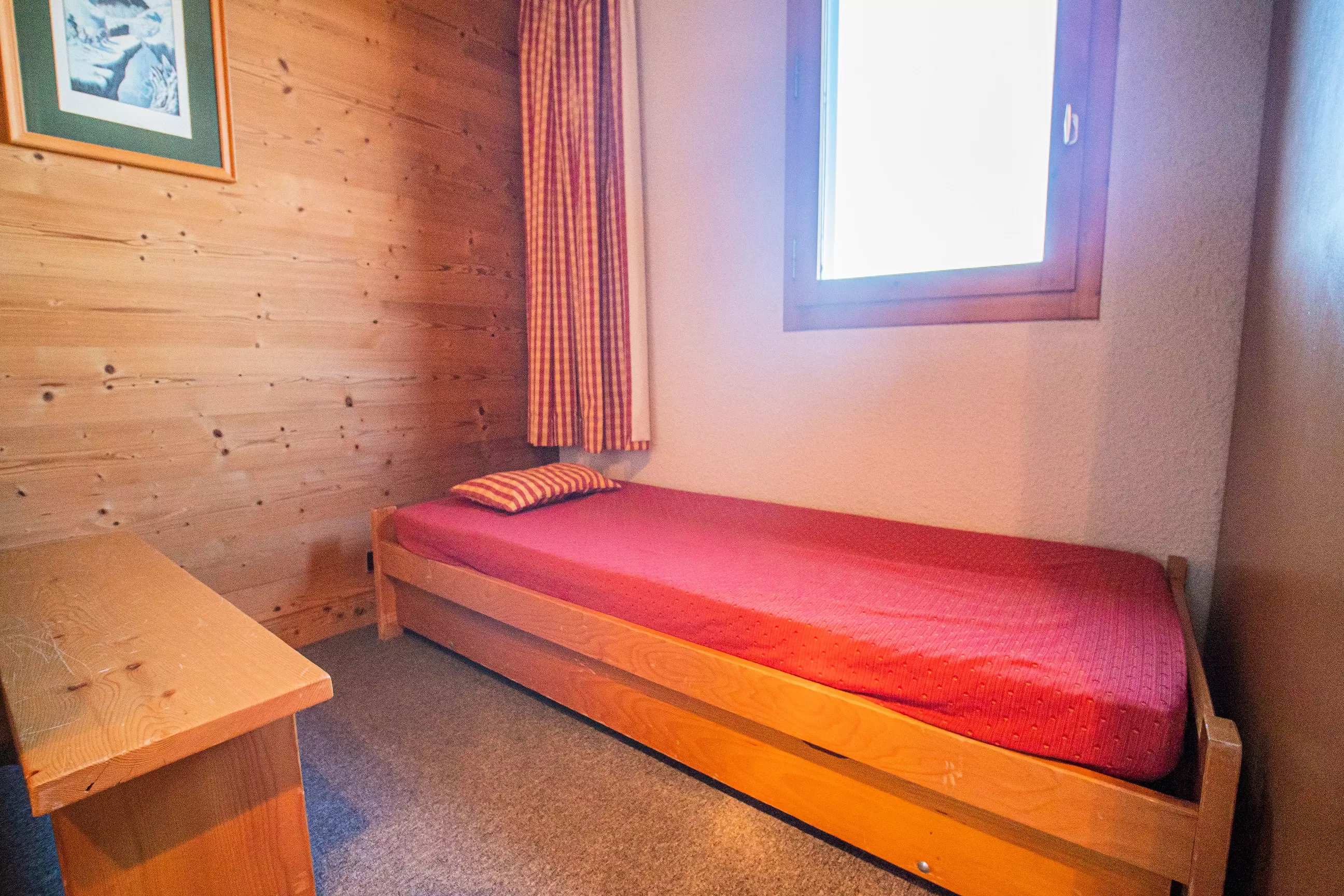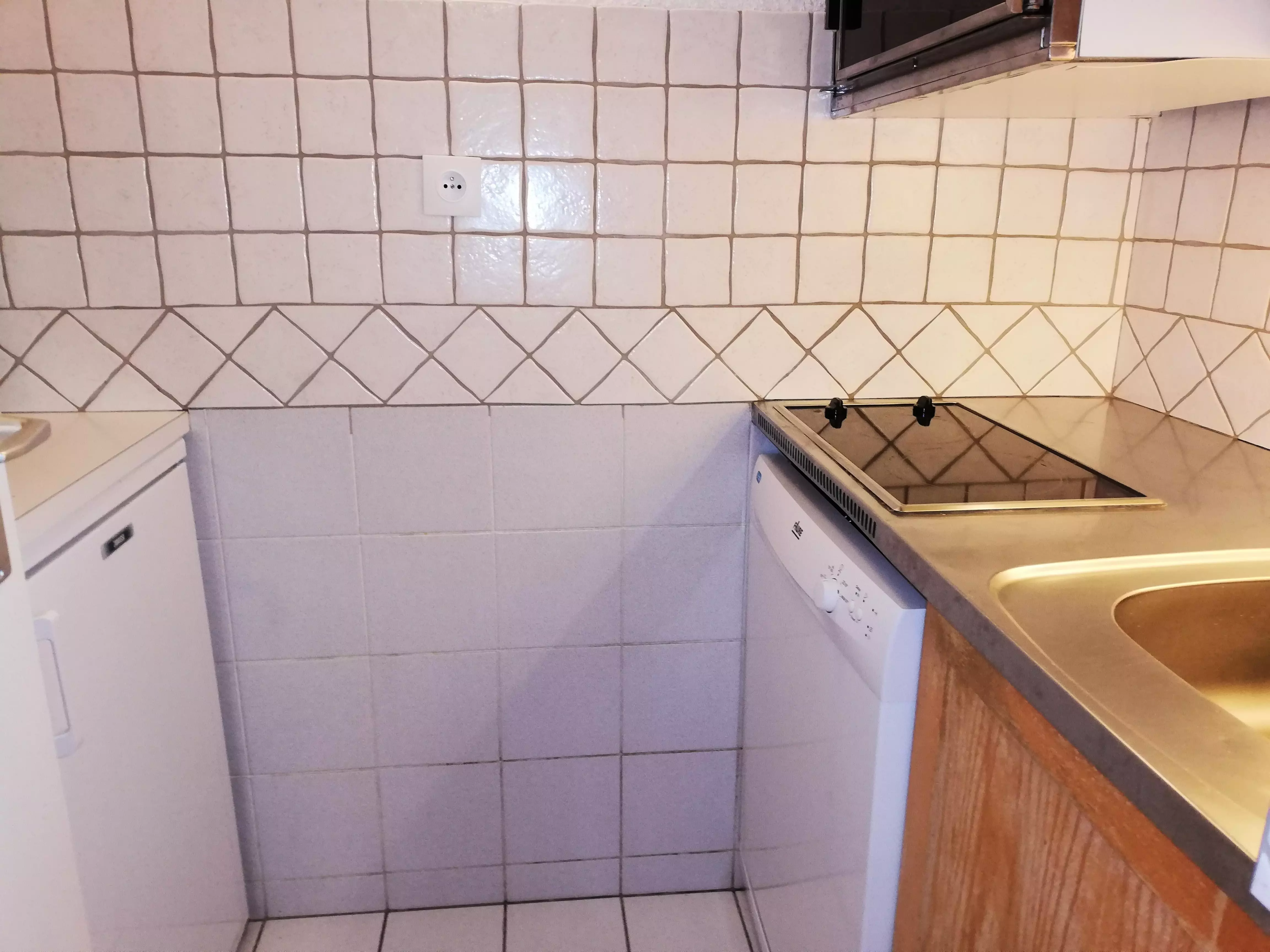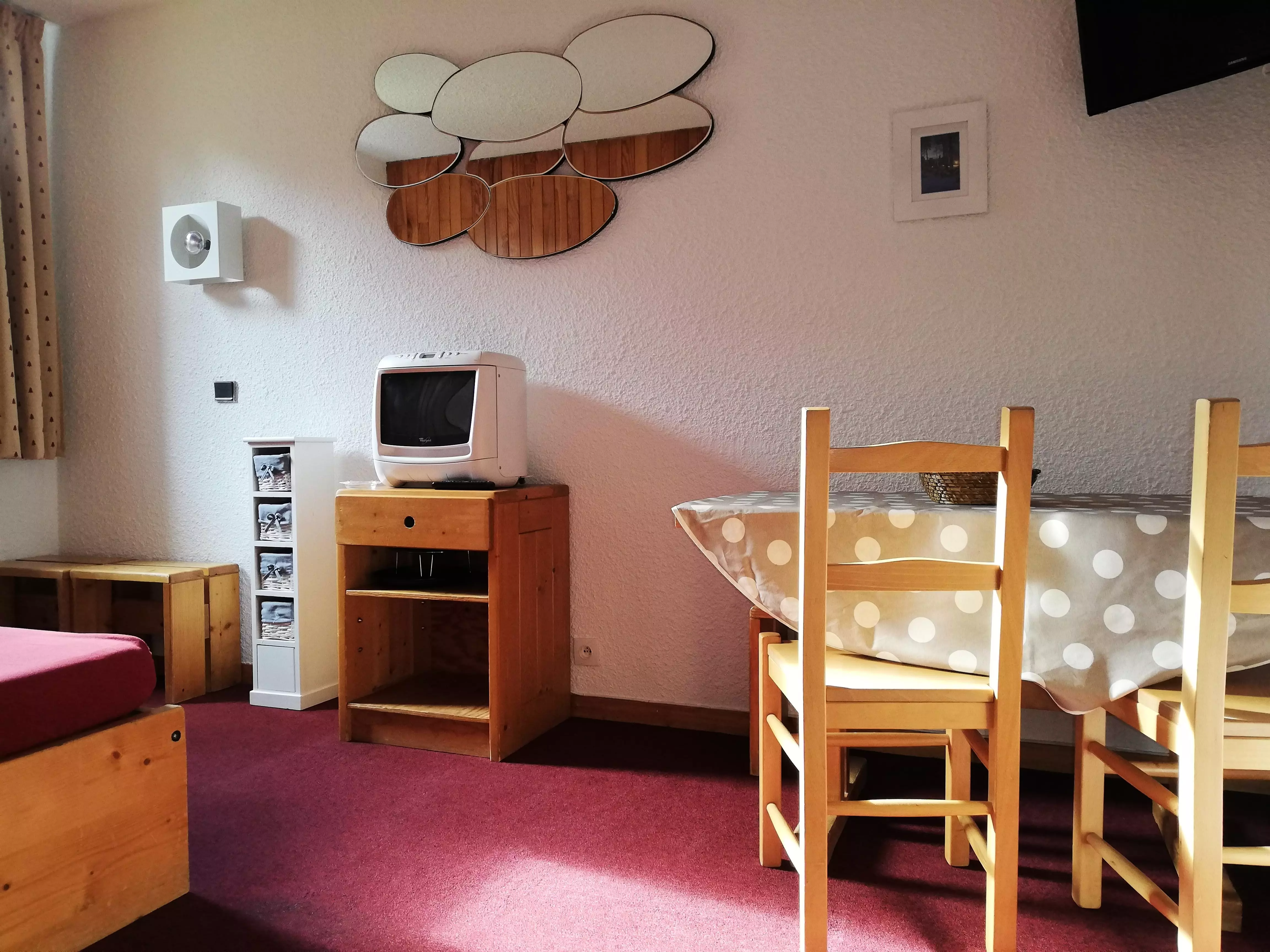 L'appartement: Dans le séjour divisible se trouve 2 banquettes lits simples avec lits gigognes et une télévision. La cuisine est équipée de plaques électriques, lave vaisselle, four, et réfrigérateur. Salle de bains - wc avec sèche serviettes électrique. Balcon. Casier à skis dans la résidence.