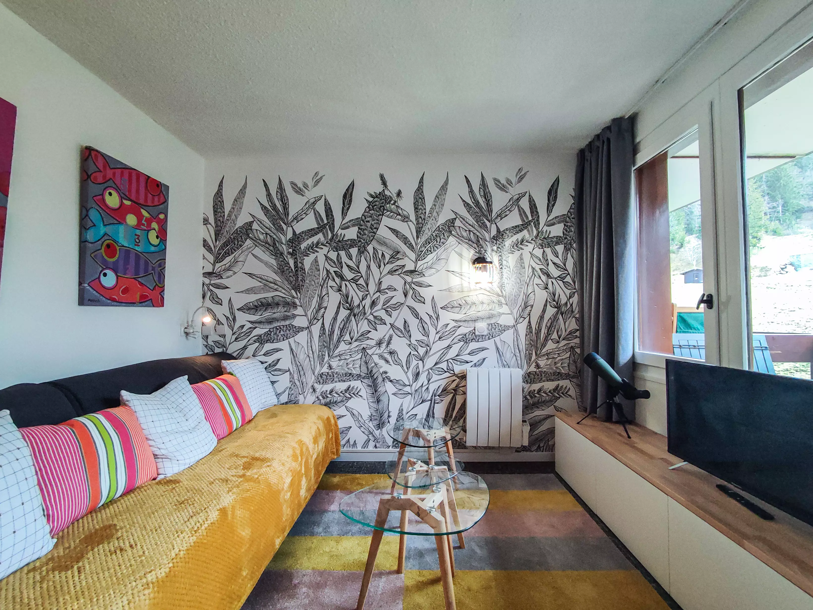 Dans le séjour un canapé double 140x190cm - télévision. Un balcon plain sud -