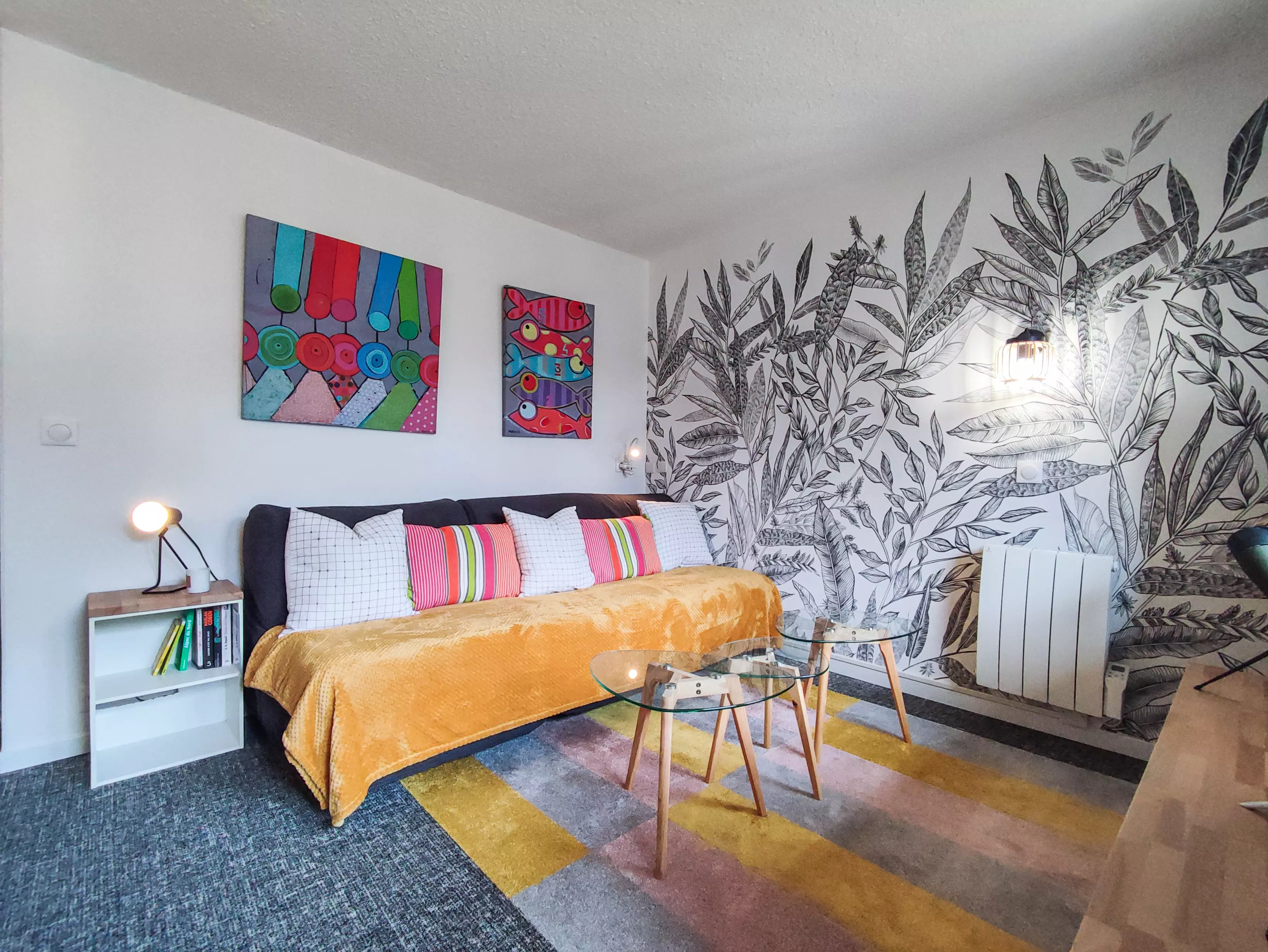 Séjour divisible comprenant un canapé clic clac, un lit simple et une télévision.