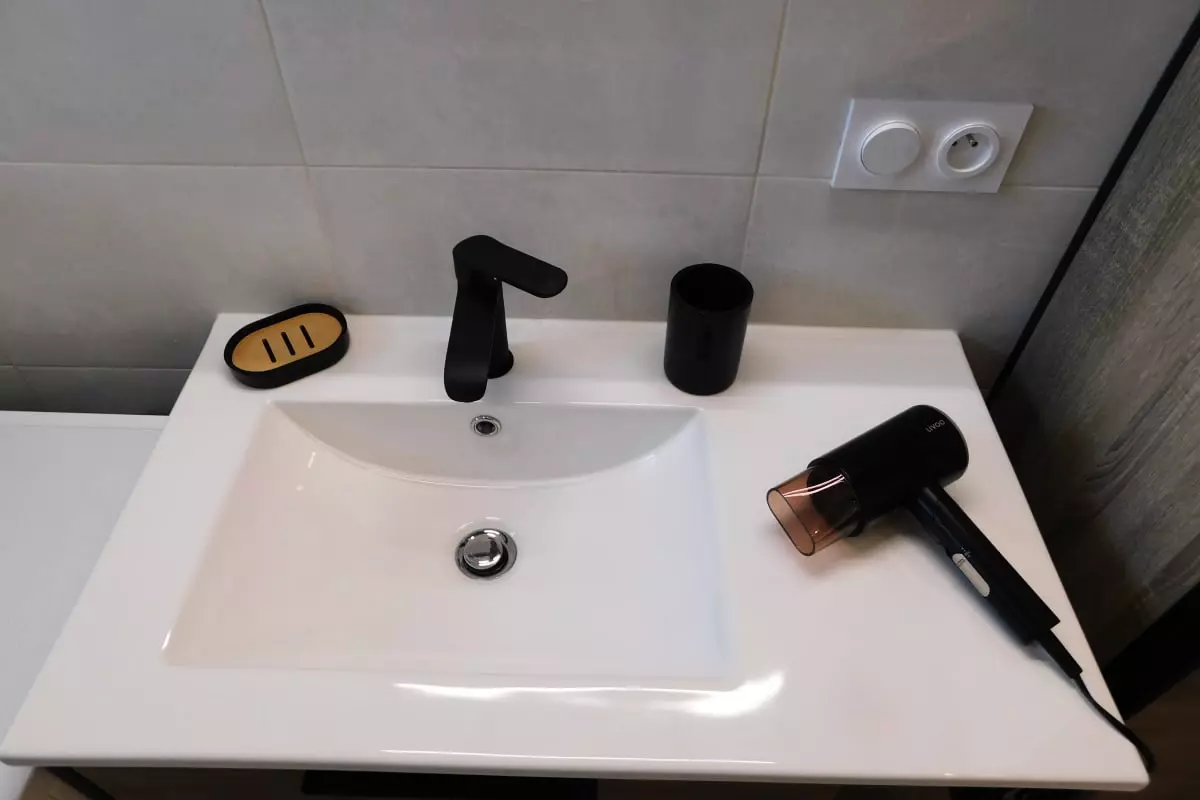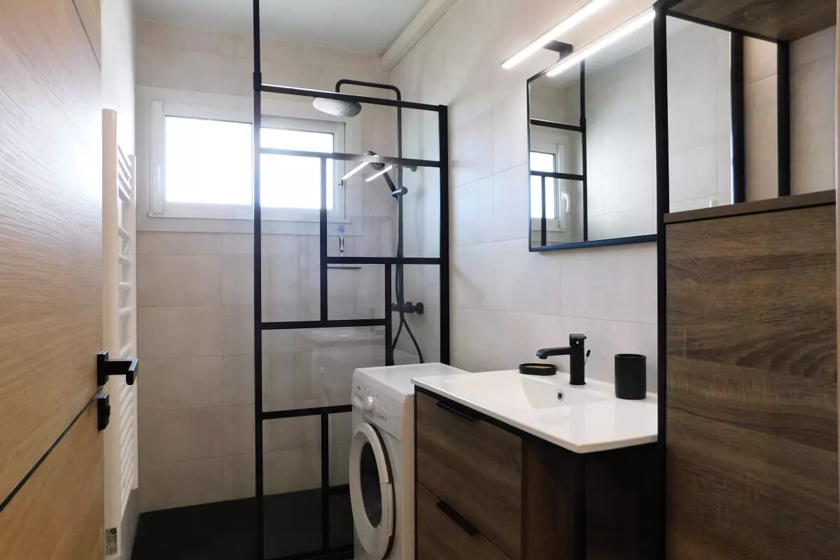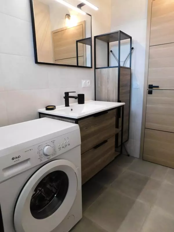 La salle de bain est équipée d'une douche pour vous rafraîchir, d'un lave linge, et d'un sèche cheveux tandis que la cuisine compacte est équipée de tout le nécessaire pour préparer vos repas.
