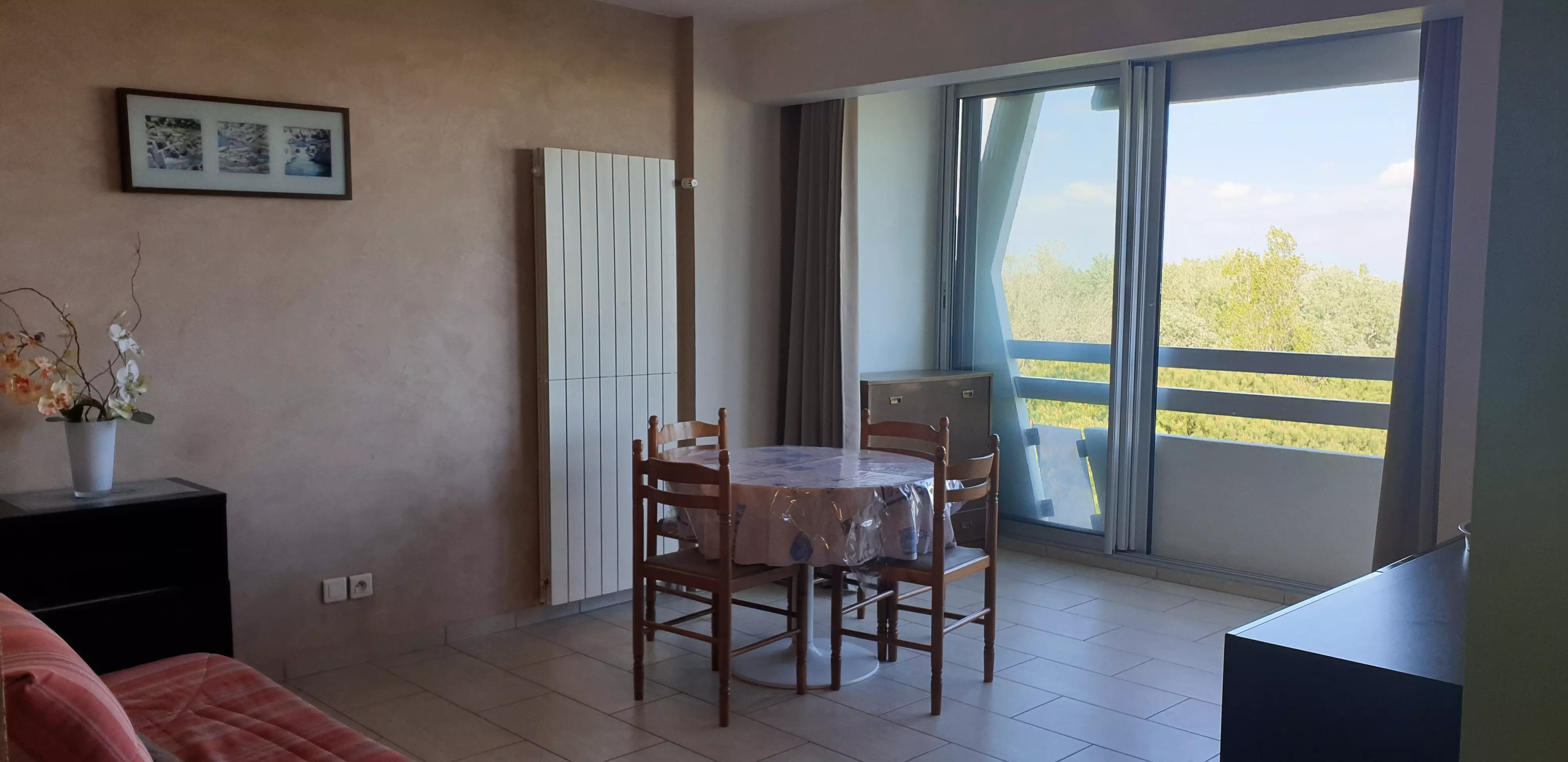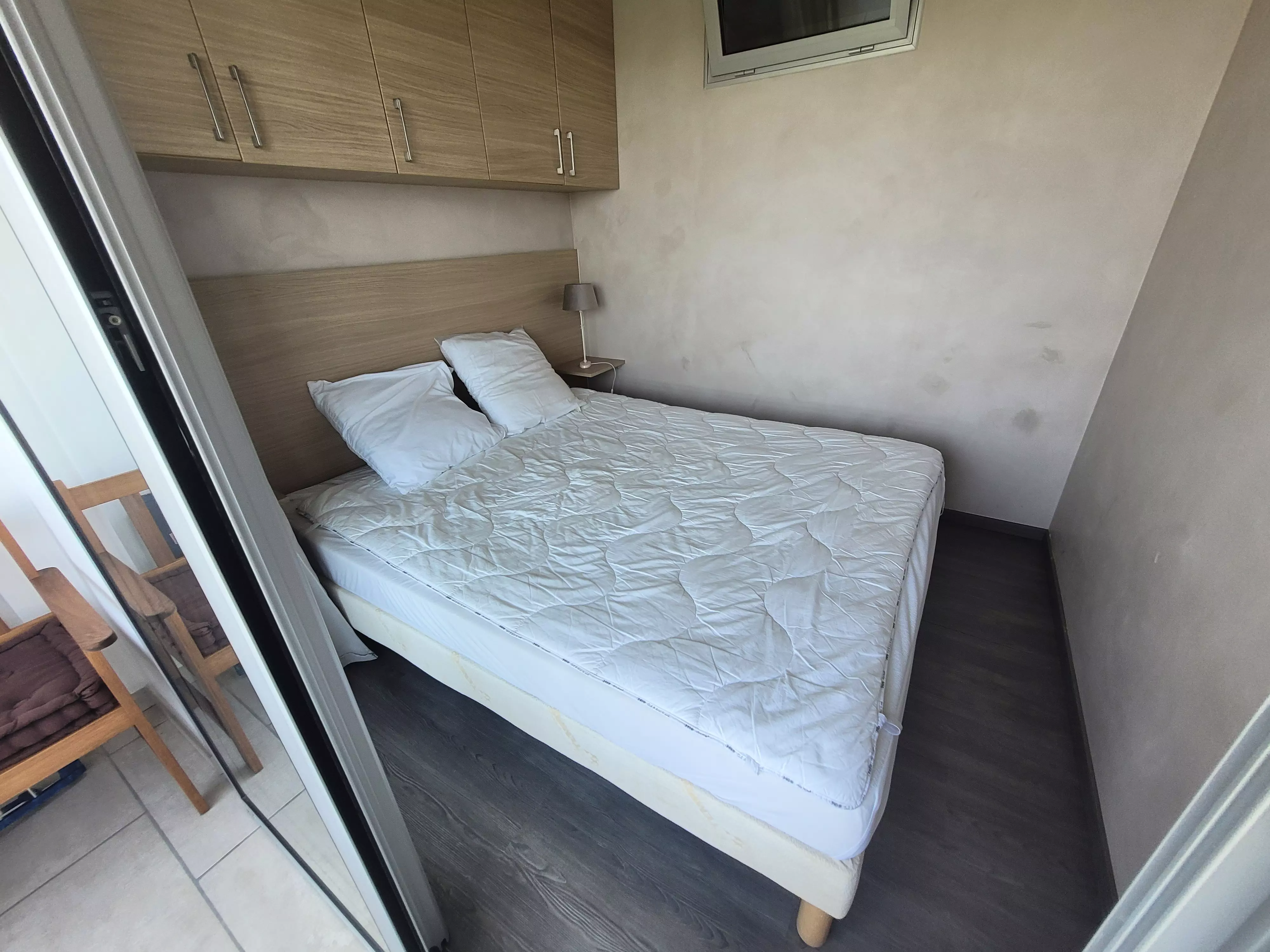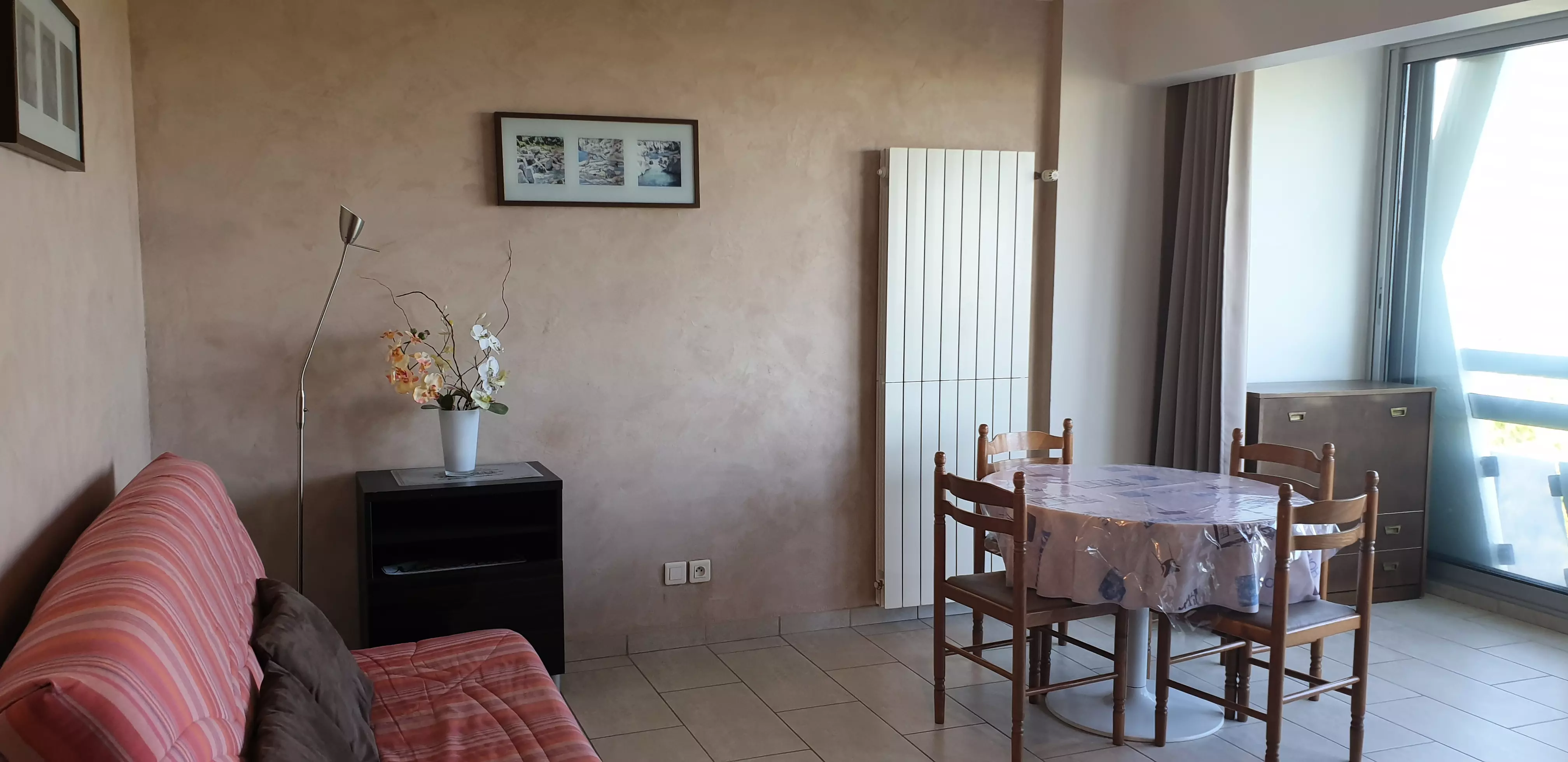 Les atouts de votre location : Beau studio cabine au 6ème étage, 39 m² , 4 voyageurs maximum. L'appartement est proche de la mer et bénéficie d'un petit passage (public) menant directement sur la plage. Ce dernier est composé d'une entrée avec placard de rangement, d'un séjour ouvert sur une kitchenette équipée (réfrigérateur avec compartiment congélateur, plaque vitrocéramique 2 feux, cafetière électrique, cafetière à capsule, bouilloire, grille-pain, micro-ondes, lave-vaisselle, ustensiles cuisine), d'un coin repas, d'un coin salon (canapé lit 140 x 190), une télévision, 1 salle de bain avec 1 vasque, une grande douche à l'italienne, un WC indépendant. Une cabine avec lit double (160 x 200). Vue sur Pinède et petite vue mer. Bel endroit pour passer de belles vacances. Laverie à proximité du logement. Logement classé **