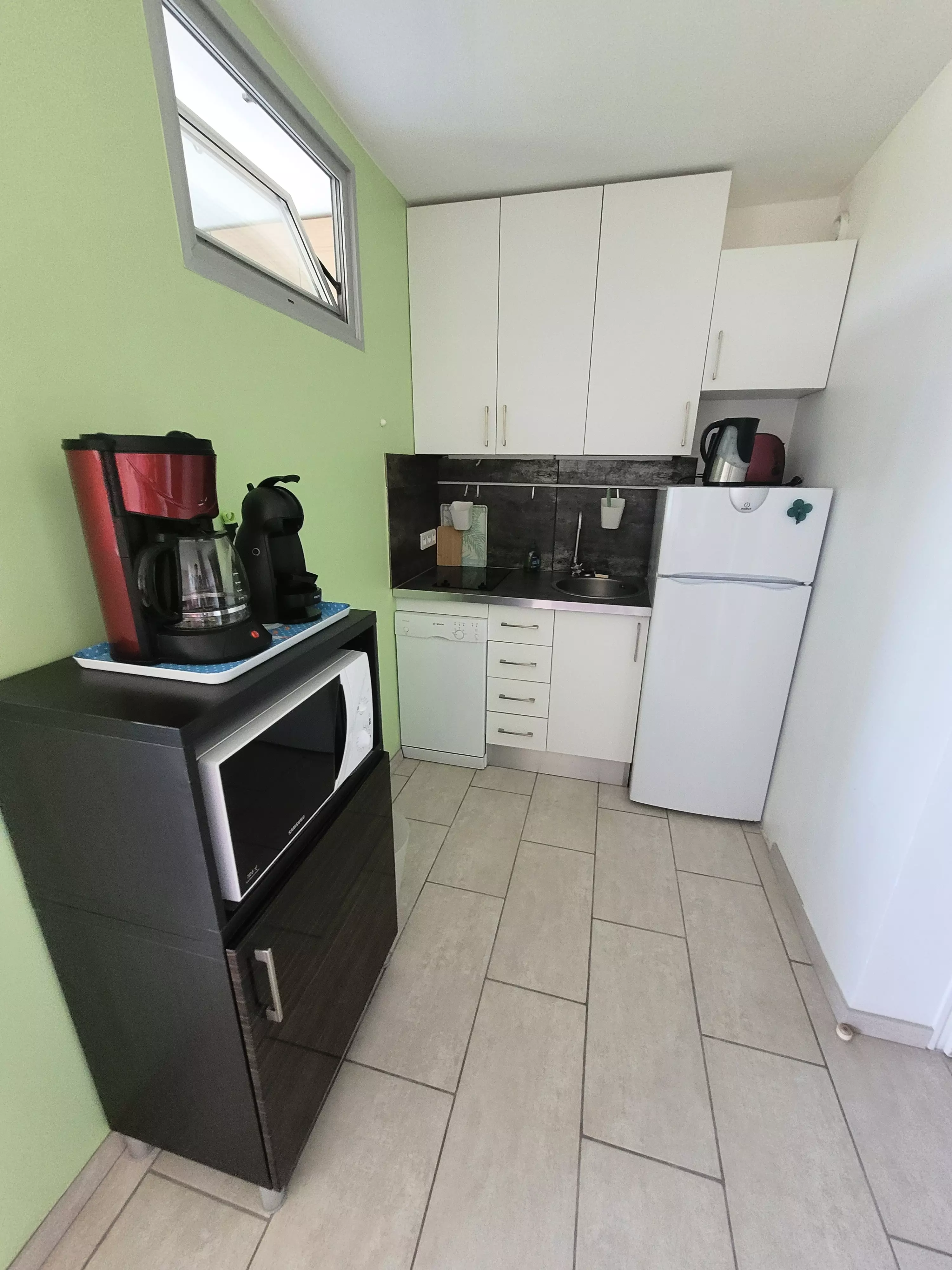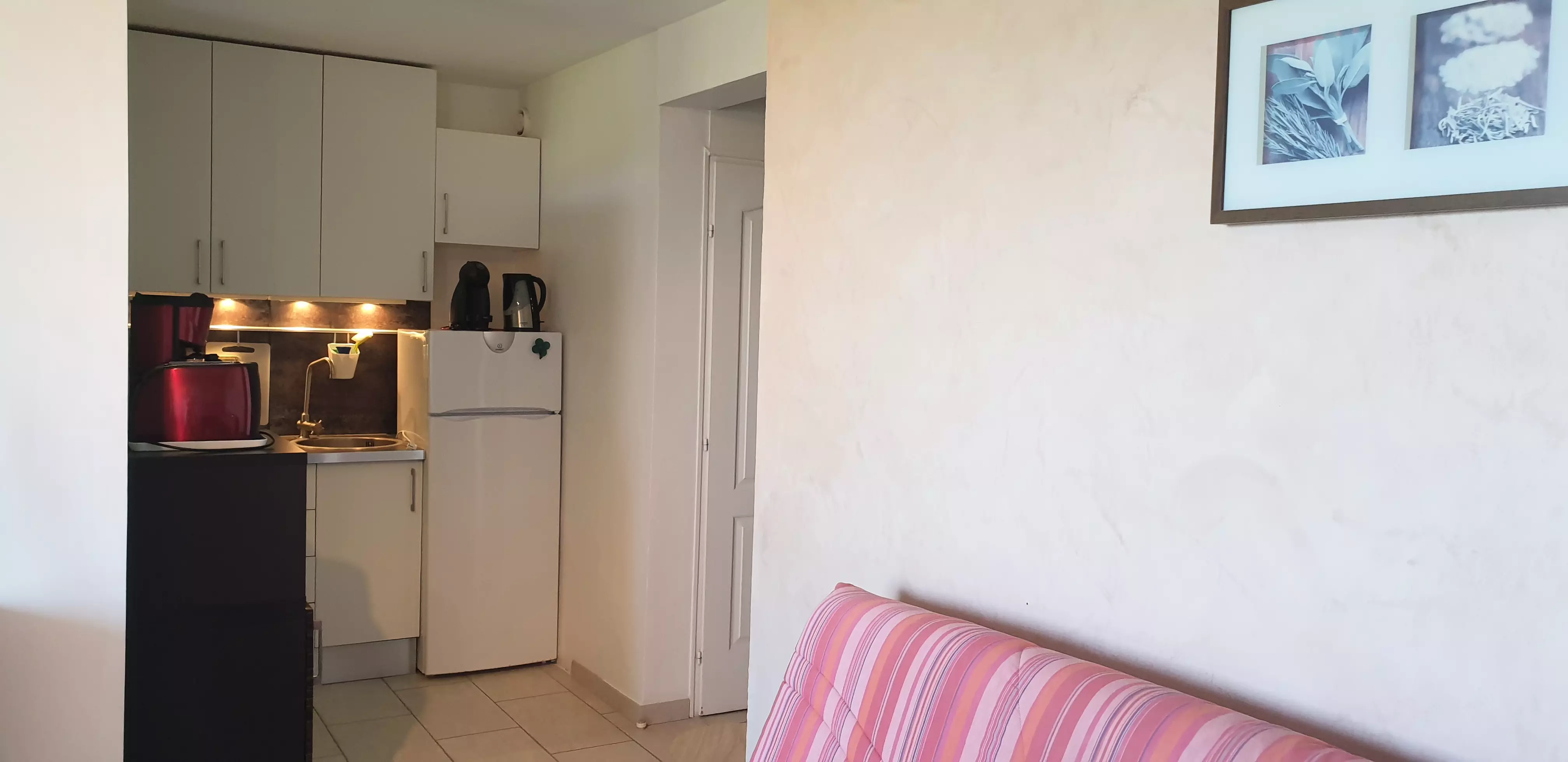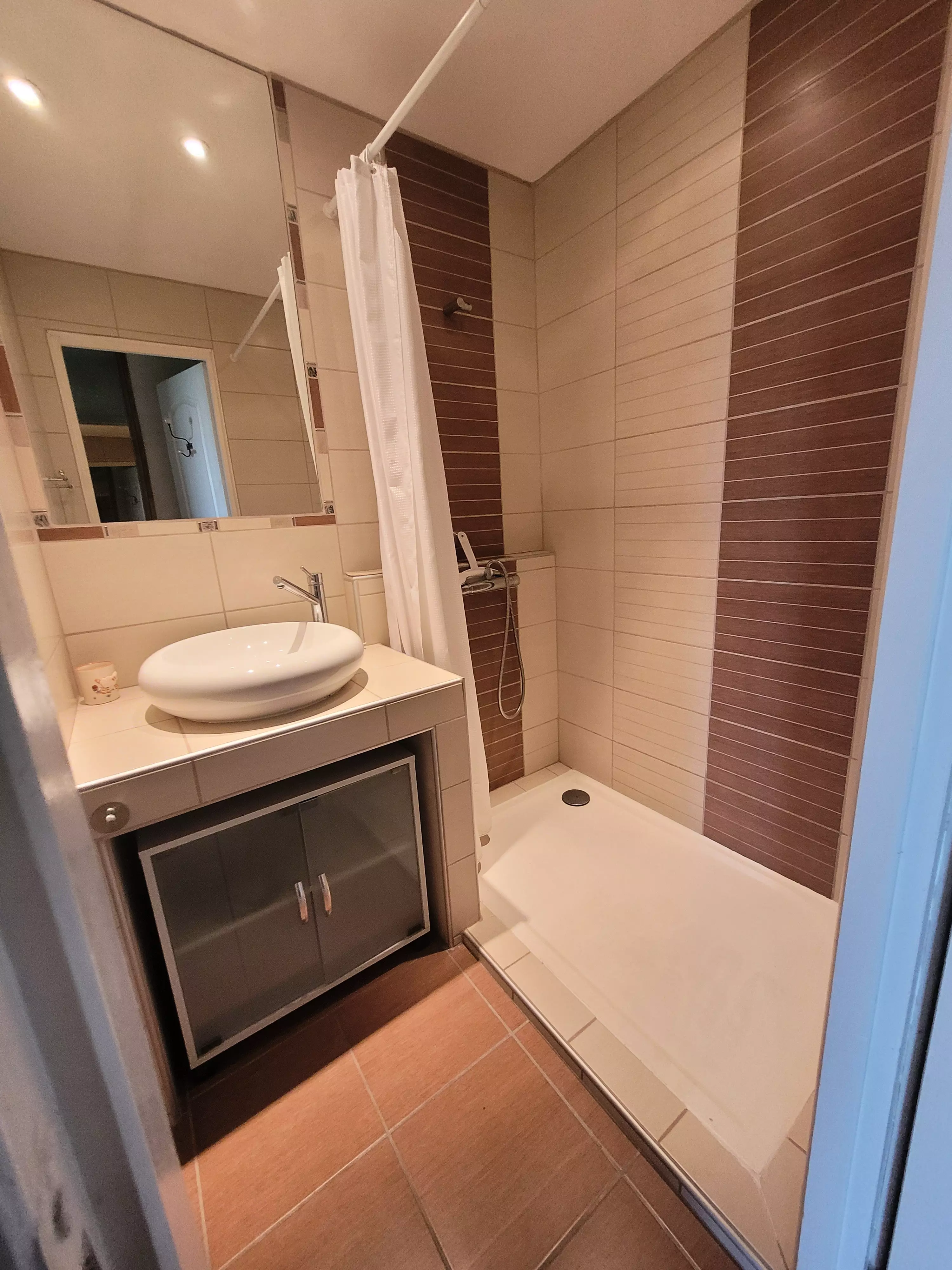 Les atouts de votre location : Beau studio cabine au 6ème étage, 39 m² , 4 voyageurs maximum. L'appartement est proche de la mer et bénéficie d'un petit passage (public) menant directement sur la plage. Ce dernier est composé d'une entrée avec placard de rangement, d'un séjour ouvert sur une kitchenette équipée (réfrigérateur avec compartiment congélateur, plaque vitrocéramique 2 feux, cafetière électrique, cafetière à capsule, bouilloire, grille-pain, micro-ondes, lave-vaisselle, ustensiles cuisine), d'un coin repas, d'un coin salon (canapé lit 140 x 190), une télévision, 1 salle de bain avec 1 vasque, une grande douche à l'italienne, un WC indépendant. Une cabine avec lit double (160 x 200). Vue sur Pinède et petite vue mer. Bel endroit pour passer de belles vacances. Laverie à proximité du logement. Logement classé **