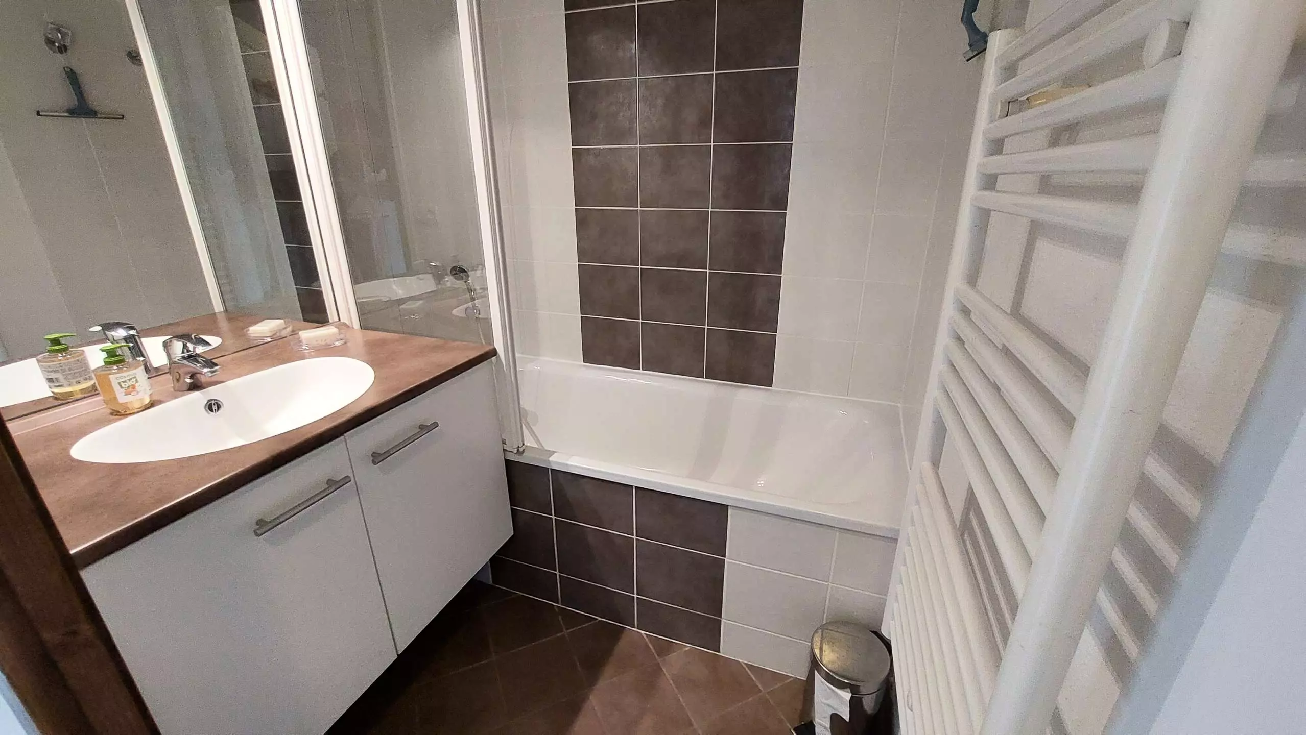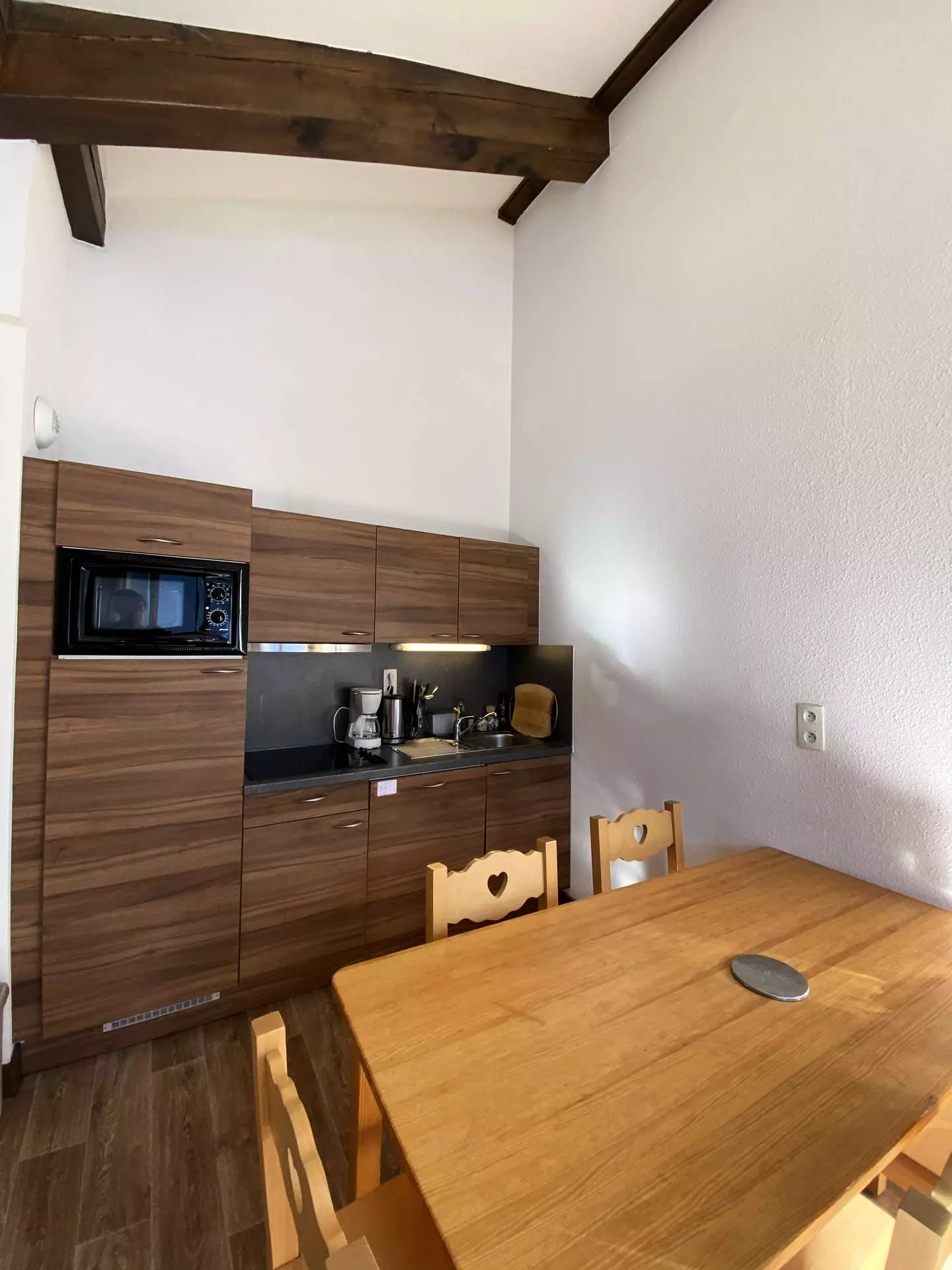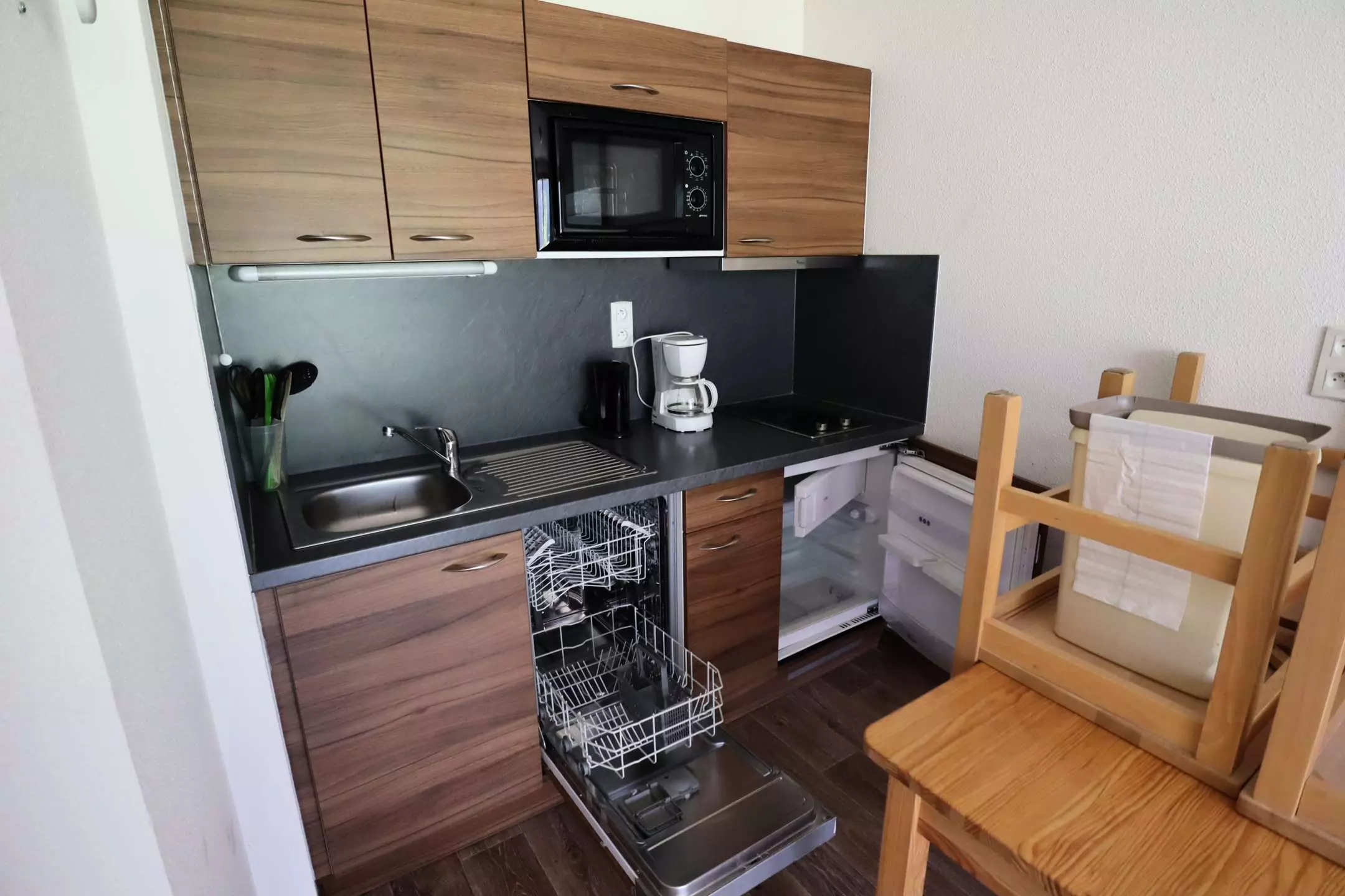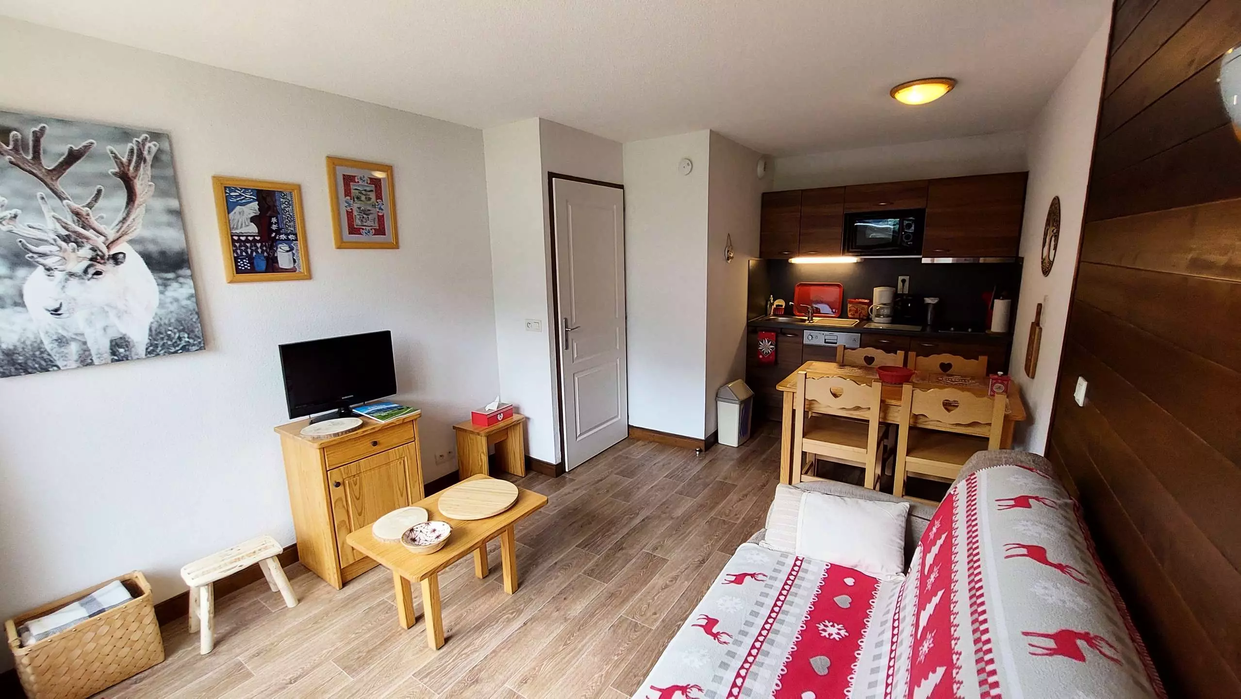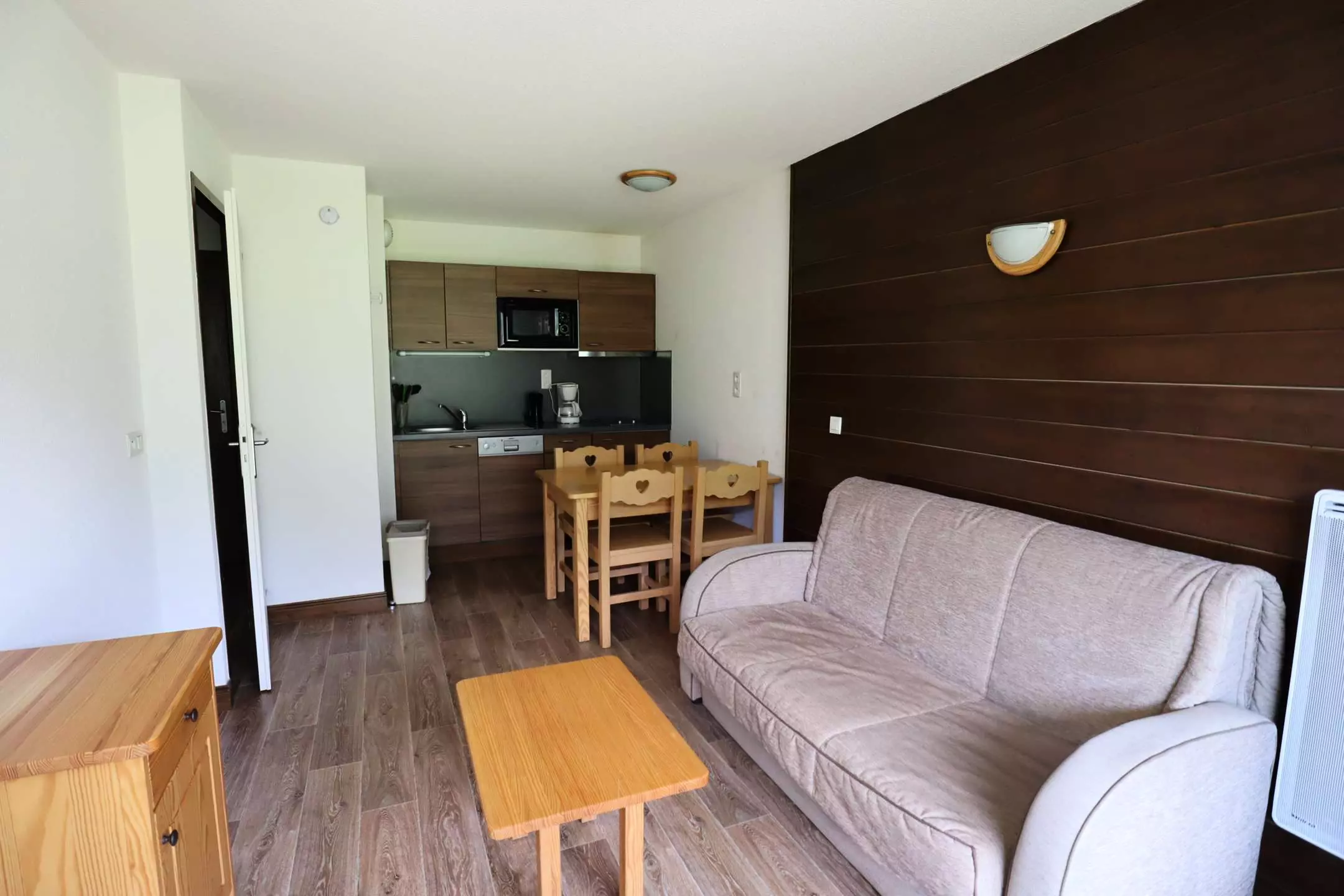 30 m² environ au RDC, un séjour avec un canapé-lit 2 personnes, une chambre 1 lit 2 personnes, une salle de bains. Votre appartement est équipé d'un coin cuisine avec plaques vitrocéramiques + micro-ondes/grill + lave-vaisselle, d'un balcon sud, TV. Vous bénéficiez d'un parking couvert et avez accès en saison à la piscine couverte chauffée, la salle de fitness, à la buanderie, au billard et à la wifi. En dehors des saisons, résidence très calme et piscine fermée.
