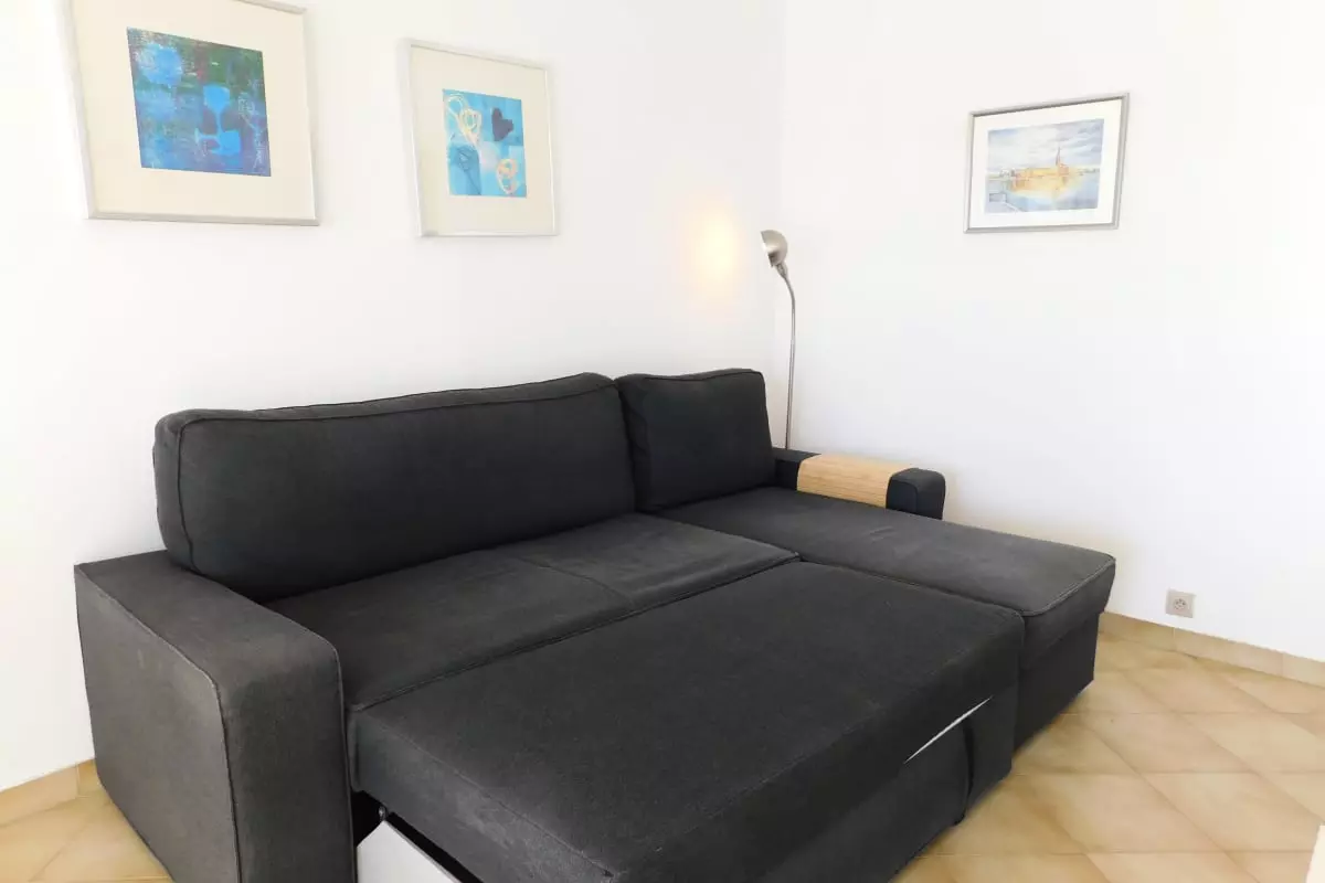 La pièce à vivre est très lumineuse grâce à son balcon de 11m2. Il est composé d'un coin salon avec un canapé convertible permettant d'accueillir deux personnes supplémentaires ainsi qu'un coin salle à manger à une table ronde pour les repas. Vous pourrez également prendre vos repas sur le balcon équipé d'un coin repas et d'un coin lounge.