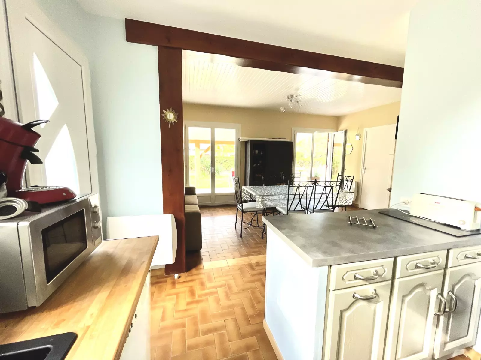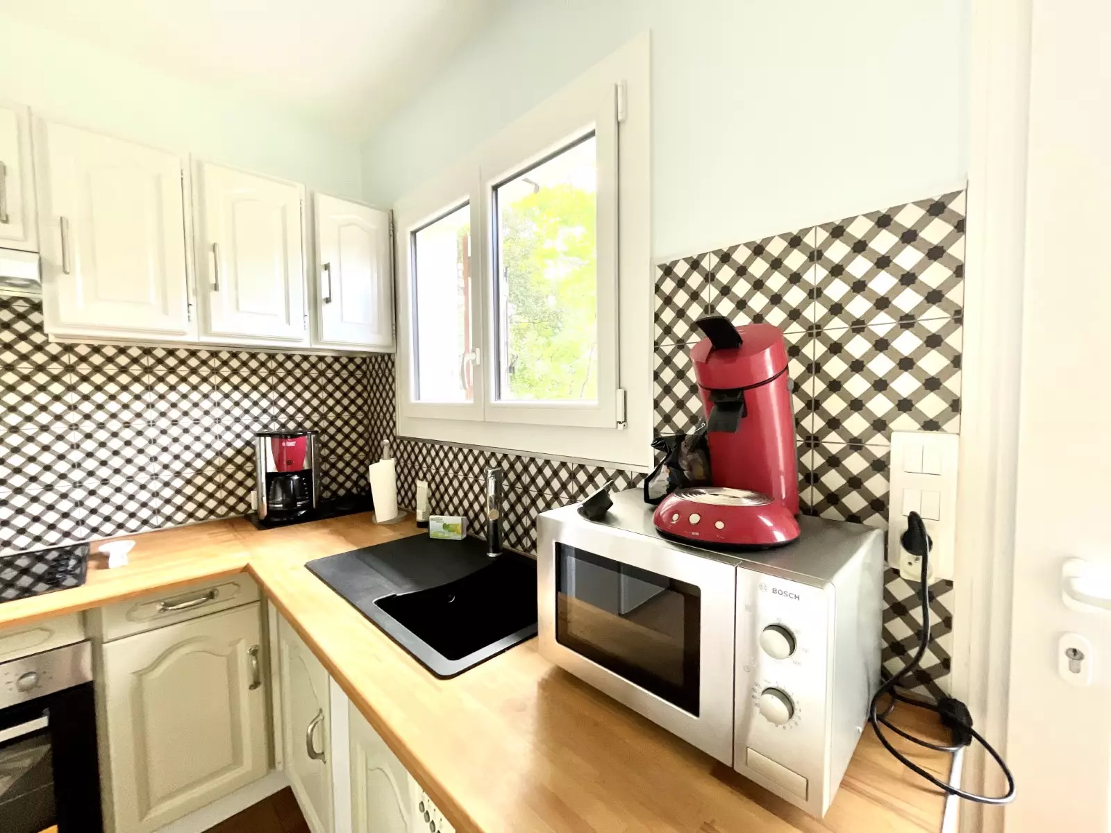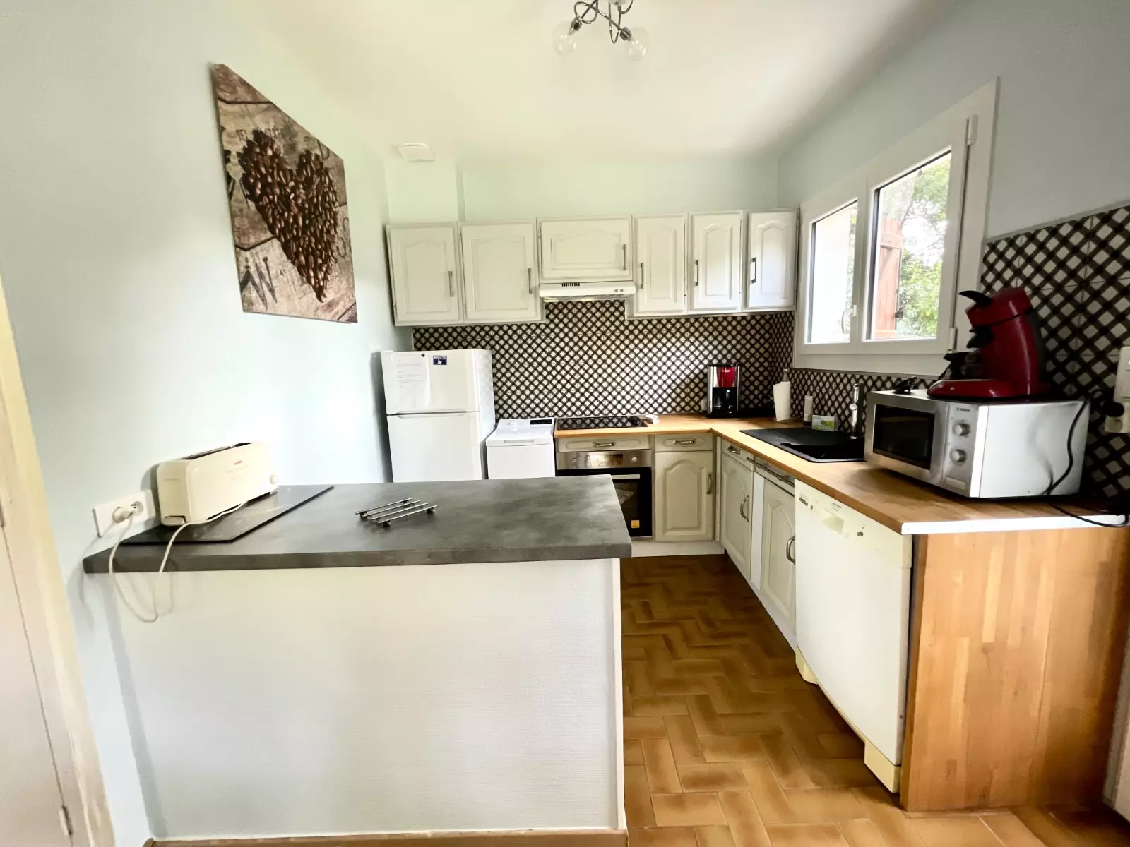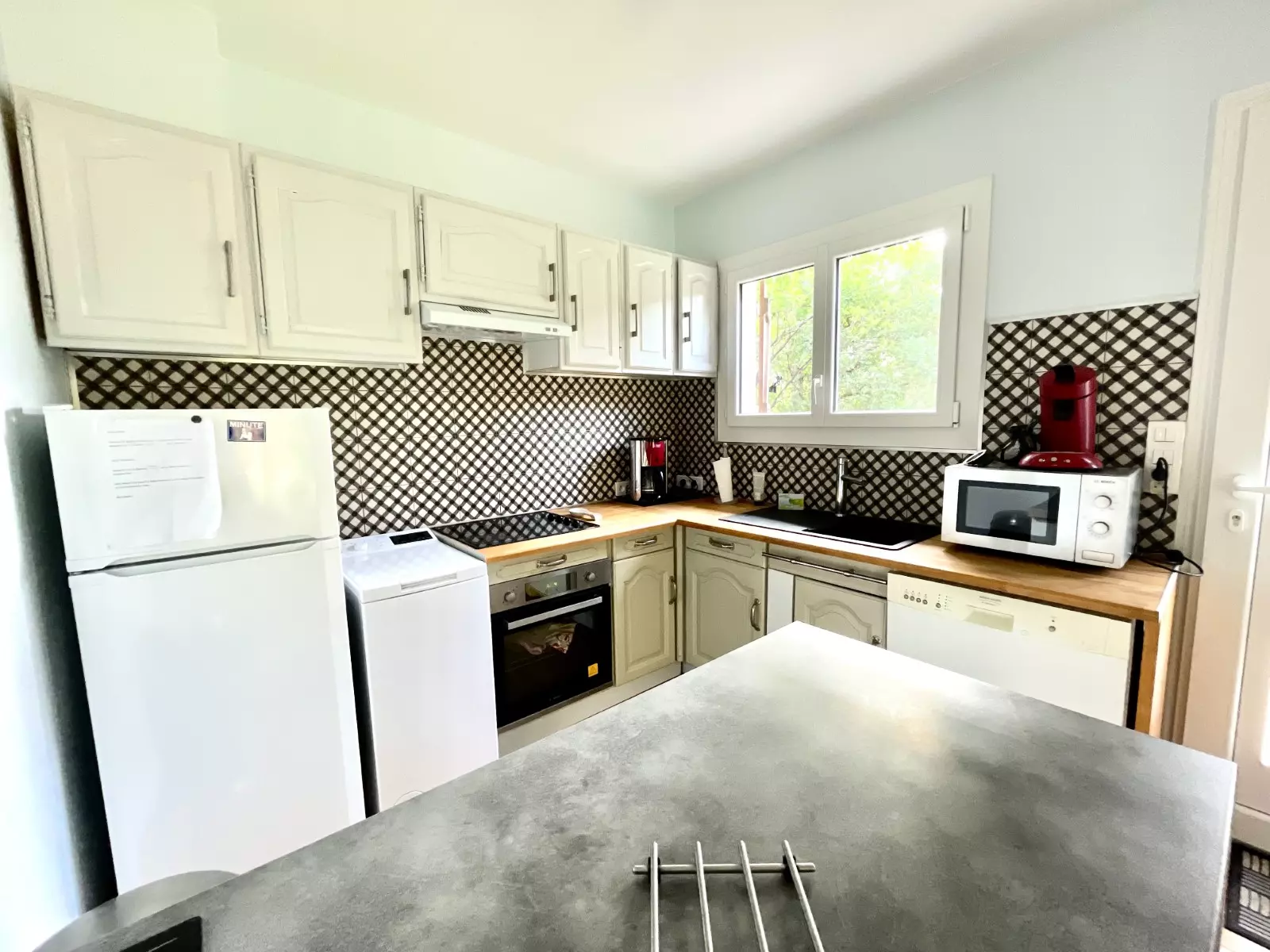 CUISINE : évier - plaques vitro céramiques - four - réfrigérateur/congélateur - lave vaisselle - machine à laver - placards de rangement vaisselle et ustensiles de cuisine - cafetières (senseo et classique) - bouilloire - grille-pain